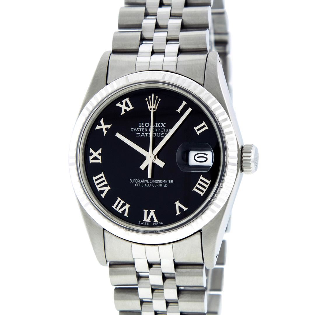 One Mens Pre Owned Stainless Steel Rolex Datejust Polished Bright with Satin Finish, Serviced & Electronically Tested, Rolex Stainless Steel Case: 36mm, Rolex Stainless Steel Crown, Rolex Bezel: 14K White Gold Fluted Bezel. Custom Crystal: New Acrylic With Date Window. Custom Hands: New Lumi Hands. Rolex Movement: Automatic Winding Movement 3035. Custom Dial: Refinish To Black Roman. Date Window: 3 O'Clock Position Date Display, Quickset, Model: Quickset Datejust, Condition: G-6 Extra Fine. Rolex Bracelet: Stainless Steel Jubilee Band. Bright Polish & Satin Finish. 7.0 Inch Length, Adjustable. Standard Clasp, With Rolex Logo. This Watch Has Been Serviced And Polished It Is Free Of All Scratches And Dents.