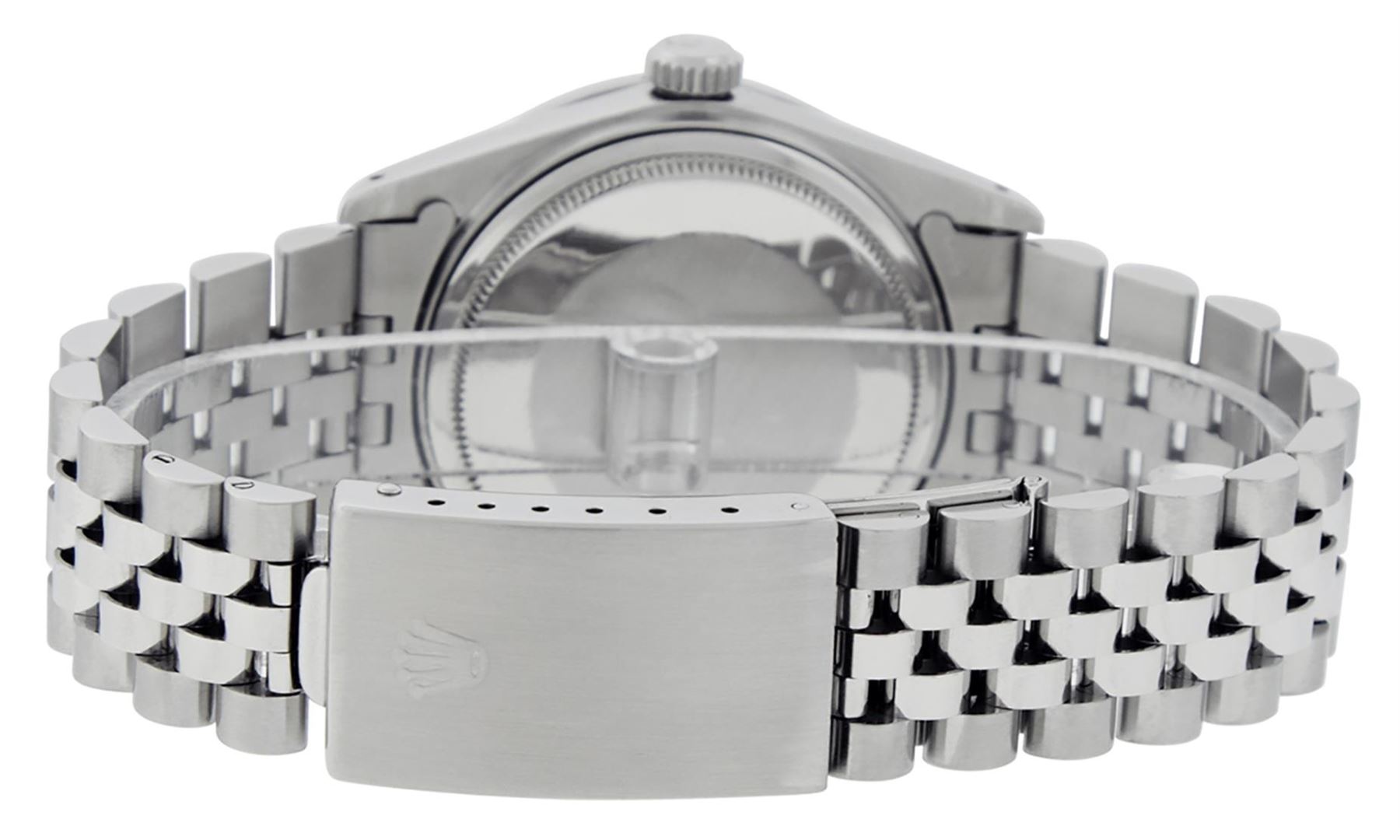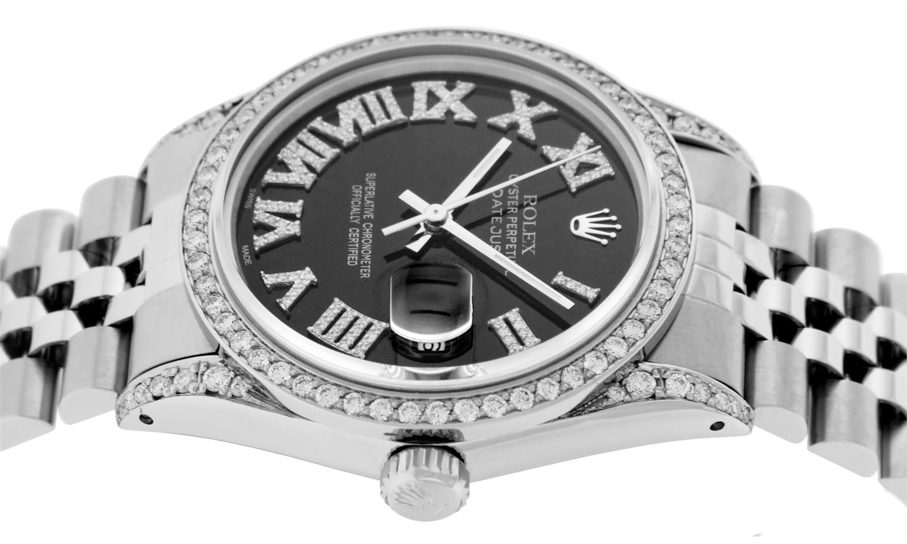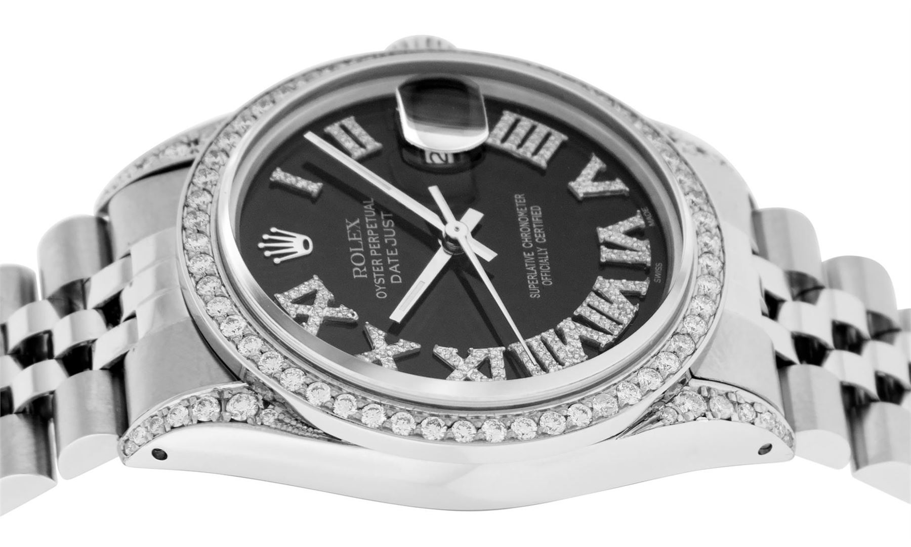 One Mens Stainless Steel Rolex Datejust Polished Bright with Satin Finish, Serviced & Electronically Tested, Stainless Steel Case: 36mm, Diamond Lugs: 24 Diamonds On Lugs, Color: G to H, Clarity: SI-VS. Stainless Steel Crown, New Custom Bezel: Stainless Steel Set Diamond Bezel, Diamond Count: 54 Diamonds On Bezel, Total Weight 1.00 Carat, Clarity: SI-VS, Color: G to H. Custom Crystal: New Scratch Resistant Synthetic Sapphire Cyclops Lens. Movement: Automatic Winding Movement Caliber 3035. Custom Dial: Black Roman Diamond Dial, Diamond Color: G To H In Color, Clarity: SI-VS. Date Window: 3 O'Clock Position Date Display, Quickset, Model: Quickset Datejust, Condition: G-6 Extra Fine. Bracelet: Stainless Steel Jubilee Band. Bright Polish & Satin Finish. 7.0 Inch Length, Adjustable. Standard Clasp, With Rolex Logo. This Watch Has Been Serviced Time Tested And Is In Excellent Condition It Is Free Of All Scratches And Dents.