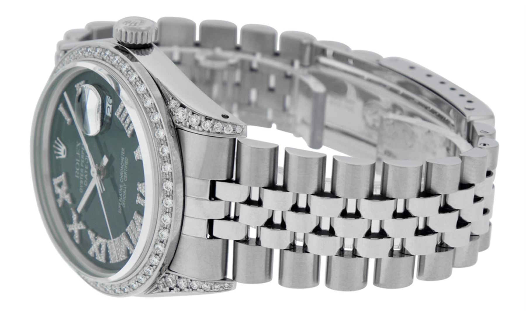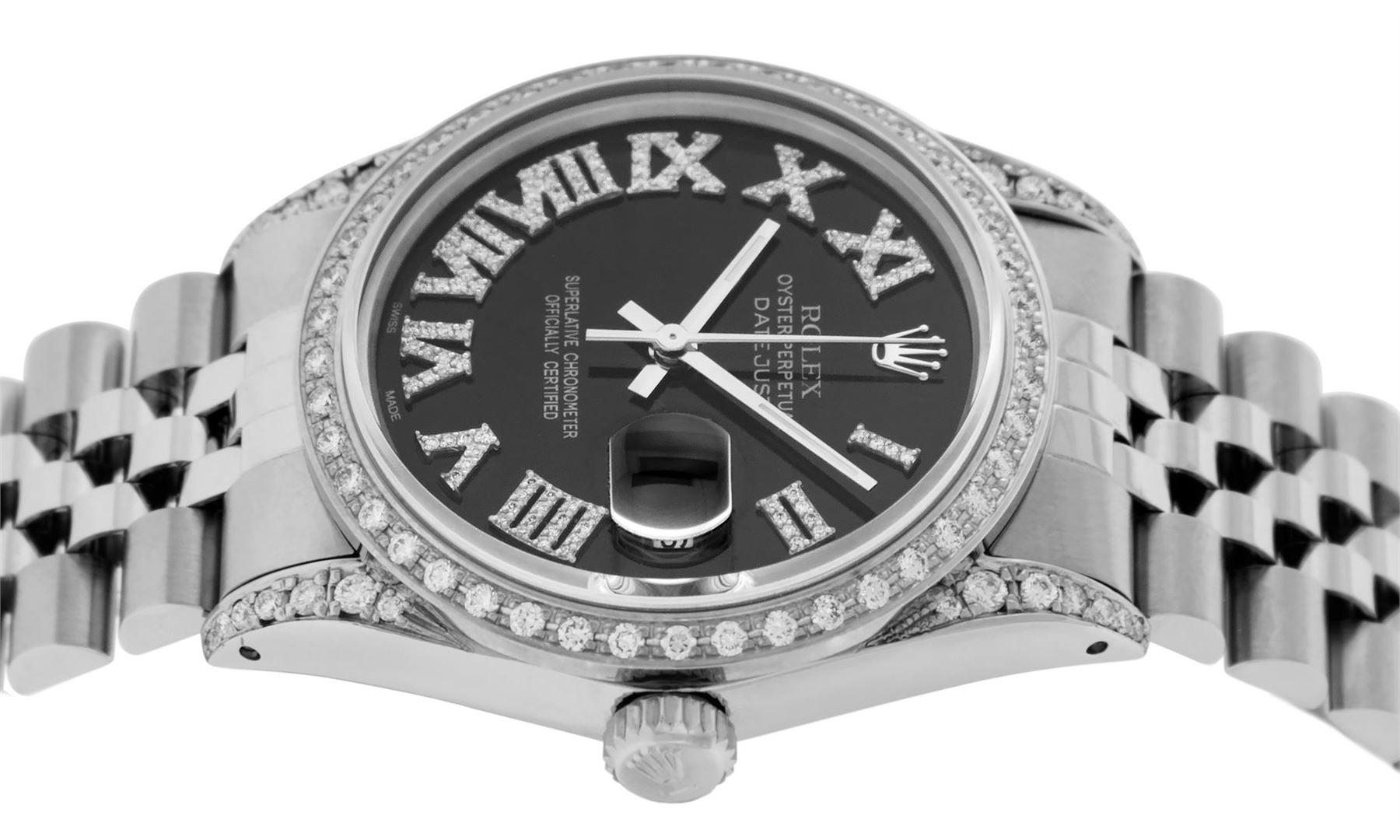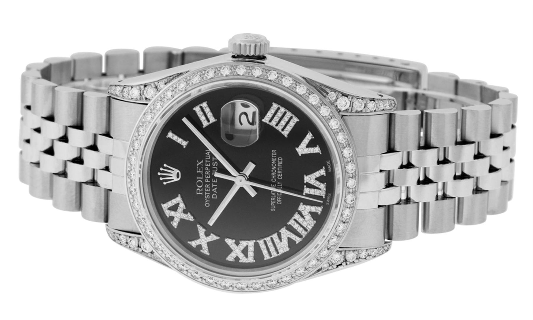 One Mens Stainless Steel Rolex Datejust Polished Bright with Satin Finish, Serviced & Electronically Tested, Stainless Steel Case: 36mm, Diamond Lugs: 24 Diamonds On Lugs, Color: G to H, Clarity: SI-VS. Stainless Steel Crown, New Custom Bezel: 18K White Gold Beadset Diamond Bezel, Diamond Count: 44 Diamonds On Bezel, Total Weight 1.00 Carat, Clarity: SI-VS, Color: G to H. Custom Crystal: New Scratch Resistant Synthetic Sapphire Cyclops Lens. Movement: Automatic Winding Movement Caliber 3035. Custom Dial: Black Roman Diamond Dial, Diamond Color: G To H In Color, Clarity: SI-VS. Date Window: 3 O'Clock Position Date Display, Quickset, Model: Quickset Datejust, Condition: G-6 Extra Fine. Bracelet: Stainless Steel Jubilee Band. Bright Polish & Satin Finish. 7.0 Inch Length, Adjustable. Standard Clasp, With Rolex Logo. This Watch Has Been Serviced Time Tested And Is In Excellent Condition It Is Free Of All Scratches And Dents.