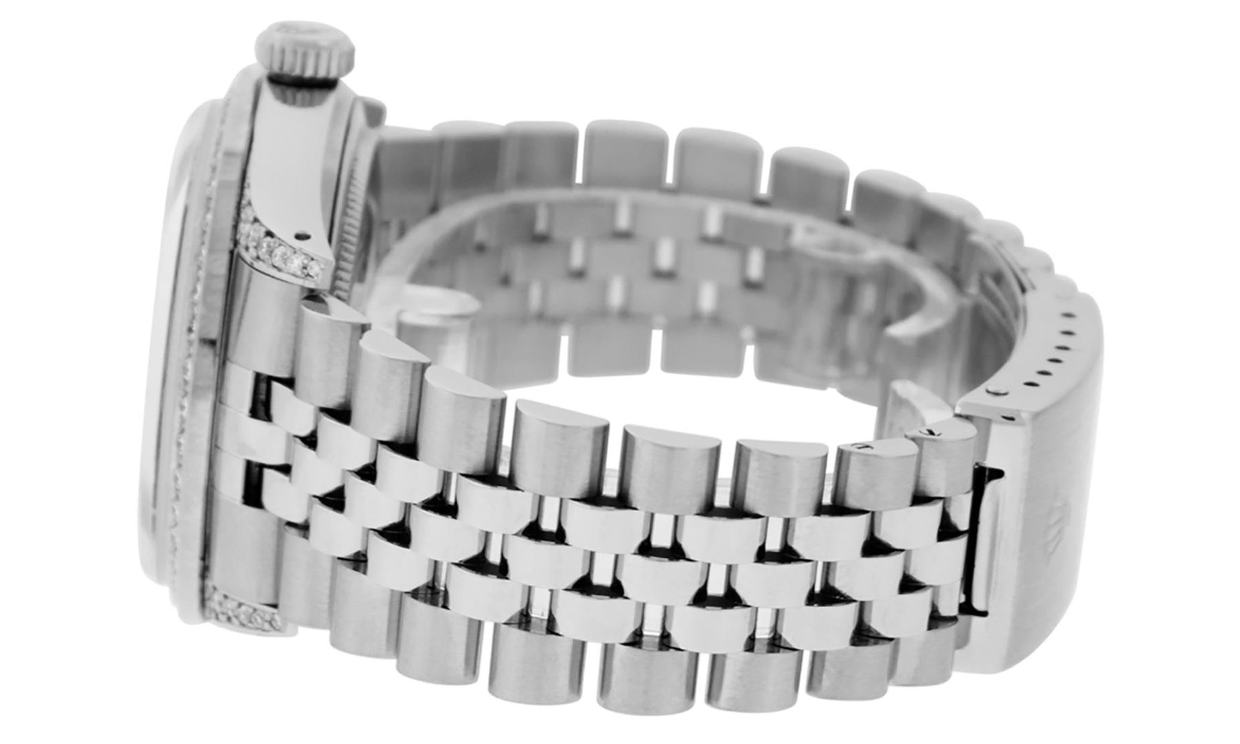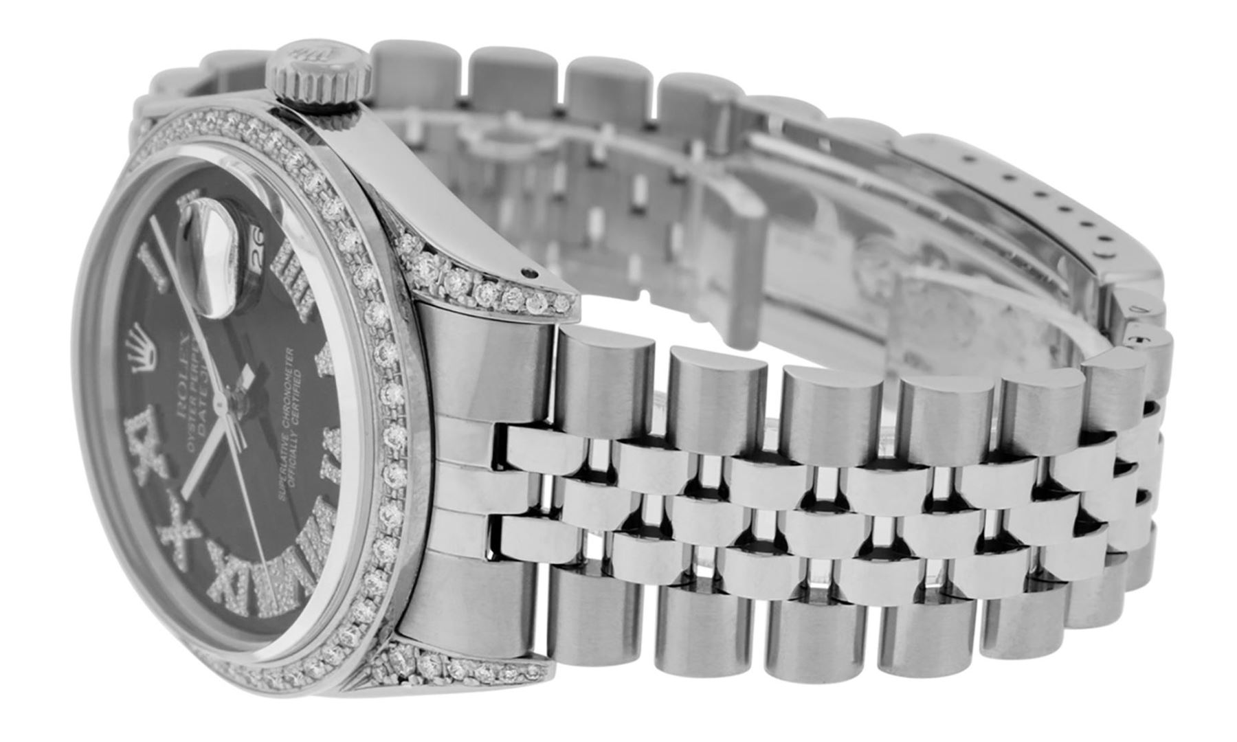 One Mens Pre Owned Stainless Steel Rolex Datejust Polished Bright with Satin Finish, Serviced And Electronically Tested, Rolex Stainless Steel Case: 36mm, Custom Diamond Lugs: 24 Added Diamonds On Lugs. Rolex Stainless Steel Crown, New Custom Bezel: 18K White Gold Beadset Diamond Bezel, Diamond Count: 44 Diamonds On Bezel. Custom Crystal: New Sapphire With Magnified Date Window. Rolex Movement: Automatic Winding Movement 3035. Custom Dial: Custom Black Dial With Added Roman Diamonds. Date Window: 3 O'Clock Position Date Display, Quickset, Model: Quickset Datejust, Condition: G-6 Extra Fine. Rolex Bracelet: Stainless Steel Jubilee Band. Bright Polish And Satin Finish. 7.0 Inch Length, Adjustable. Standard Clasp, With Rolex Logo. This Watch Has Been Serviced Time Tested And Is In Excellent Condition It Is Free Of All Scratches And Dents.