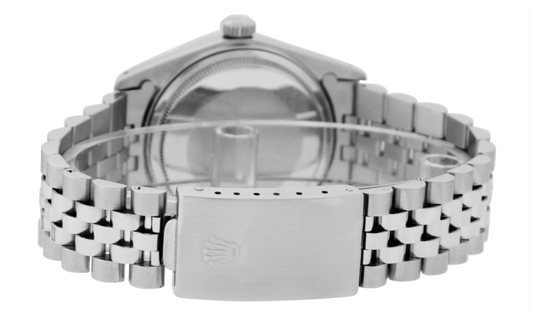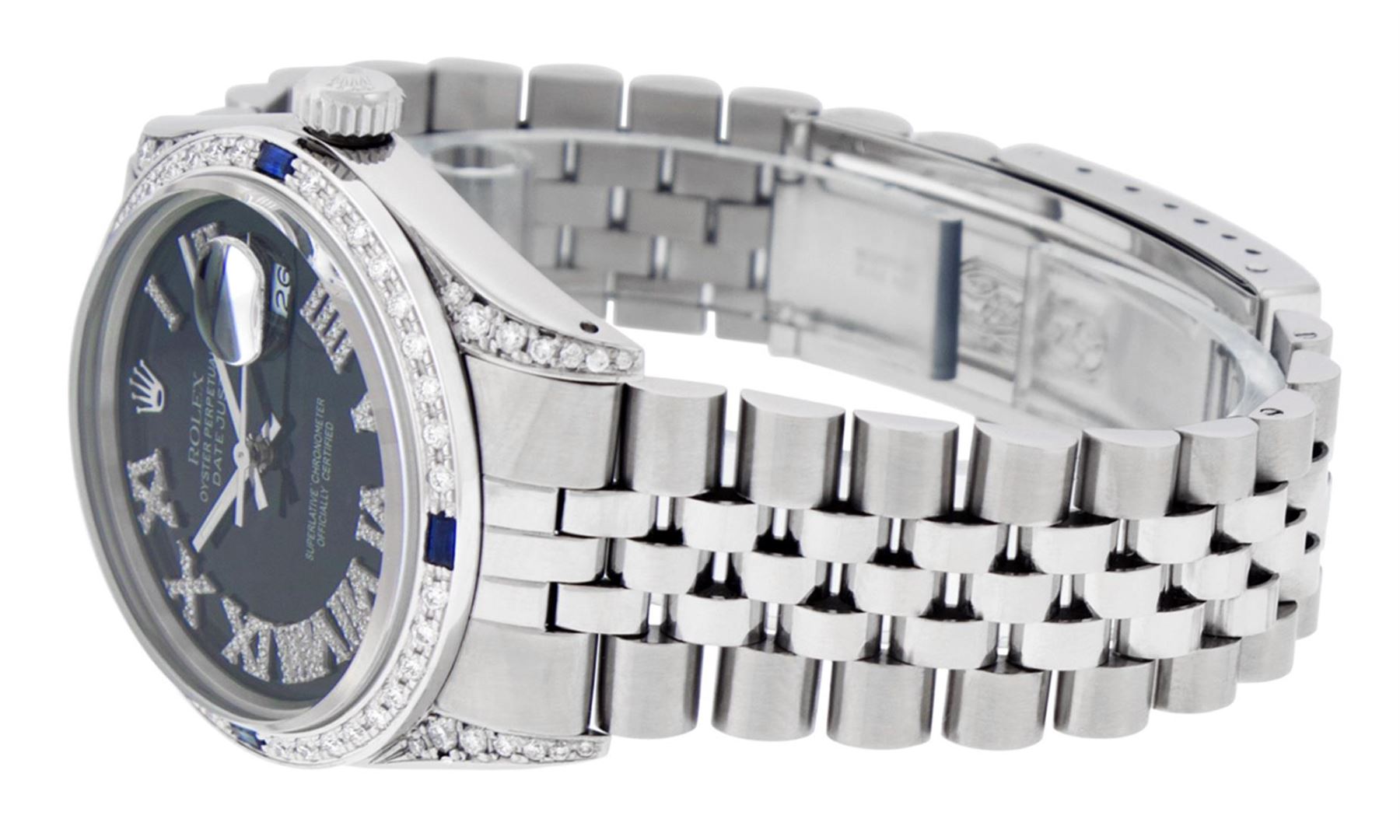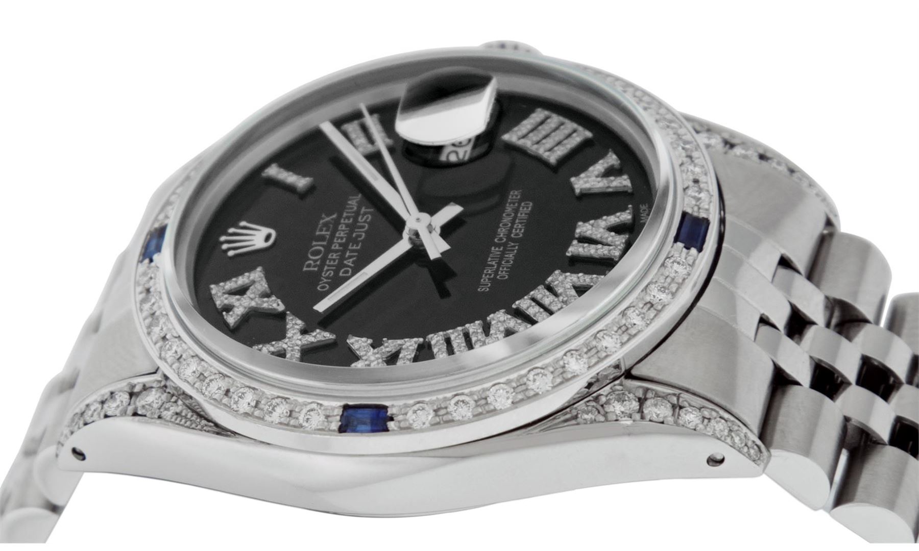 One Mens Stainless Steel Rolex Datejust Polished Bright with Satin Finish, Serviced & Electronically Tested, Stainless Steel Case: 36mm, Diamond Lugs: 24 Diamonds On Lugs, Color: G to H, Clarity: SI-VS. Stainless Steel Crown, New Custom Bezel: 18K White Gold Beadset + Sapphire Diamond Bezel, Diamond Count: 36 Diamonds + 4 Sapphires On Bezel, Total Bezel Weight 1.00 Carat, Clarity: SI-VS, Color: G to H. Custom Crystal: New Scratch Resistant Synthetic Sapphire Cyclops Lens. Movement: Automatic Winding Movement Caliber 3035. Custom Dial: Black Roman Diamond Dial, Diamond Color: G To H In Color, Clarity: SI-VS. Date Window: 3 O'Clock Position Date Display, Quickset, Model: Quickset Datejust, Condition: G-6 Extra Fine. Bracelet: Stainless Steel Jubilee Band. Bright Polish & Satin Finish. 7.0 Inch Length, Adjustable. Standard Clasp, With Rolex Logo. This Watch Has Been Serviced Time Tested And Is In Excellent Condition It Is Free Of All Scratches And Dents.