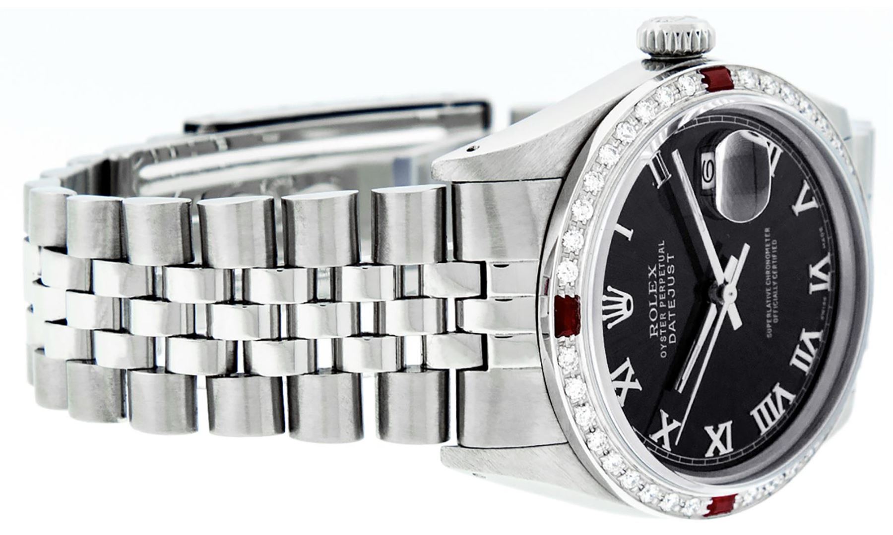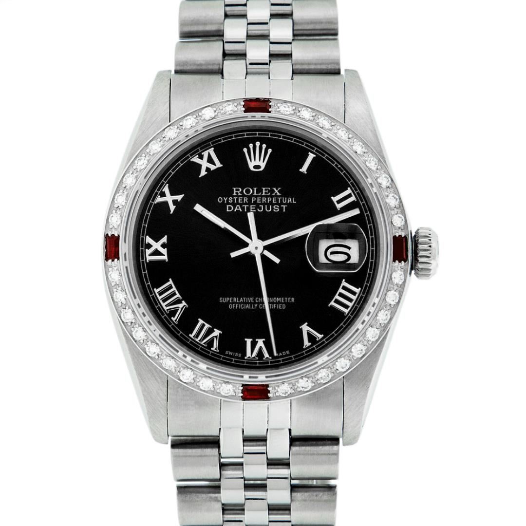 One Mens Pre Owned Stainless Steel Rolex Datejust Polished Bright with Satin Finish, Rolex Stainless Steel Case: 36mm, Rolex Stainless Steel Crown, Custom Bezel: New 18K White Gold Ruby Beadset Diamond Bezel With Added Diamonds And Rubies, Diamond + Gem Count: 36 Diamonds + 4 Rubies, Total Weight 1.00 Carat, Clarity: SI-VS, Color: G to H. Custom Crystal: New Sapphire With Magnified Date Window. Custom Hands: New Luminescent Hands. Rolex Movement: Automatic Winding Movement 3035. Custom Dial: Refinished To Black With Roman Hour Markers With Square Track. Date Window: 3 O'Clock Position Date Display, Quickset, Model: Datejust, Condition: G-6 Extra Fine. Rolex Bracelet: Stainless Steel Jubilee Band. Bracelet: 7.0 Inch Length, Adjustable. Standard Clasp, With Rolex Logo. This Watch Has Been Serviced Time Tested And Is In Excellent Condition It Is Free Of All Scratches And Dents.