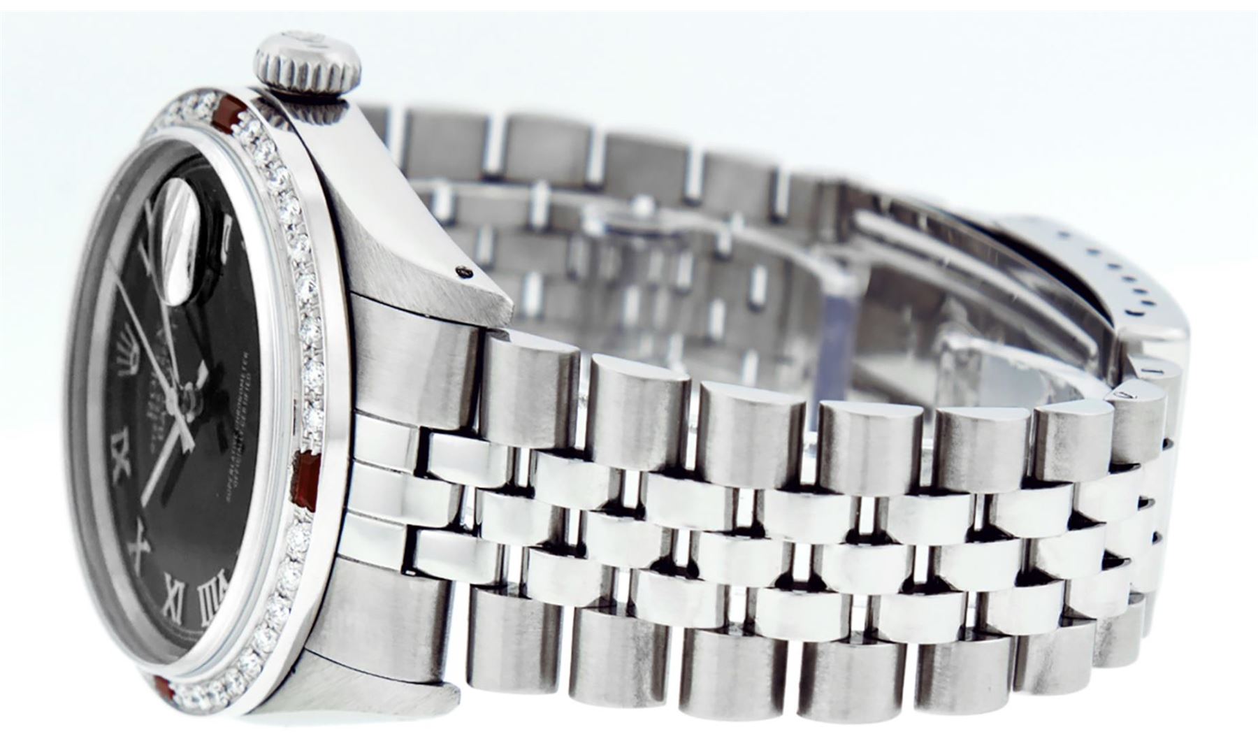 One Mens Pre Owned Stainless Steel Rolex Datejust Polished Bright with Satin Finish, Rolex Stainless Steel Case: 36mm, Rolex Stainless Steel Crown, Custom Bezel: New 18K White Gold Ruby Beadset Diamond Bezel With Added Diamonds And Rubies, Diamond + Gem Count: 36 Diamonds + 4 Rubies, Total Weight 1.00 Carat, Clarity: SI-VS, Color: G to H. Custom Crystal: New Sapphire With Magnified Date Window. Custom Hands: New Luminescent Hands. Rolex Movement: Automatic Winding Movement 3035. Custom Dial: Refinished To Black With Roman Hour Markers With Square Track. Date Window: 3 O'Clock Position Date Display, Quickset, Model: Datejust, Condition: G-6 Extra Fine. Rolex Bracelet: Stainless Steel Jubilee Band. Bracelet: 7.0 Inch Length, Adjustable. Standard Clasp, With Rolex Logo. This Watch Has Been Serviced Time Tested And Is In Excellent Condition It Is Free Of All Scratches And Dents.