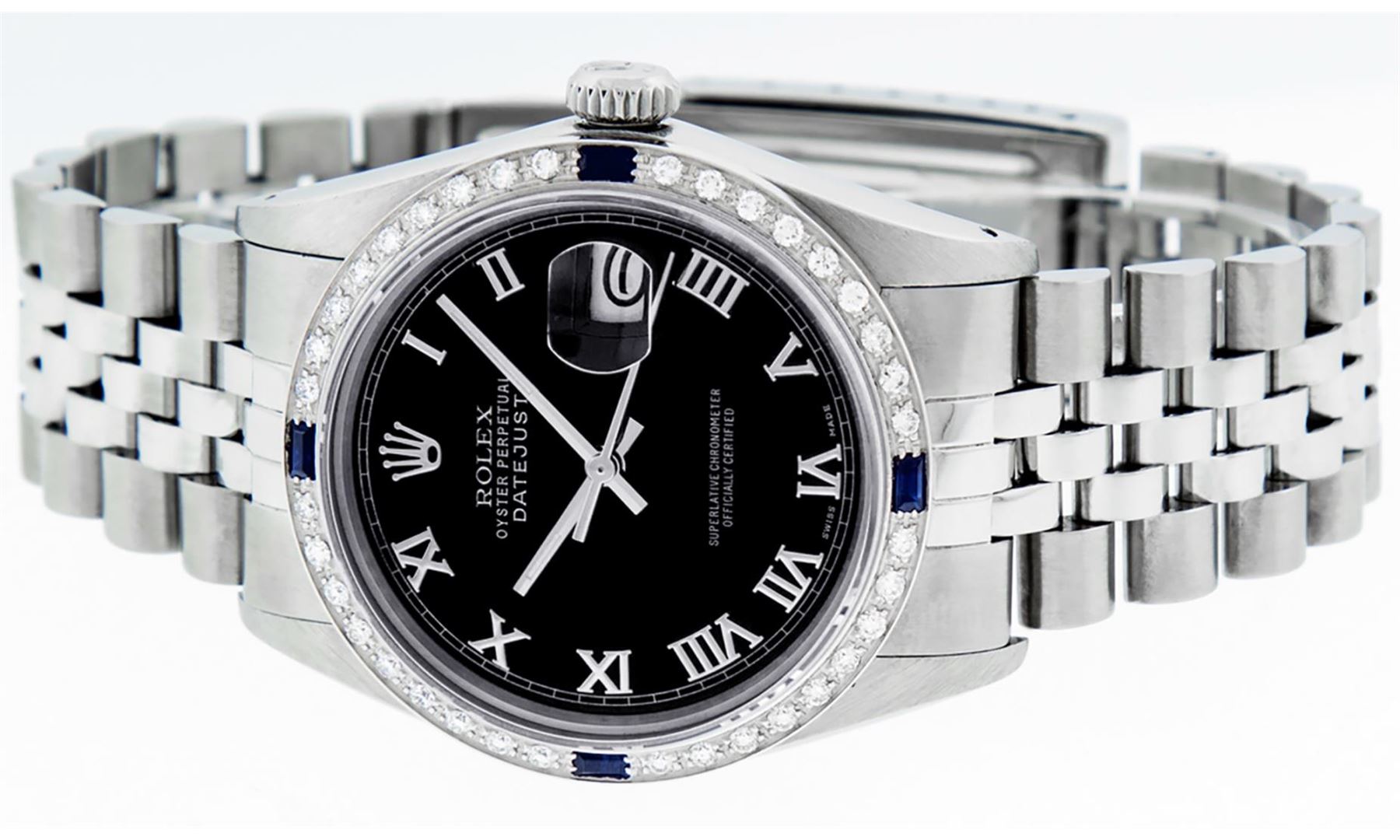 One Mens Pre Owned Stainless Steel Rolex Datejust Polished Bright with Satin Finish, This Watch Has Been Serviced & Electronically Tested, Rolex Stainless Steel Case: 36mm, Rolex Stainless Steel Crown, Custom Bezel: New 18K White Gold Sapphire Beadset Diamond Bezel, Diamond + Gem Count: 36 Diamonds + 4 Sapphires, Total Weight 1.00 Carat, Clarity: SI-VS, Color: G to H. Custom Crystal: New Sapphire With Magnified Date Window. Custom Hands: New Luminescent Hands. Rolex Movement: Automatic Winding Movement 3035. Custom Dial: Refinished To Black With Roman Hour Markers And Dash Track. Date Window: 3 O'Clock Position Date Display, Quickset, Model: Datejust, Condition: G-6 Extra Fine. Rolex Bracelet: Stainless Steel Jubilee Band. Bracelet: 7.0 Inch Length, Adjustable. Standard Clasp, With Rolex Logo. This Watch Has Been Serviced Time Tested And Is In Excellent Condition It Is Free Of All Scratches And Dents.