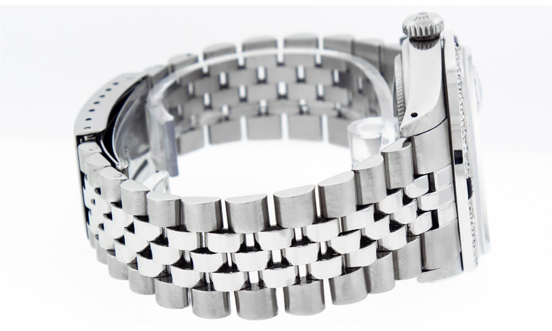 One Mens Pre Owned Stainless Steel Rolex Datejust Polished Bright with Satin Finish, This Watch Has Been Serviced & Electronically Tested, Rolex Stainless Steel Case: 36mm, Rolex Stainless Steel Crown, Custom Bezel: New 18K White Gold Sapphire Beadset Diamond Bezel, Diamond + Gem Count: 36 Diamonds + 4 Sapphires, Total Weight 1.00 Carat, Clarity: SI-VS, Color: G to H. Custom Crystal: New Sapphire With Magnified Date Window. Custom Hands: New Luminescent Hands. Rolex Movement: Automatic Winding Movement 3035. Custom Dial: Refinished To Black With Roman Hour Markers And Dash Track. Date Window: 3 O'Clock Position Date Display, Quickset, Model: Datejust, Condition: G-6 Extra Fine. Rolex Bracelet: Stainless Steel Jubilee Band. Bracelet: 7.0 Inch Length, Adjustable. Standard Clasp, With Rolex Logo. This Watch Has Been Serviced Time Tested And Is In Excellent Condition It Is Free Of All Scratches And Dents.