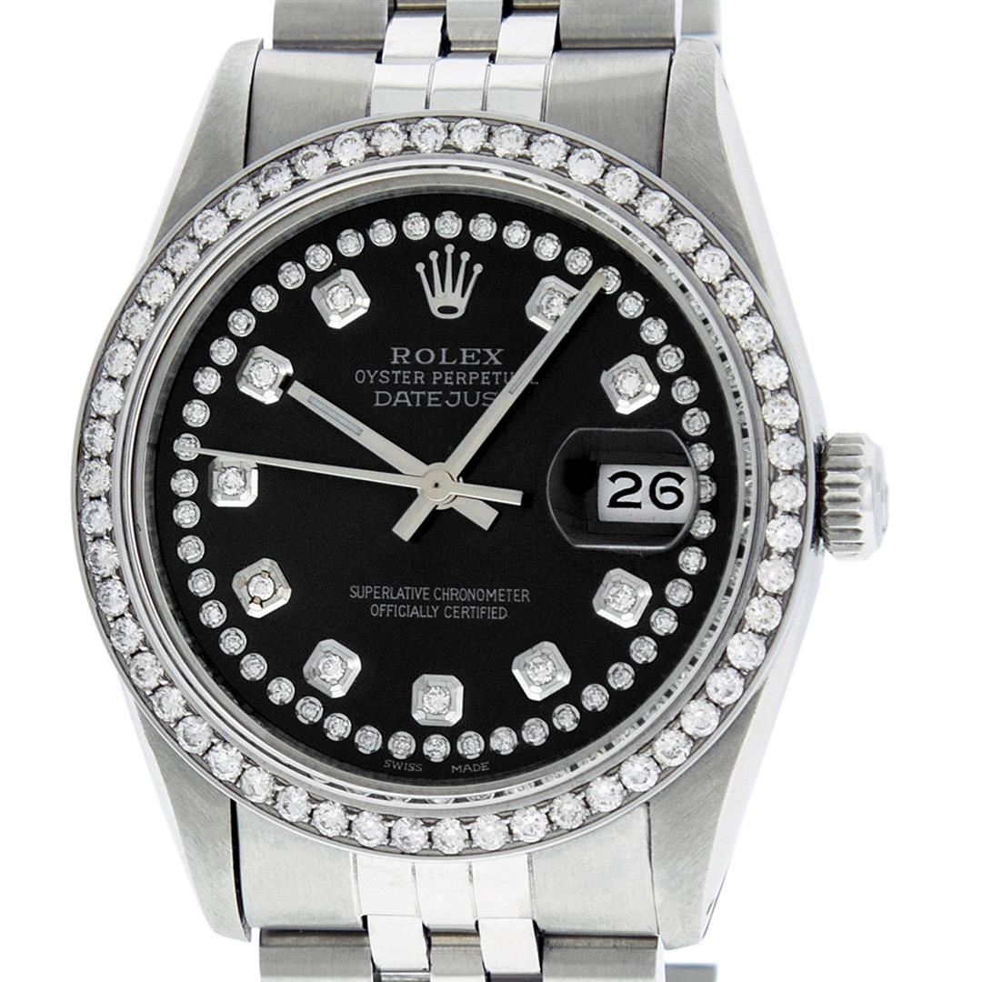One Mens Rolex Stainless Steel Datejust Polished Bright with Satin Finish, This Watch Has Been Serviced & Electronically Tested, Stainless Steel Case: 36mm, Stainless Steel Crown, Custom Bezel: New Stainless Steel Beadset Diamond Bezel, Diamond Count: 54