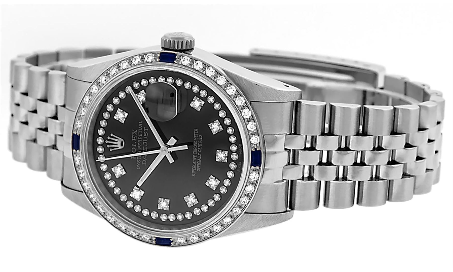 One Mens Stainless Steel Rolex Datejust Polished, Serviced & Electronically Tested, Stainless Steel Case: 36mm, Stainless Steel Crown, Custom Bezel: New 18K White Gold Sapphire Beadset Diamond Bezel, Diamond + Gem Count: 36 Diamonds + 4 Sapphires, Total Weight 1.00 Carat, Clarity: SI-VS, Color: G to H. Custom Crystal: New Scratch Resistant Synthetic Sapphire Cyclops Lens. Custom Hands: New Luminescent Hands. Movement: Automatic Winding Movement Caliber 3035. Custom Dial: Black String Diamond Dial, Diamond Count: 58 Diamonds in Dial, G To H In Color, Clarity: SI-VS. Date Window: 3 O'Clock Position Date Display, Quickset, Model: Datejust. Condition: G-6 Extra Fine. Bracelet: Stainless Steel Jubilee Band. Bright Polish & Satin Finish. 7.0 Inch Length, Adjustable. Standard Clasp, With Rolex Logo. This Watch Has Been Serviced Time Tested And Is In Excellent Condition It Is Free Of All Scratches And Dents.
