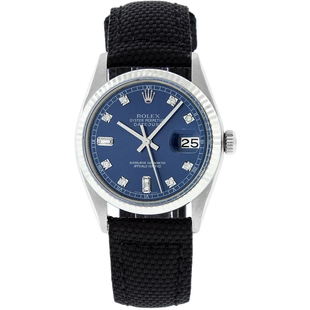 One Mens Stainless Steel Rolex Datejust Polished Bright with Satin Finish, This Watch Has Been Serviced & Electronically Tested, Stainless Steel Case: 36mm, Stainless Steel Crown, Bezel: 14K White Gold Fluted Bezel. Custom Crystal: New Acrylic Cyclops Lens. Custom Hands: New Luminescent Hands. Movement: Automatic Winding Movement Caliber 3035. Custom Dial: Blue Diamond Dial With Diamond Hour Markers And Roman Track, Diamond Count: 8 Diamonds + 2 Diamond Baguettes in Dial, G To H In Color, SI-VS Clarity. Date Window: 3 O'Clock Position Date Display, Quickset, Model: Datejust, Condition: G-6 Extra Fine. Custom Band: Black Nylon Strap. 7.5 Inch Length. This Watch Has Been Serviced Time Tested And Is In Excellent Condition It Is Free Of All Scratches And Dents.
