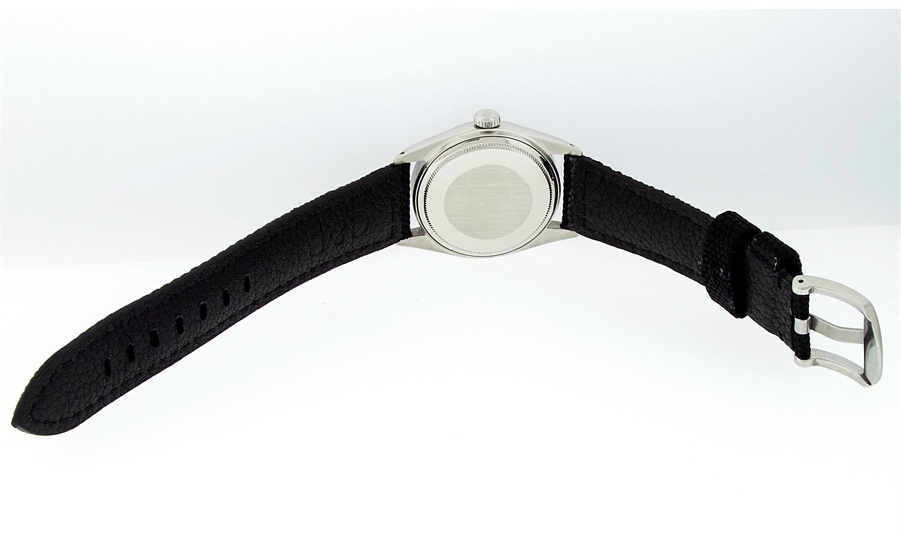One Mens Stainless Steel Rolex Datejust Polished Bright with Satin Finish, This Watch Has Been Serviced & Electronically Tested, Stainless Steel Case: 36mm, Stainless Steel Crown, Bezel: 14K White Gold Fluted Bezel. Custom Crystal: New Acrylic Cyclops Lens. Custom Hands: New Luminescent Hands. Movement: Automatic Winding Movement Caliber 3035. Custom Dial: Blue Diamond Dial With Diamond Hour Markers And Roman Track, Diamond Count: 8 Diamonds + 2 Diamond Baguettes in Dial, G To H In Color, SI-VS Clarity. Date Window: 3 O'Clock Position Date Display, Quickset, Model: Datejust, Condition: G-6 Extra Fine. Custom Band: Black Nylon Strap. 7.5 Inch Length. This Watch Has Been Serviced Time Tested And Is In Excellent Condition It Is Free Of All Scratches And Dents.