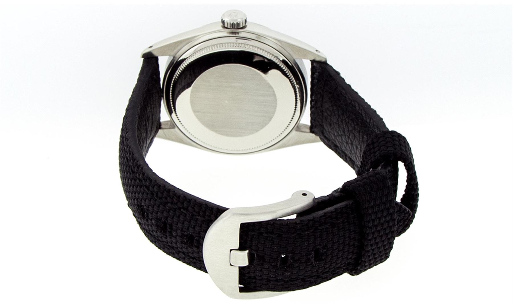 One Mens Stainless Steel Rolex Datejust Polished Bright with Satin Finish, This Watch Has Been Serviced & Electronically Tested, Stainless Steel Case: 36mm, Stainless Steel Crown, Bezel: 14K White Gold Fluted Bezel. Custom Crystal: New Acrylic Cyclops Lens. Custom Hands: New Luminescent Hands. Movement: Automatic Winding Movement Caliber 3035. Custom Dial: Blue Diamond Dial With Diamond Hour Markers And Roman Track, Diamond Count: 8 Diamonds + 2 Diamond Baguettes in Dial, G To H In Color, SI-VS Clarity. Date Window: 3 O'Clock Position Date Display, Quickset, Model: Datejust, Condition: G-6 Extra Fine. Custom Band: Black Nylon Strap. 7.5 Inch Length. This Watch Has Been Serviced Time Tested And Is In Excellent Condition It Is Free Of All Scratches And Dents.