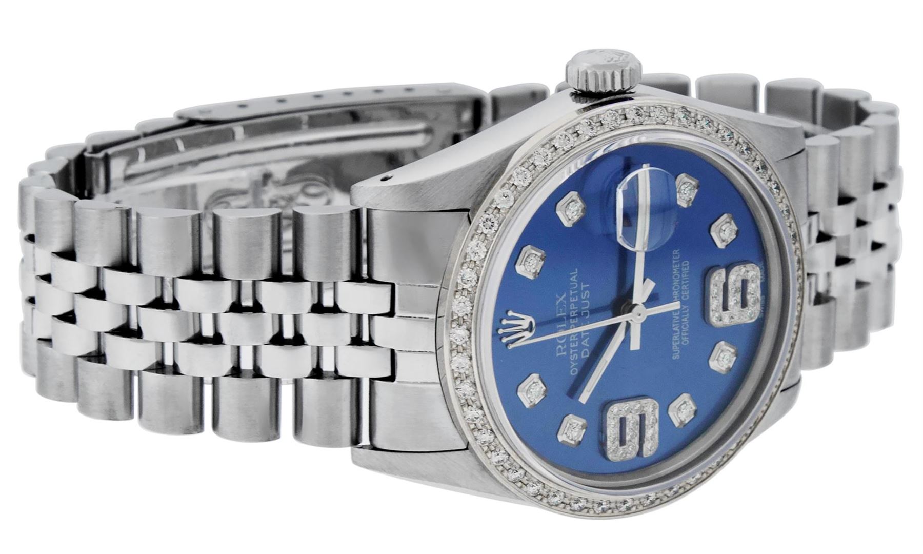 One Mens Stainless Steel Rolex Datejust Polished, Serviced & Electronically Tested, Stainless Steel Case: 36mm, Stainless Steel Crown, Custom Bezel: New 18K White Gold Beadset Diamond Bezel, Diamond Count: 44 Diamonds, Total Weight 1.00 Carat, Clarity: SI-VS, Color: G to H. Custom Crystal: New Scratch Resistant Synthetic Sapphire Cyclops Lens. Custom Hands: New Luminescent Hands. Movement: Automatic Winding Movement Caliber 3035. Custom Dial: Blue Diamond Dial with 9 & 6 Diamond Hour Markers, Diamond Count: 8 Diamonds + 28 Diamonds On 6 & 9 Hour Markers, G To H In Color, Clarity: SI-VS. Date Window: 3 O'Clock Position Date Display, Quickset, Model: Datejust. Condition: G-6 Extra Fine. Bracelet: Stainless Steel Jubilee Band. Bright Polish & Satin Finish. 7.0 Inch Length, Adjustable. Standard Clasp, With Rolex Logo. This Watch Has Been Serviced Time Tested And Is In Excellent Condition It Is Free Of All Scratches And Dents.