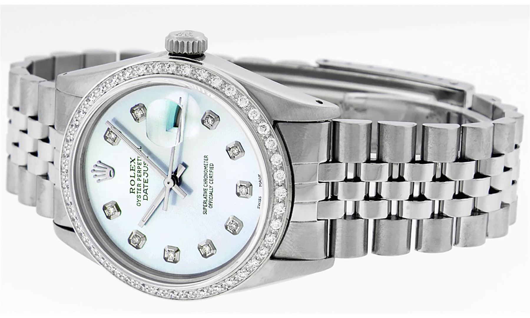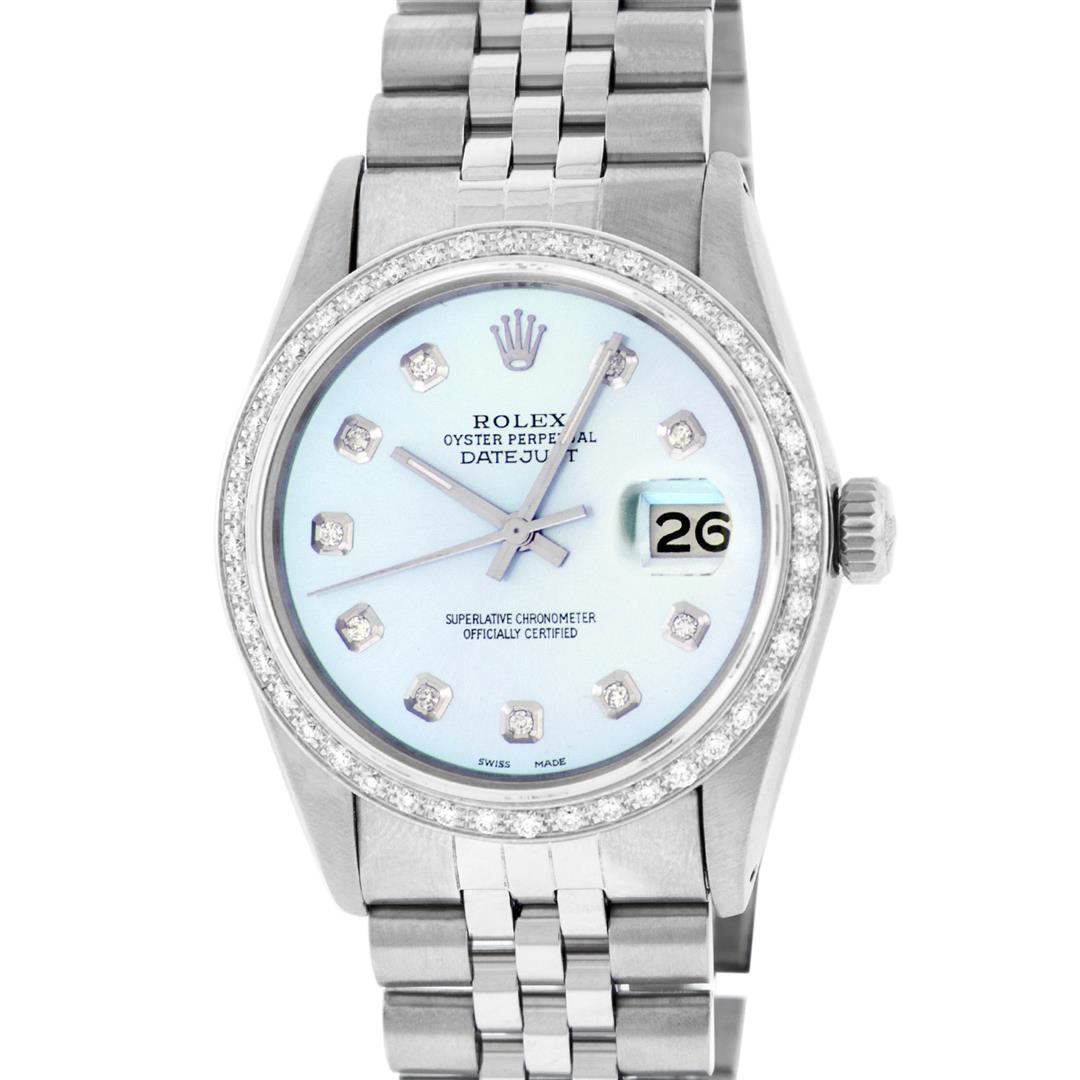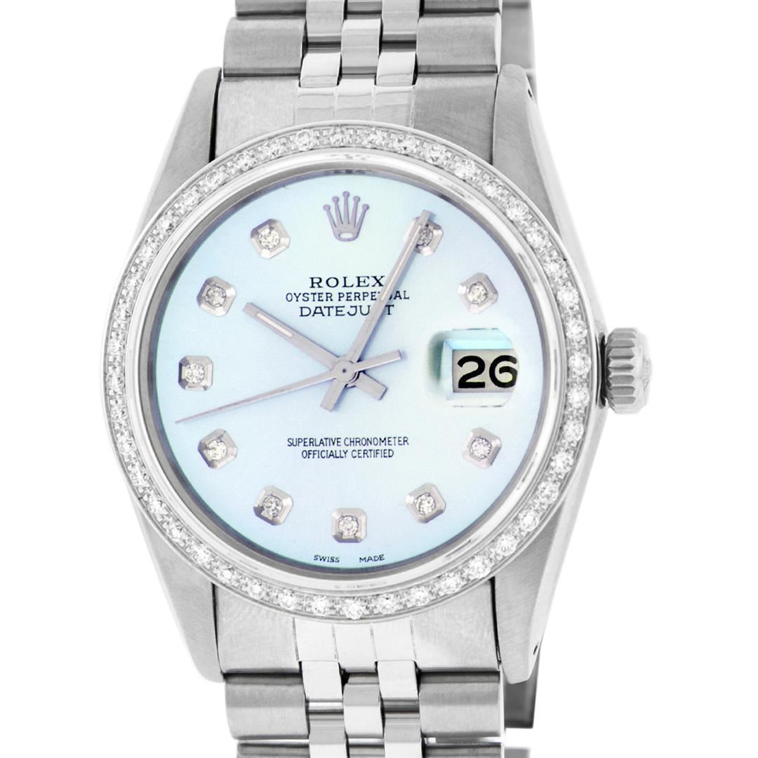 One Mens Stainless Steel Rolex Datejust Polished, Serviced & Electronically Tested, Stainless Steel Case: 36mm, Stainless Steel Crown, Custom Bezel: New 18K White Gold Beadset Diamond Bezel, Diamond Count: 44 Diamonds In Bezel, Total Weight 1.00 Carat, Clarity: SI-VS, Color: G to H. Custom Crystal: New Scratch Resistant Synthetic Sapphire Cyclops Lens. Custom Hands: New Luminescent Hands. Movement: Automatic Winding Movement Caliber 3035. Custom Dial: Blue Diamond Dial, Diamond Count: 10 Diamonds in Dial, G To H In Color, Clarity: SI-VS. Date Window: 3 O'Clock Position Date Display, Quickset, Model: Datejust. Condition: G-6 Extra Fine. Bracelet: Stainless Steel Jubilee Band. Bright Polish & Satin Finish. 7.0 Inch Length, Adjustable. Standard Clasp, With Rolex Logo. This Watch Has Been Serviced Time Tested And Is In Excellent Condition It Is Free Of All Scratches And Dents.