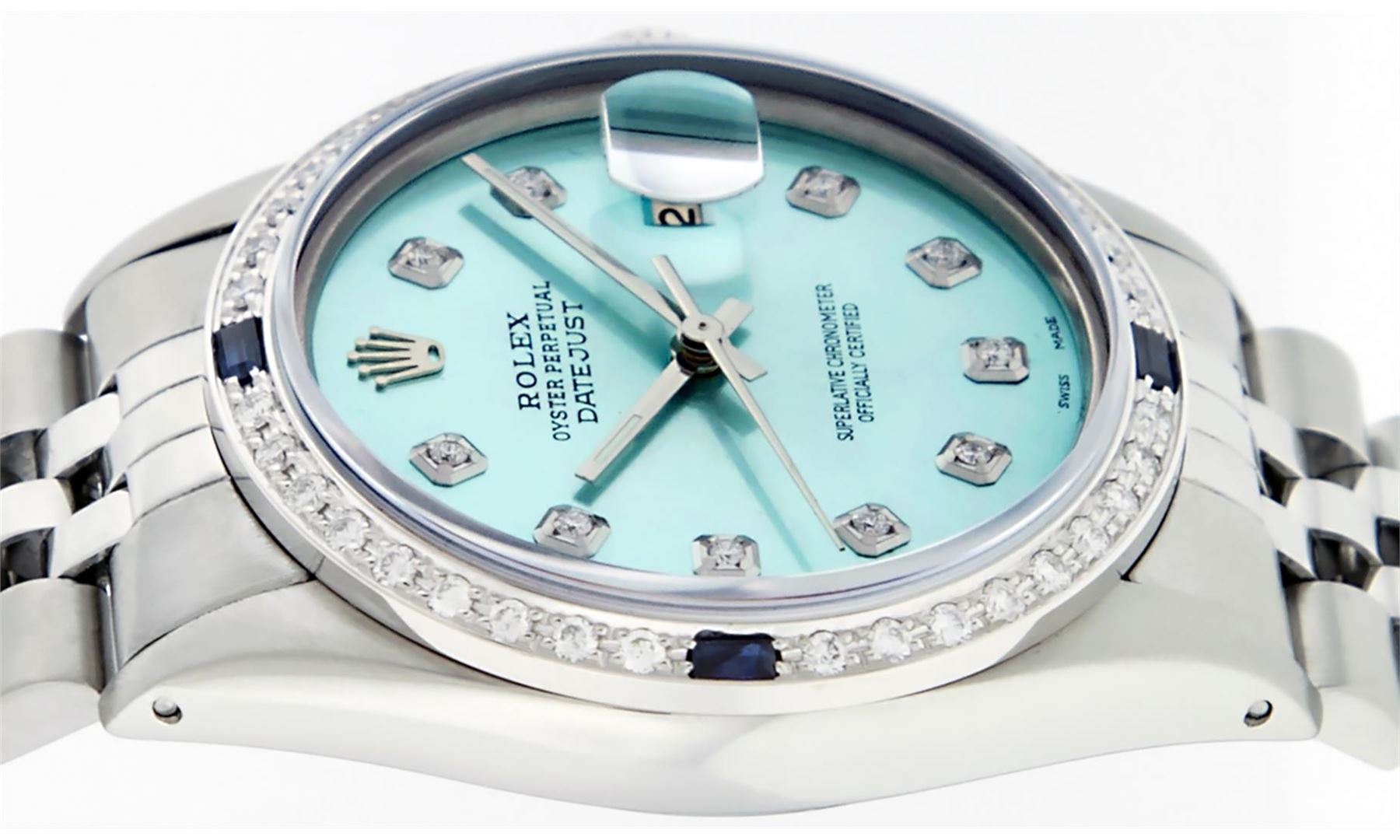 One Mens Stainless Steel Rolex Datejust Polished, Serviced & Electronically Tested, Stainless Steel Case: 36mm, Stainless Steel Crown, Custom Bezel: New 18K White Gold Sapphire Beadset Diamond Bezel, Diamond + Gem Count: 36 Diamonds + 4 Sapphires, Total Weight 1.00 Carat, Clarity: SI-VS, Color: G to H. Custom Crystal: New Scratch Resistant Synthetic Sapphire Cyclops Lens. Custom Hands: New Luminescent Hands. Movement: Automatic Winding Movement Caliber 3035. Custom Dial: Ice Blue With Diamond Hour Markers, 10 Diamond Dial, G To H In Color, Clarity: SI-VS. Date Window: 3 O'Clock Position Date Display, Quickset, Model: Datejust. Condition: G-6 Extra Fine. Bracelet: Stainless Steel Jubilee Band. Bright Polish & Satin Finish. 7.0 Inch Length, Adjustable. Standard Clasp, With Rolex Logo. This Watch Has Been Serviced Time Tested And Is In Excellent Condition It Is Free Of All Scratches And Dents