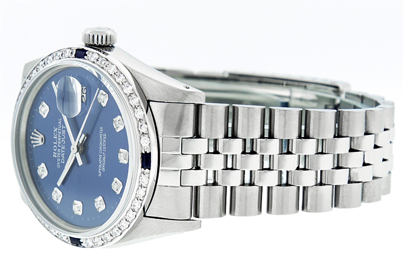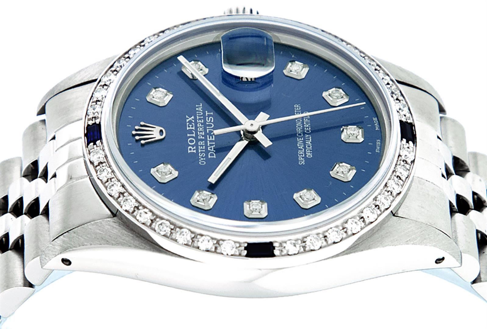 One Mens Stainless Steel Rolex Datejust Polished, Serviced & Electronically Tested, Stainless Steel Case: 36mm, Stainless Steel Crown, Custom Bezel: New 18K White Gold Sapphire Beadset Diamond Bezel, Diamond + Gem Count: 36 Diamonds + 4 Sapphires, Total Weight 1.00 Carat, Clarity: SI-VS, Color: G to H. Custom Crystal: New Scratch Resistant Synthetic Sapphire Cyclops Lens. Custom Hands: New Luminescent Hands. Movement: Automatic Winding Movement Caliber 3035. Custom Dial: Blue With Diamond Hour Markers & Dash Track, 10 Diamonds in Dial, G To H In Color, Clarity: SI-VS. Date Window: 3 O'Clock Position Date Display, Quickset, Model: Datejust. Condition: G-6 Extra Fine. Bracelet: Stainless Steel Jubilee Band. Bright Polish & Satin Finish. 7.0 Inch Length, Adjustable. Standard Clasp, With Rolex Logo. This Watch Has Been Serviced Time Tested And Is In Excellent Condition It Is Free Of All Scratches And Dents