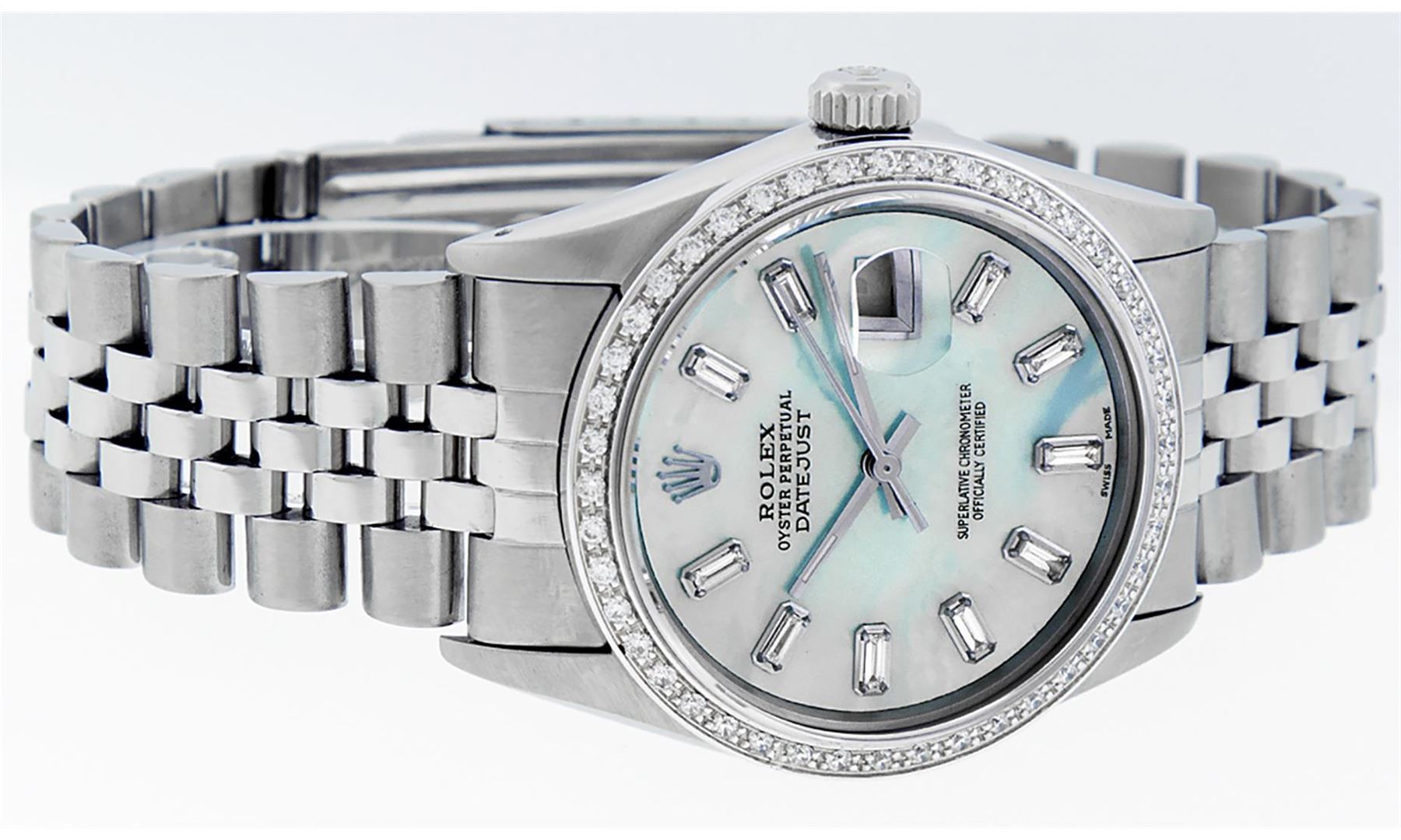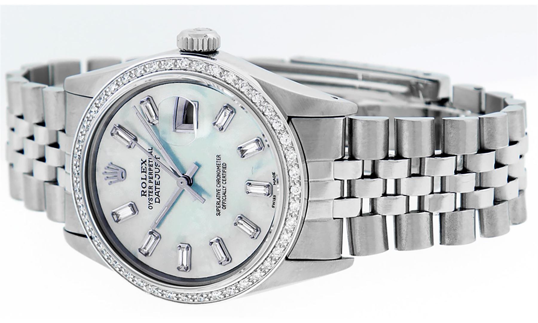 One Mens Rolex Stainless Steel Datejust Polished Bright with Satin Finish, This Watch Has Been Serviced & Electronically Tested, Stainless Steel Case: 36mm, Stainless Steel Crown, Custom Bezel: New 18K White Gold Beadset Diamond Bezel, Diamond Count: 44 Diamonds In Bezel, Total Weight 1.00 Carat, Clarity: SI-VS, Color: G to H. Custom Crystal: New Scratch Resistant Synthetic Sapphire Cyclops Lens. Custom Hands: New Luminescent Hands. Movement: Automatic Winding Movement Caliber 3035. Custom Dial: Blue Mother Of Pearl Diamond Dial, Diamond Count: 10 Baguette Diamonds On Dial, Color: G to H, Clarity: VS2-SI1. Date Window: 3 O'Clock Position Date Display, Quickset, Model: Datejust. Condition: G-6 Extra Fine. Bracelet: Stainless Steel Jubilee Band. Bright Polish & Satin Finish. 7.0 Inch Length, Adjustable. Standard Clasp, With Rolex Logo. This Watch Has Been Serviced Time Tested And Is In Excellent Condition It Is Free Of All Scratches And Dents.