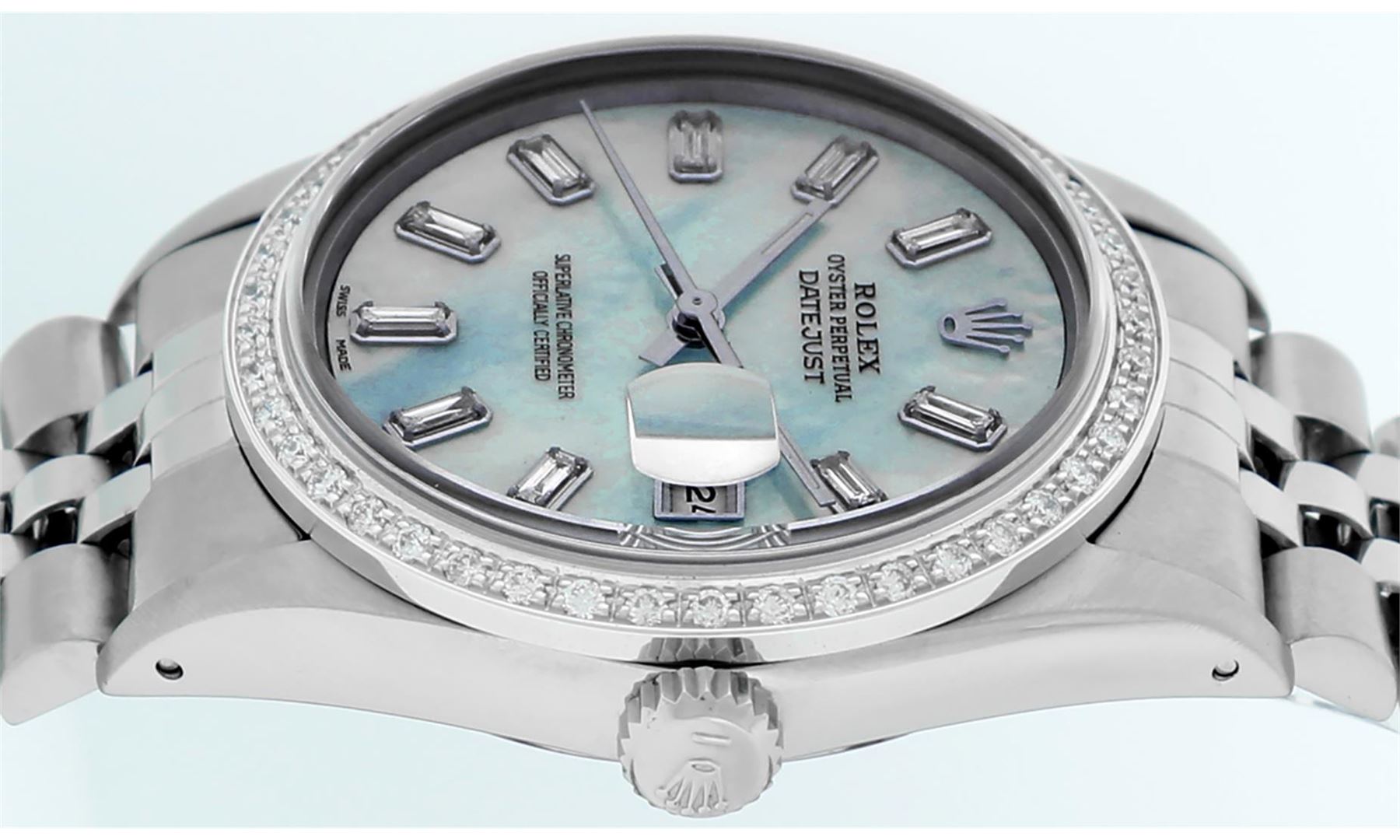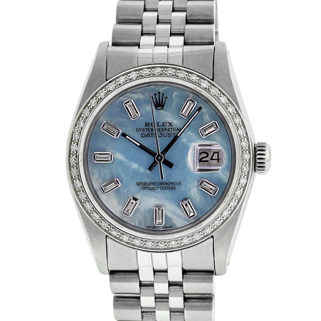 One Mens Rolex Stainless Steel Datejust Polished Bright with Satin Finish, This Watch Has Been Serviced & Electronically Tested, Stainless Steel Case: 36mm, Stainless Steel Crown, Custom Bezel: New 18K White Gold Beadset Diamond Bezel, Diamond Count: 44 Diamonds In Bezel, Total Weight 1.00 Carat, Clarity: SI-VS, Color: G to H. Custom Crystal: New Scratch Resistant Synthetic Sapphire Cyclops Lens. Custom Hands: New Luminescent Hands. Movement: Automatic Winding Movement Caliber 3035. Custom Dial: Blue Mother Of Pearl Diamond Dial, Diamond Count: 10 Baguette Diamonds On Dial, Color: G to H, Clarity: VS2-SI1. Date Window: 3 O'Clock Position Date Display, Quickset, Model: Datejust. Condition: G-6 Extra Fine. Bracelet: Stainless Steel Jubilee Band. Bright Polish & Satin Finish. 7.0 Inch Length, Adjustable. Standard Clasp, With Rolex Logo. This Watch Has Been Serviced Time Tested And Is In Excellent Condition It Is Free Of All Scratches And Dents.