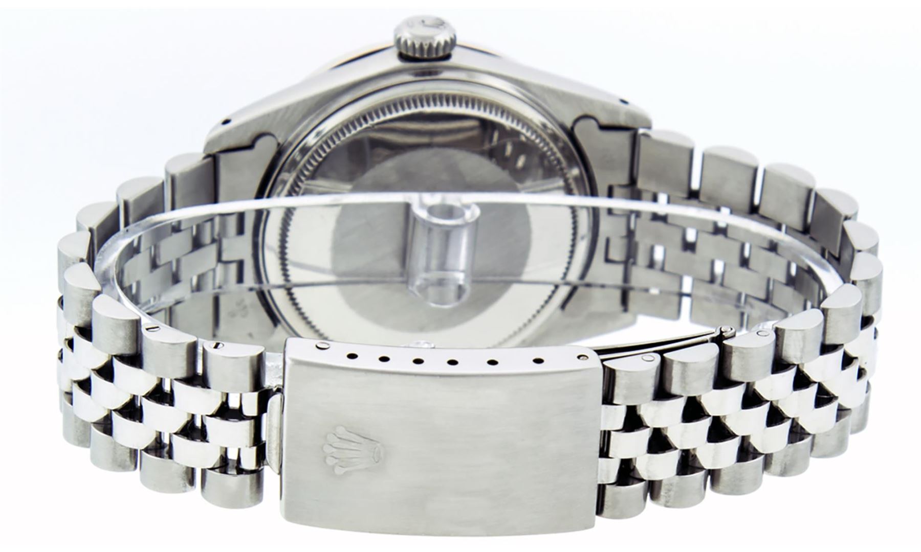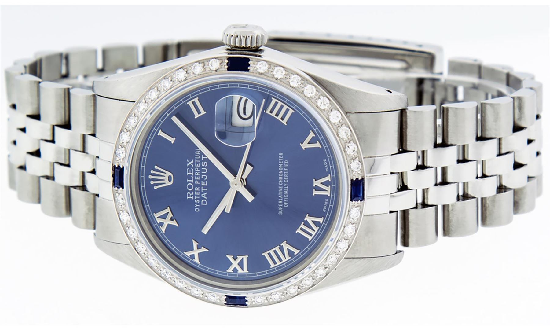 One Mens Stainless Steel Rolex Datejust Polished Bright with Satin Finish, This Watch Has Been Serviced & Electronically Tested, Stainless Steel Case: 36mm, Stainless Steel Crown, Custom Bezel: New 18K White Gold Sapphire Beadset Diamond Bezel, Diamond + Gem Count: 36 Diamonds + 4 Sapphires. Custom Crystal: New Sapphire With Magnified Date Window. Custom Hands: New Luminescent Hands. Rolex Movement: Automatic Winding Movement 3035. Custom Dial: Blue Roman With Square Track. Date Window: 3 O'clock Position Date Display, Quickset, Model: Quickset Datejust, Condition: G-6 Extra Fine. Bracelet: Stainless Steel Jubilee Band. Bracelet: 7.0 Inch Length, Adjustable. Standard Clasp, With Rolex Logo. This Watch Has Been Serviced Time Tested And Is In Excellent Condition It Is Free Of All Scratches And Dents.