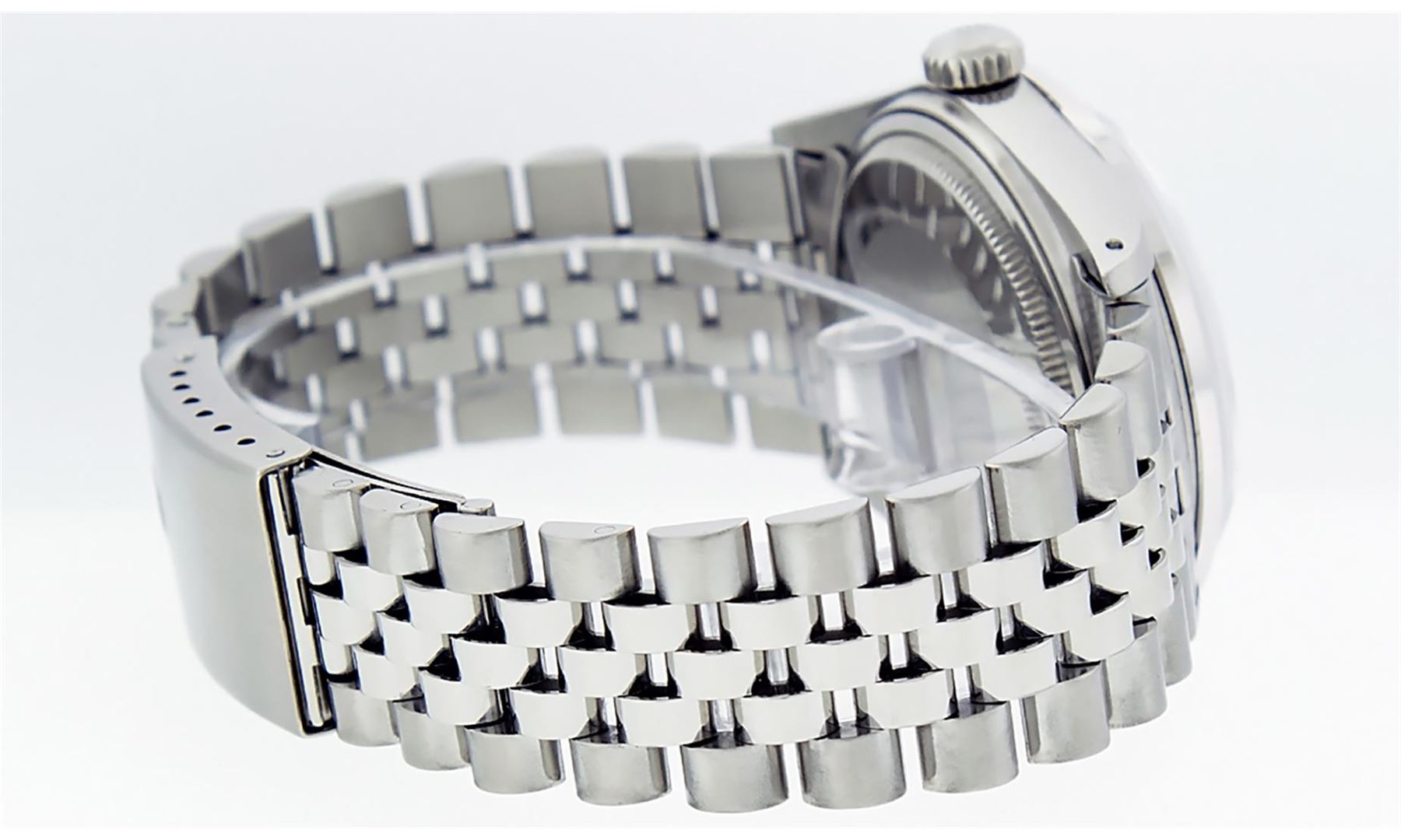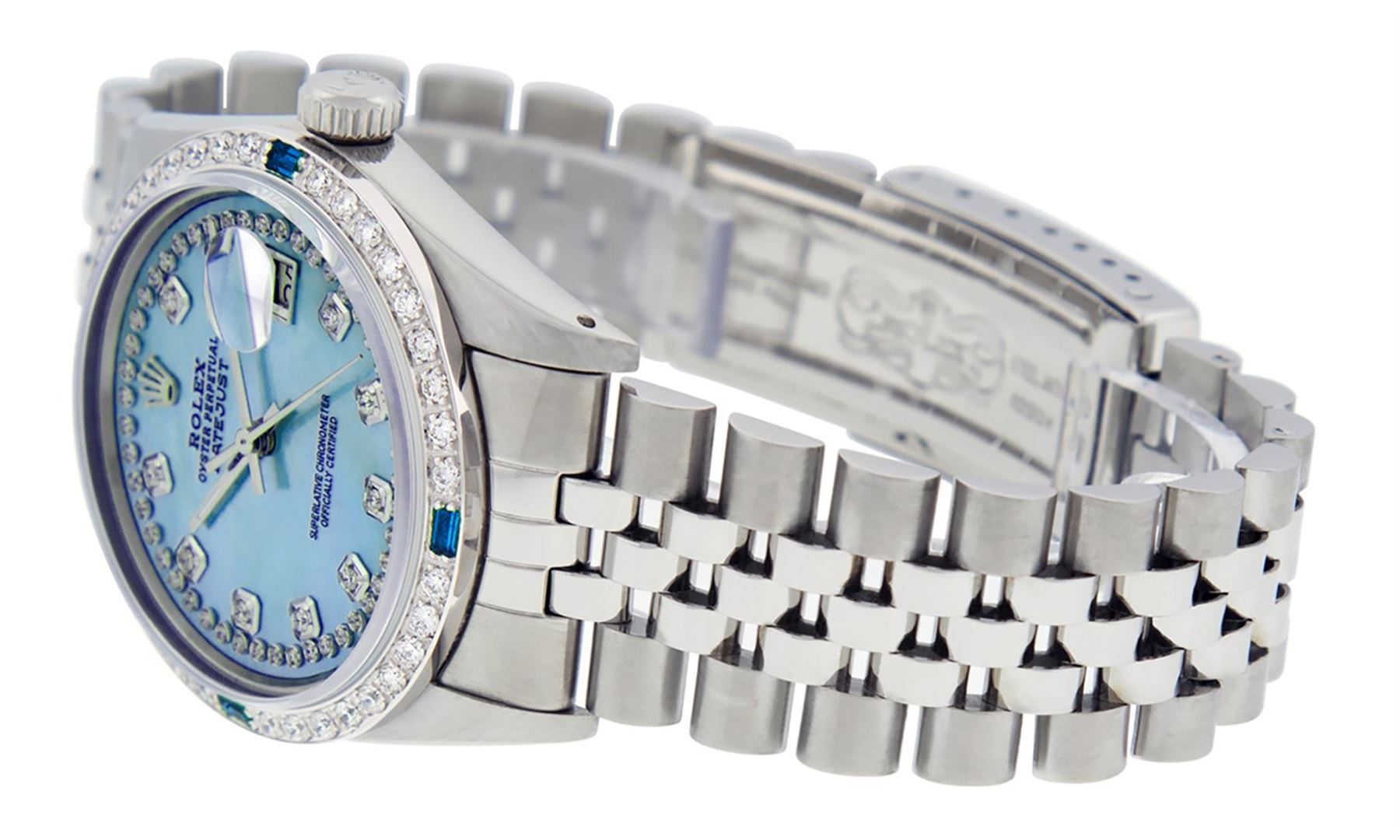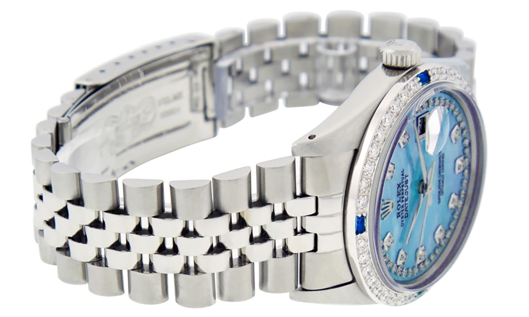 One Mens Rolex Datejust Polished Bright with Satin Finish, Serviced & Electronically Tested, Stainless Steel Case: 36mm, Custom Diamond Lugs: 28 Diamonds In Lugs, Color: G to H, Clarity: SI-VS. Stainless Steel Crown, Custom Bezel: 18K White Gold Diamond + Sapphire Beadset, Diamond Count: 36 Diamonds + 4 Sapphires, Total Weight 1.00 Carat, Clarity: SI-VS, Color: G to H. Custom Crystal: New Scratch Resistant Synthetic Sapphire Cyclops Lens. Custom Hands: New Luminescent Hands. Movement: Automatic Winding Movement Caliber 3035. Custom Dial: Blue Mother Of Pearl String Diamond Dial, Stone Count: 58 Diamonds In Dial, Diamond Color: G To H In Color, Clarity: VS. Date Window: 3 O'Clock Position Date Display, Quickset, Model: Datejust Condition: G-6 Extra Fine. Bracelet: Stainless Steel Jubilee Band. Bright Polish & Satin Finish. 7.0 Inch Length, Adjustable. Standard Clasp, With Rolex Logo. This Watch Has Been Serviced And Polished And Its Free Of All Dents And Scratches.