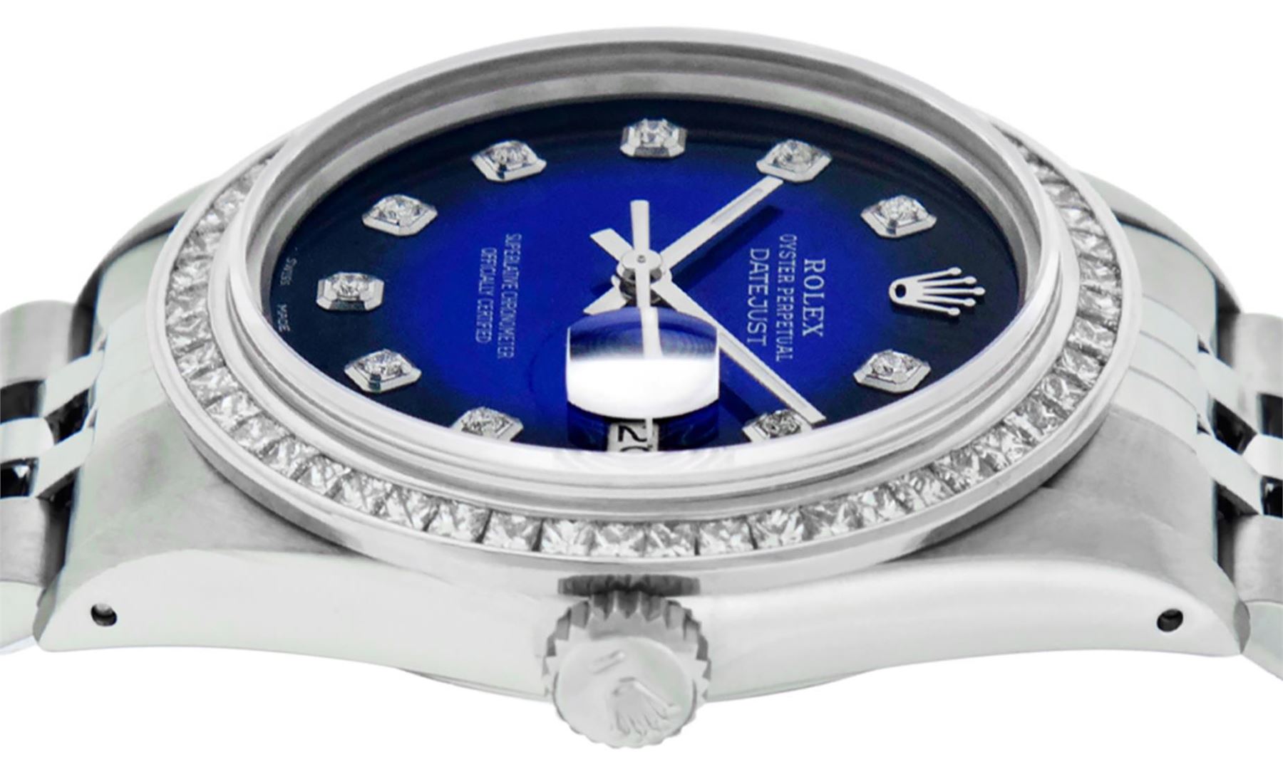 One Mens Pre Owned Stainless Steel Rolex Datejust Polished Bright with Satin Finish, Fully Serviced & Electronically Tested, Stainless Steel Case:36mm, Stainless Steel Crown, Custom Bezel: 14K White Gold 2.75 Carat Princess Cut Diamond Bezel, Diamond Count: 53 Diamonds, Total Weight 2.75 Carat. Custom Crystal: New Sapphire With Magnified Date Window. Custom Hands: New Luminecent Hands. Rolex Movement: Automatic Winding Movement 3035. Custom Dial: Custom Blue Vignette With Added Diamond Hour Markers, Diamond Count: 10 Diamonds in Dial. Date Window: 3 O'Clock Position Date Display, Quickset, Model: Datejust 36mm, Condition: G-6 Extra Fine. Rolex Bracelet: Rolex Stainless Steel Jubilee Band. Bright Polish And Satin Finish. 7.0 Inch Length, Adjustable. Standard Clasp, With Rolex Logo. This Watch Has Been Serviced And Polished It Is Free Of All Scratches And Dents.