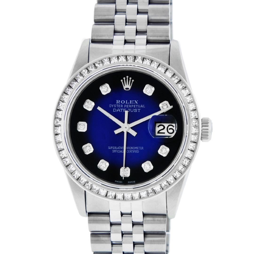 One Mens Pre Owned Stainless Steel Rolex Datejust Polished Bright with Satin Finish, Fully Serviced & Electronically Tested, Stainless Steel Case:36mm, Stainless Steel Crown, Custom Bezel: 14K White Gold 2.75 Carat Princess Cut Diamond Bezel, Diamond Count: 53 Diamonds, Total Weight 2.75 Carat. Custom Crystal: New Sapphire With Magnified Date Window. Custom Hands: New Luminecent Hands. Rolex Movement: Automatic Winding Movement 3035. Custom Dial: Custom Blue Vignette With Added Diamond Hour Markers, Diamond Count: 10 Diamonds in Dial. Date Window: 3 O'Clock Position Date Display, Quickset, Model: Datejust 36mm, Condition: G-6 Extra Fine. Rolex Bracelet: Rolex Stainless Steel Jubilee Band. Bright Polish And Satin Finish. 7.0 Inch Length, Adjustable. Standard Clasp, With Rolex Logo. This Watch Has Been Serviced And Polished It Is Free Of All Scratches And Dents.