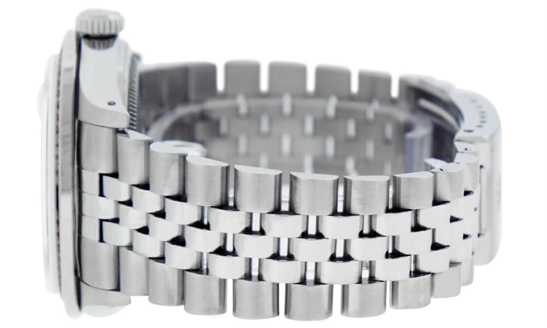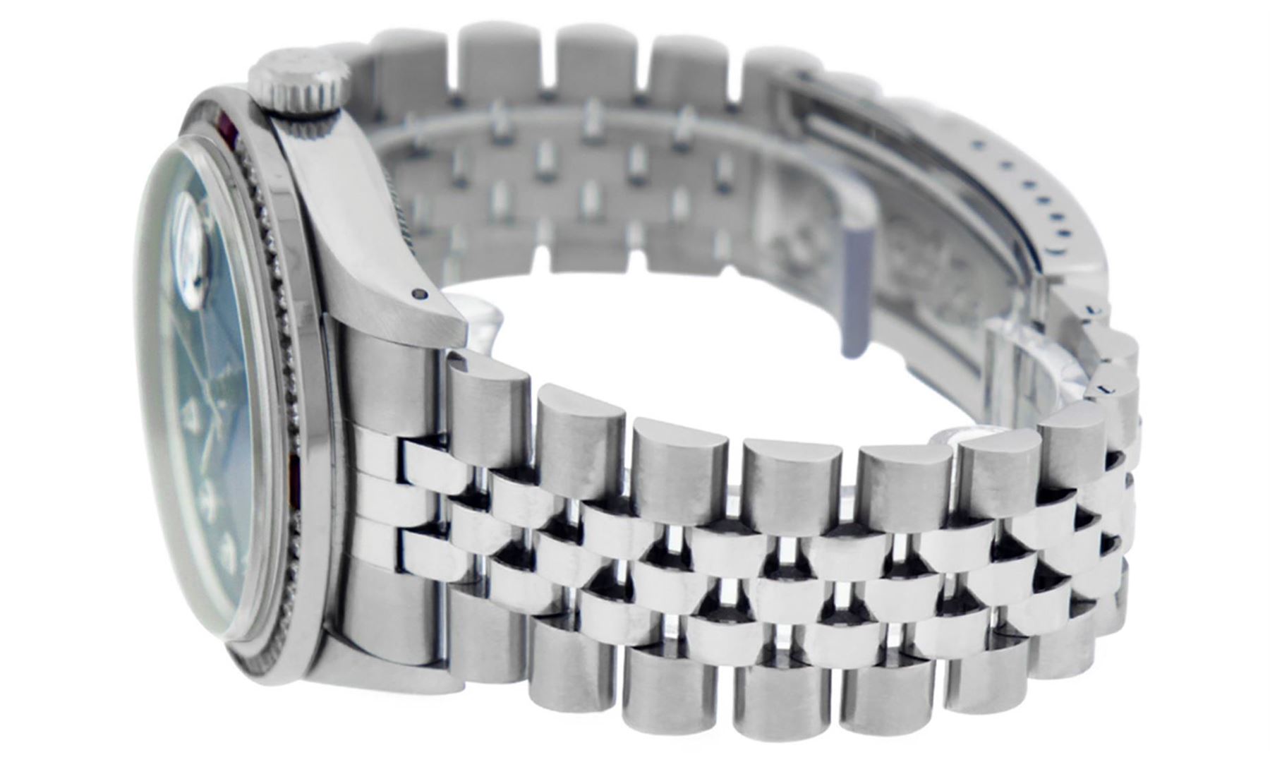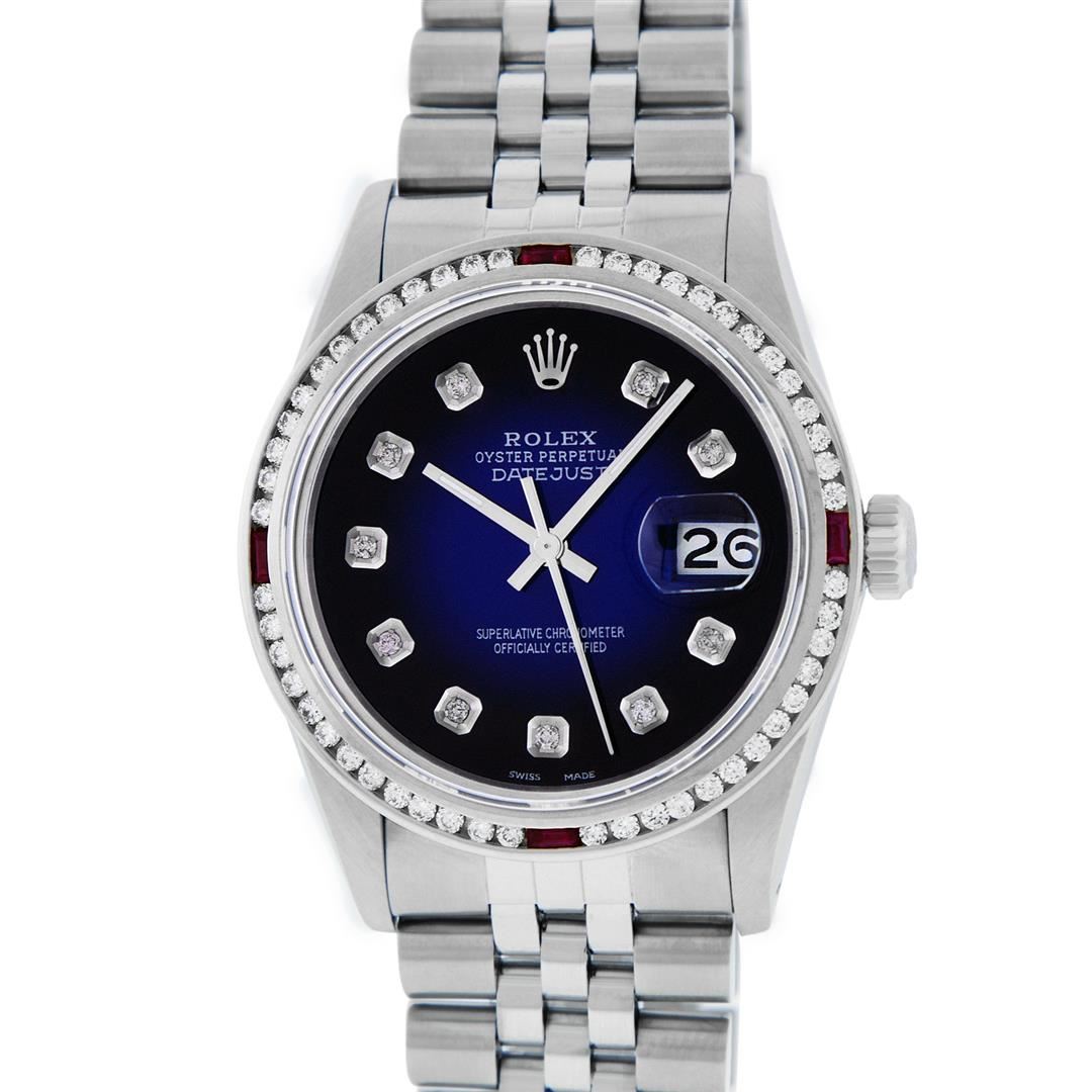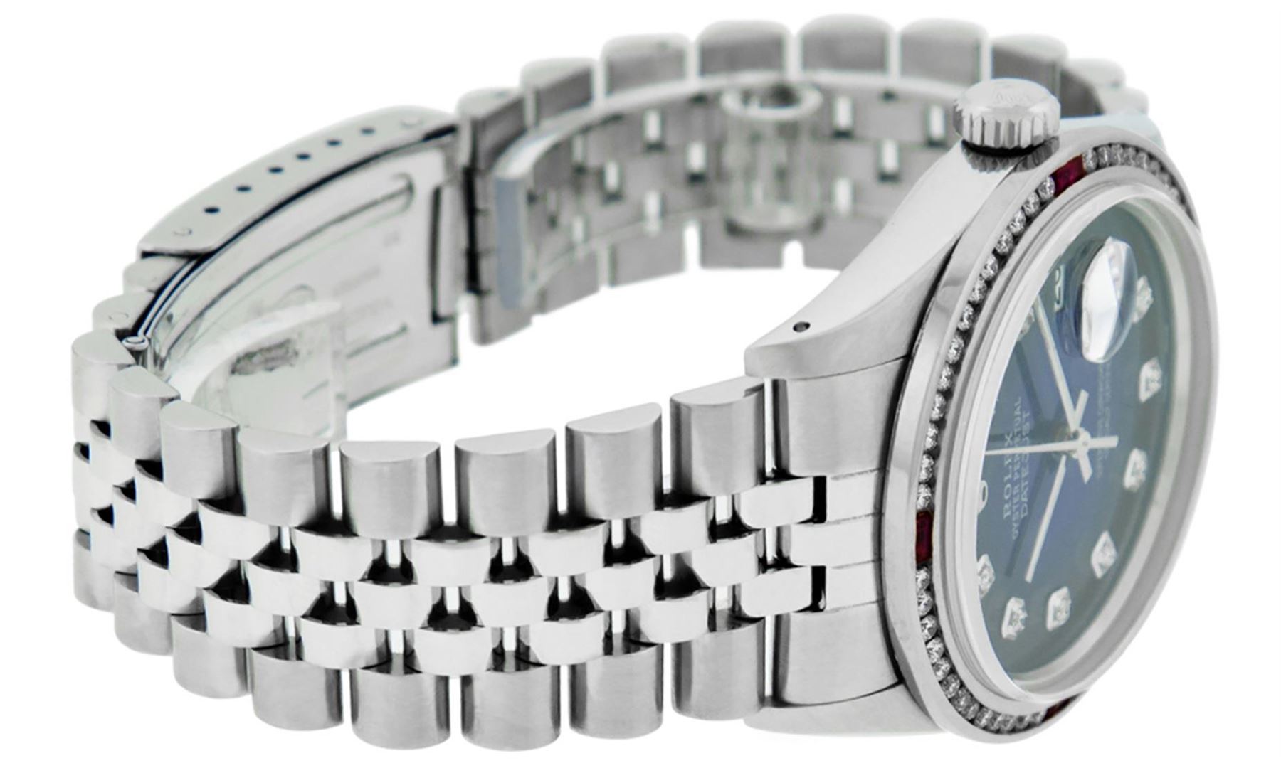 One Mens Stainless Steel Rolex Datejust Polished Bright with Satin Finish, Fully Serviced & Electronically Tested, Stainless Steel Case:36mm, Stainless Steel Crown, Custom Bezel: 18K White Gold Ruby Channel Set Diamond Bezel, Diamond Count: 52 Diamonds + 4 Rubies, Total Weight 1.30 Carat, Clarity: SI-VS, Color: G to H. Custom Crystal: New Synthetic Sapphire Cyclops Lens. Custom Hands: New Luminescent Hands. Movement: Automatic Winding Movement Caliber 3035. Custom Dial: Blue Vignette Diamond Dial, 10 Diamonds in Dial, G To H In Color, Clarity: SI-VS. Date Window: 3 O'Clock Position Date Display, Quickset, Model: Datejust 36mm, Condition: G-6 Extra Fine. Bracelet: Rolex Stainless Steel Jubilee Band. Bright Polish & Satin Finish. 7.0 Inch Length, Adjustable. Standard Clasp, With Rolex Logo. This watch has been serviced and polished and its free of all dents and scratches and has been time tested.