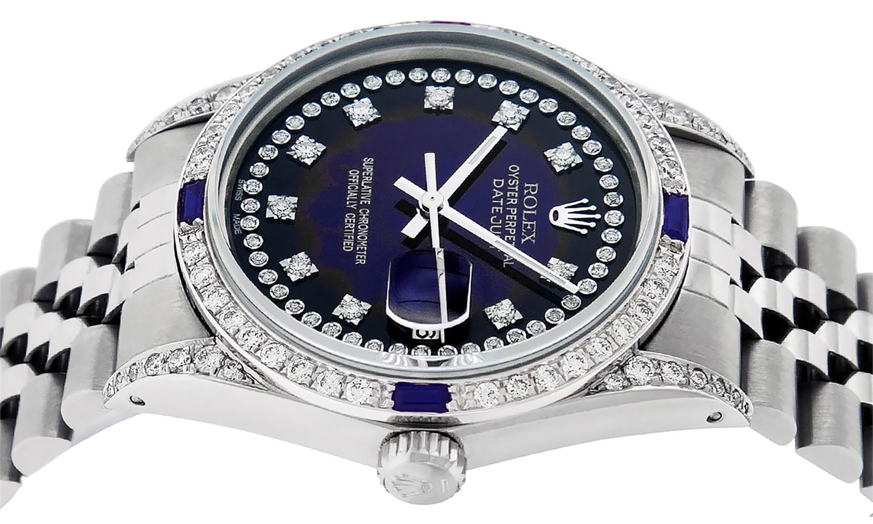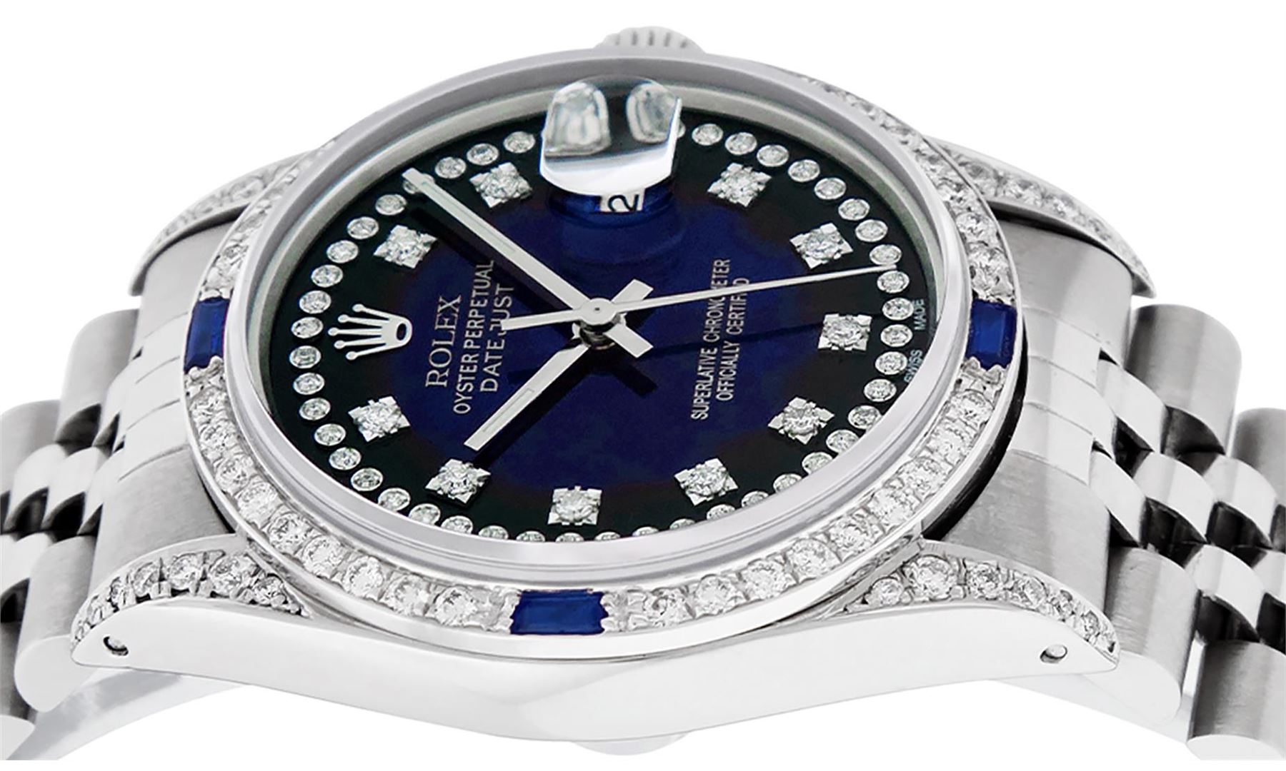 One Mens Rolex Datejust Polished Bright with Satin Finish, Serviced & Electronically Tested, Stainless Steel Case: 36mm, Custom Diamond Lugs: 28 Diamonds In Lugs, Color: G to H, Clarity: SI-VS. Stainless Steel Crown, Custom Bezel: 18K White Gold Diamond + Sapphire Beadset, Diamond Count: 36 Diamonds + 4 Sapphires, Total Weight 1.00 Carat, Clarity: SI-VS, Color: G to H. Custom Crystal: New Scratch Resistant Synthetic Sapphire Cyclops Lens. Custom Hands: New Luminescent Hands. Movement: Automatic Winding Movement Caliber 3035. Custom Dial: Blue Vignette String Diamond Dial, Stone Count: 43 Diamonds In Dial, Diamond Color: G To H In Color, Clarity: VS. Date Window: 3 O'Clock Position Date Display, Quickset, Model: Datejust Condition: G-6 Extra Fine. Bracelet: Stainless Steel Jubilee Band. Bright Polish & Satin Finish. 7.0 Inch Length, Adjustable. Standard Clasp, With Rolex Logo. This Watch Has Been Serviced And Polished And Its Free Of All Dents And Scratches.