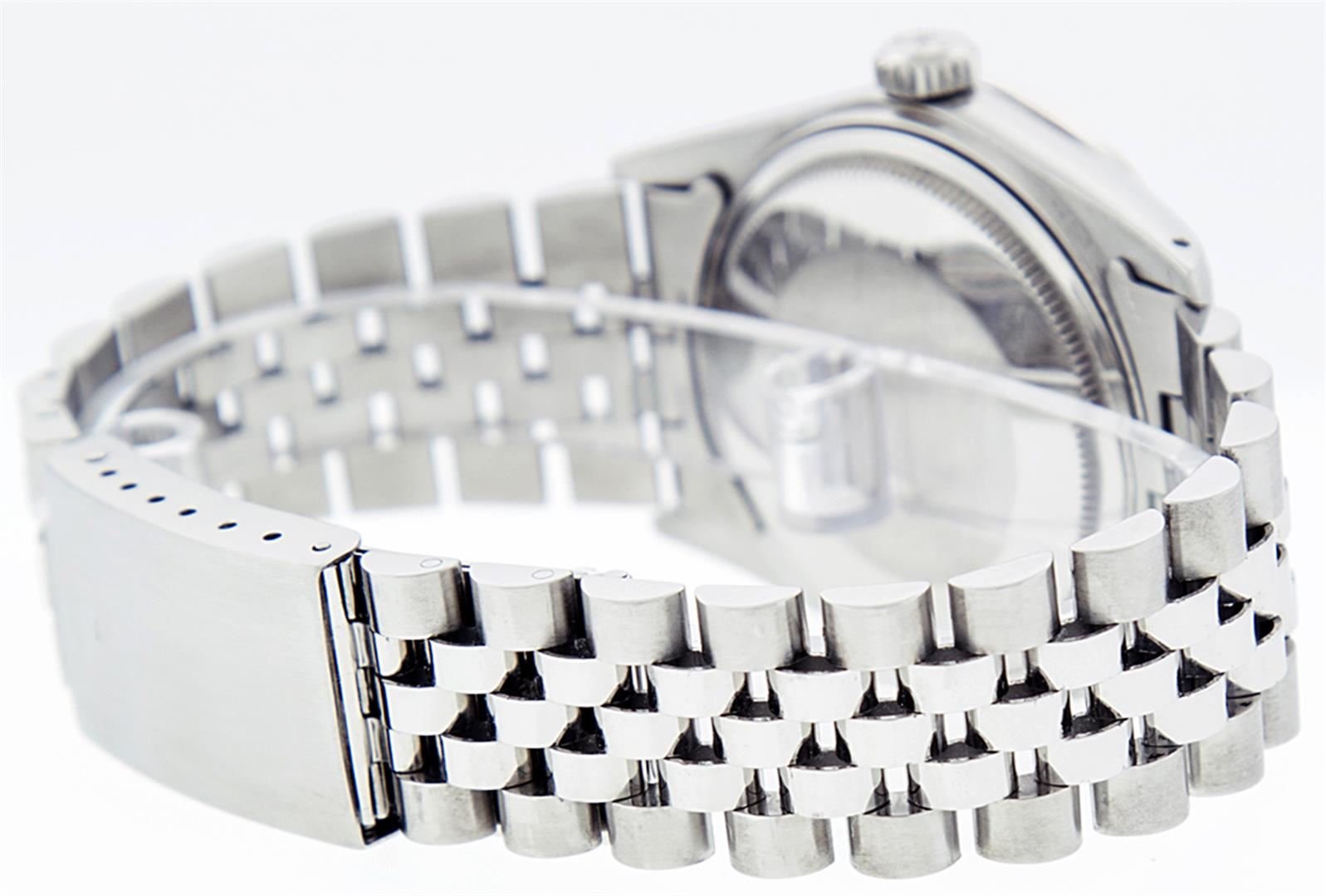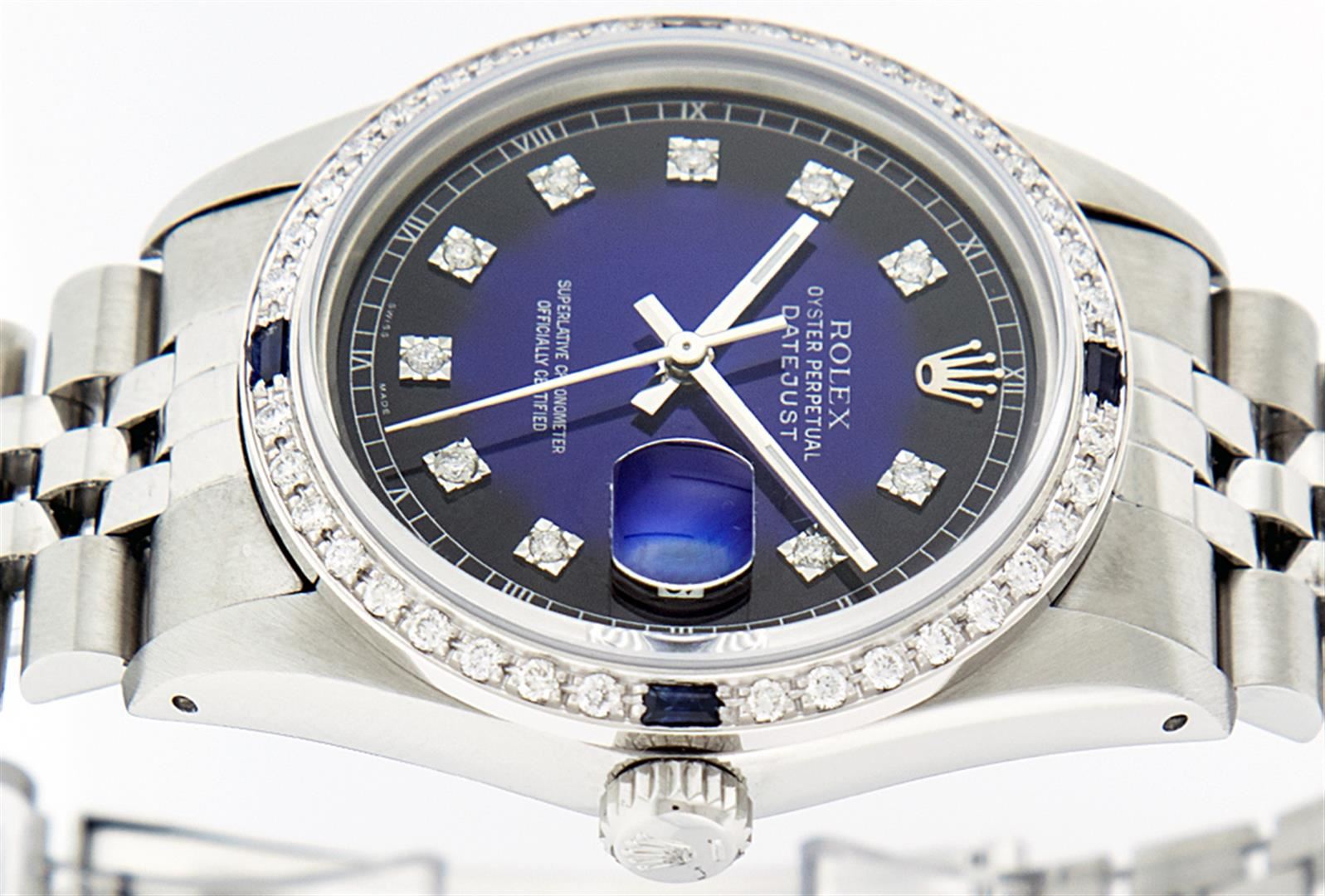 One Mens Stainless Steel Rolex Datejust Polished, Serviced & Electronically Tested, Stainless Steel Case: 36mm, Stainless Steel Crown, Custom Bezel: New 18K White Gold Sapphire Beadset Diamond Bezel, Diamond + Gem Count: 36 Diamonds + 4 Sapphires Total Weight 1.00 Carat, Clarity: SI-VS, Color: G to H. Custom Crystal: New Scratch Resistant Synthetic Sapphire Cyclops Lens. Custom Hands: New Luminescent Hands. Movement: Automatic Winding Movement Caliber 3035. Custom Dial: Blue Vignette With Diamond Hour Markers & Roman Track, 10 Diamonds in Dial, G To H In Color, Clarity: SI-VS. Date Window: 3 O'Clock Position Date Display, Quickset, Model: Datejust. Condition: G-6 Extra Fine. Bracelet: Stainless Steel Jubilee. Bright Polish & Satin Finish. 7.0 Inch Length, Adjustable. Standard Clasp, With Rolex Logo. This Watch Has Been Serviced Time Tested And Is In Excellent Condition It Is Free Of All Scratches And Dents