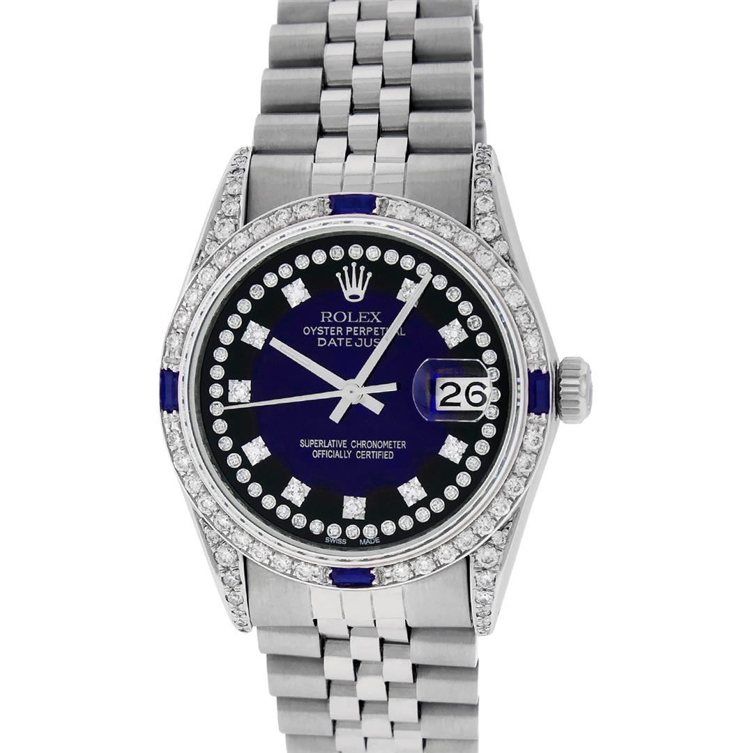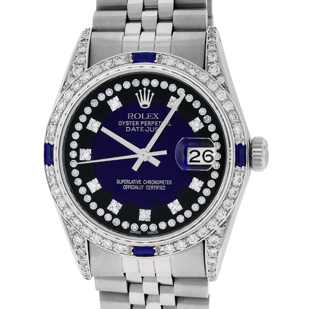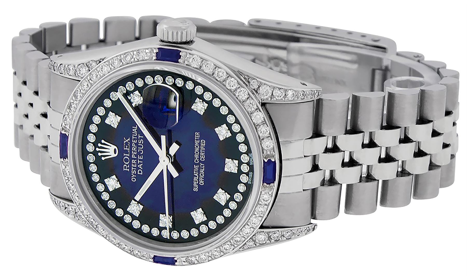 One Mens Rolex Datejust Polished Bright with Satin Finish, Serviced & Electronically Tested, Stainless Steel Case: 36mm, Custom Diamond Lugs: 28 Diamonds In Lugs, Color: G to H, Clarity: SI-VS. Stainless Steel Crown, Custom Bezel: 18K White Gold Diamond + Sapphire Beadset, Diamond Count: 36 Diamonds + 4 Sapphires, Total Weight 1.00 Carat, Clarity: SI-VS, Color: G to H. Custom Crystal: New Scratch Resistant Synthetic Sapphire Cyclops Lens. Custom Hands: New Luminescent Hands. Movement: Automatic Winding Movement Caliber 3035. Custom Dial: Blue Vignette String Diamond Dial, Stone Count: 43 Diamonds In Dial, Diamond Color: G To H In Color, Clarity: VS. Date Window: 3 O'Clock Position Date Display, Quickset, Model: Datejust Condition: G-6 Extra Fine. Bracelet: Stainless Steel Jubilee Band. Bright Polish & Satin Finish. 7.0 Inch Length, Adjustable. Standard Clasp, With Rolex Logo. This Watch Has Been Serviced And Polished And Its Free Of All Dents And Scratches.