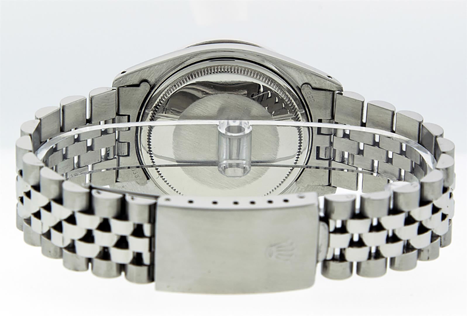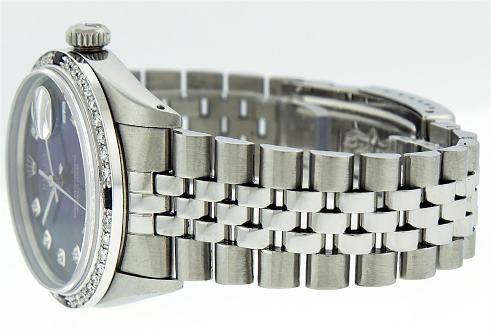 One Mens Rolex Datejust Polished Bright with Satin Finish, This Watch Has Been Serviced & Electronically Tested, Stainless Steel Case: 36mm, Stainless Steel Crown, Custom Bezel: New 18K White Gold Sapphire Beadset Diamond Bezel, Diamond + Gem Count: 36 Diamonds + 4 Sapphires Total Weight 1.00 Carat, Clarity: Si-VS, Color: G to H. Custom Crystal: New Synthetic Sapphire Cyclops Lens. Custom Hands: New Luminescent Hands. Movement: Automatic Winding Movement. Custom Dial: Blue Vignette With Diamond Hour Markers, Diamond Count: 10 Diamonds in Dial, Diamond Color: G To H In Color, Clarity: Si-VS. Date Window: 3 O'Clock Position Date Display, Quickset, Model: Datejust, Condition: G-6 Extra Fine. Bracelet: Stainless Steel Jubilee. Bracelet: 7.0 Inch Length, Adjustable. Standard Clasp, With Rolex Logo. This Watch Has Been Serviced Time Tested And Is In Excellent Condition It Is Free Of All Scratches And Dents.