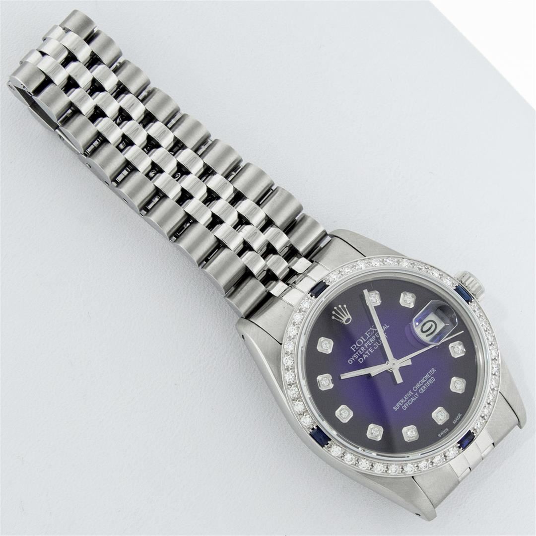 One Mens Rolex Datejust Polished Bright with Satin Finish, This Watch Has Been Serviced & Electronically Tested, Stainless Steel Case: 36mm, Stainless Steel Crown, Custom Bezel: New 18K White Gold Sapphire Beadset Diamond Bezel, Diamond + Gem Count: 36 Di