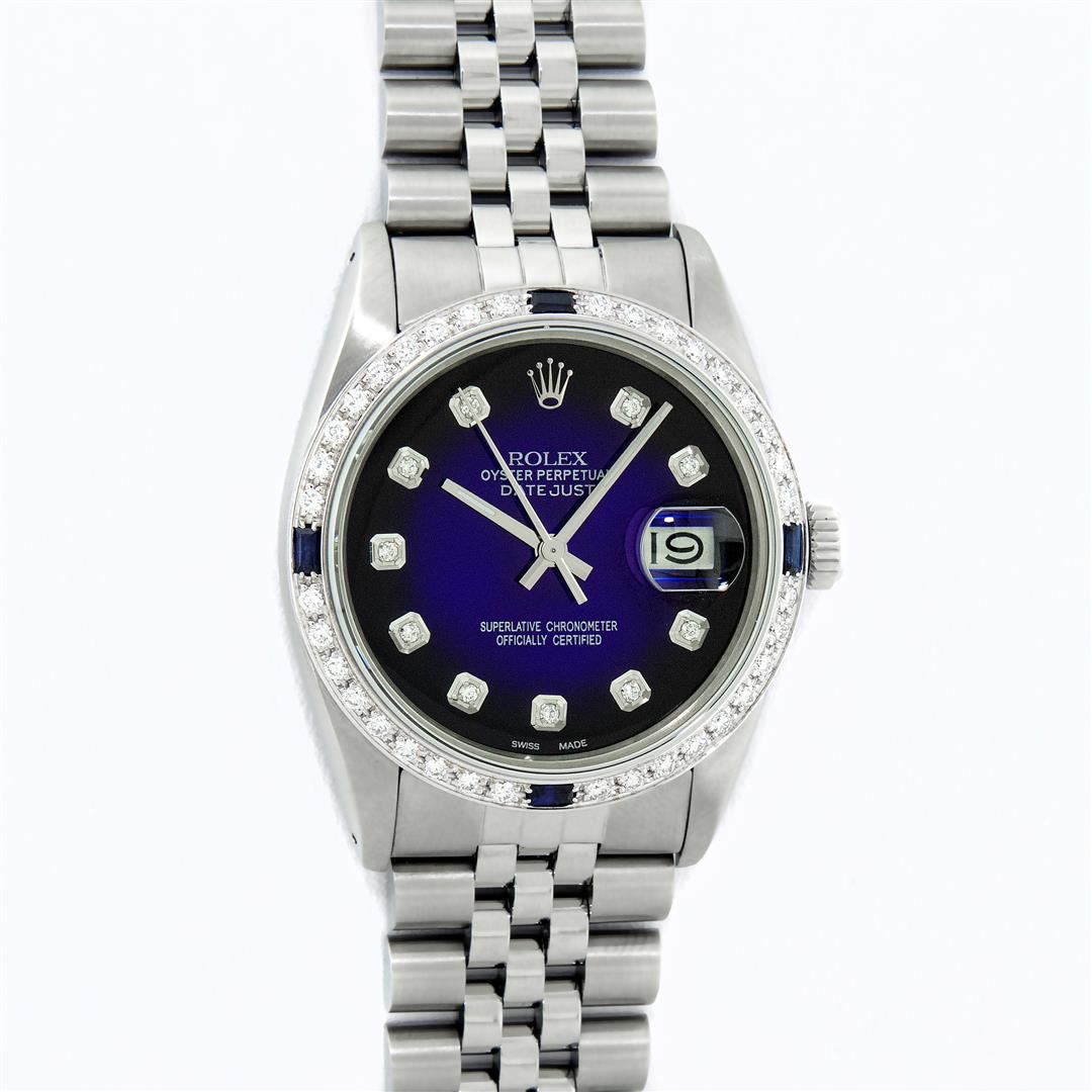 One Mens Rolex Datejust Polished Bright with Satin Finish, This Watch Has Been Serviced & Electronically Tested, Stainless Steel Case: 36mm, Stainless Steel Crown, Custom Bezel: New 18K White Gold Sapphire Beadset Diamond Bezel, Diamond + Gem Count: 36 Di