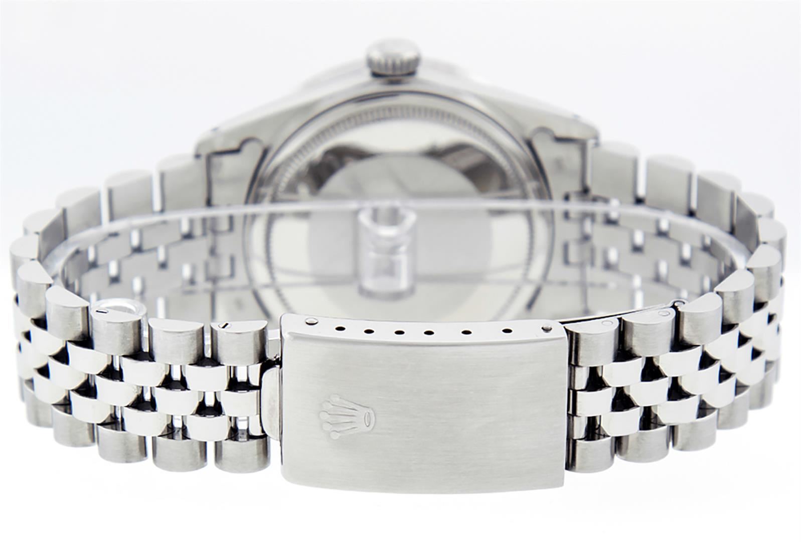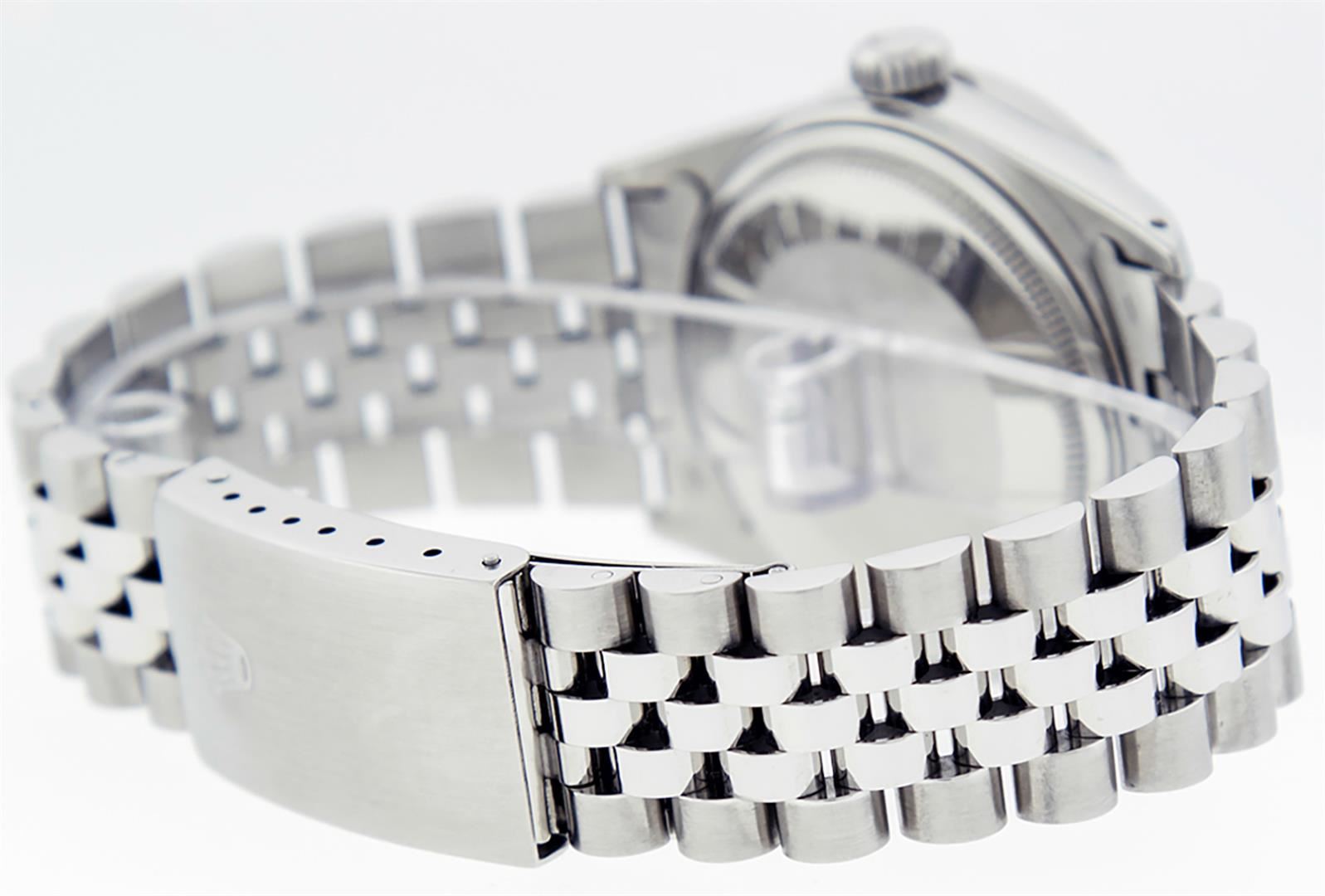 One Men's Rolex Datejust Polished Bright with Satin Finish, Serviced & Electronically Tested, Stainless Steel Case: 36mm, Stainless Steel Crown, New Custom Bezel: 18K White Gold Pyramid Diamond Bezel, Diamond Count: 24 Diamonds On Bezel, Total Weight .75 Carat, Clarity: SI-VS, Color: G to H. Custom Crystal: New Scratch Resistant Synthetic Sapphire Cyclops Lens. Custom Hands: New Luminescent Hands. Movement: Automatic Winding Movement Caliber 3035. Custom Refinished Dial: Blue Vignette String Single Cut Diamond Dial, Diamond Count: 58 Diamonds On Dial, Diamond Color: G To H In Color, Clarity: VS. Date Window: 3 O'Clock Position Date Display, Quickset, Model: Datejust Condition: G-6 Extra Fine. Bracelet: Stainless Steel Jubilee Band. Bright Polish & Satin Finish. 7.0 Inch Length, Adjustable. Standard Clasp, With Rolex Logo. This Watch Has Been Serviced And Polished And Its Free Of All Dents And Scratches.