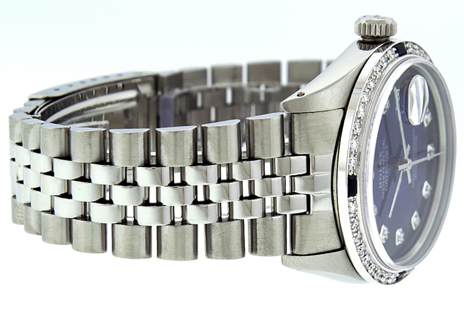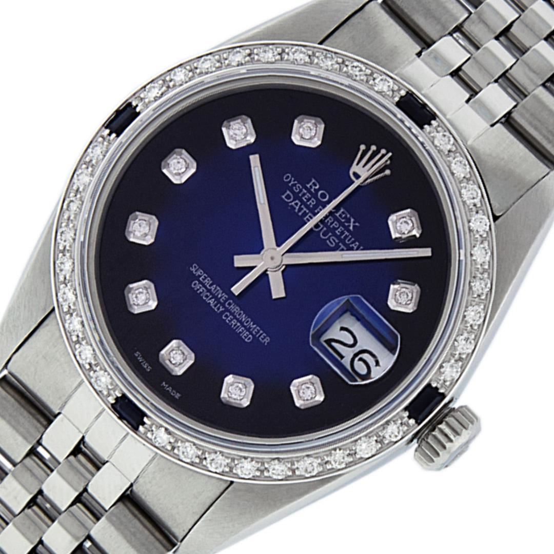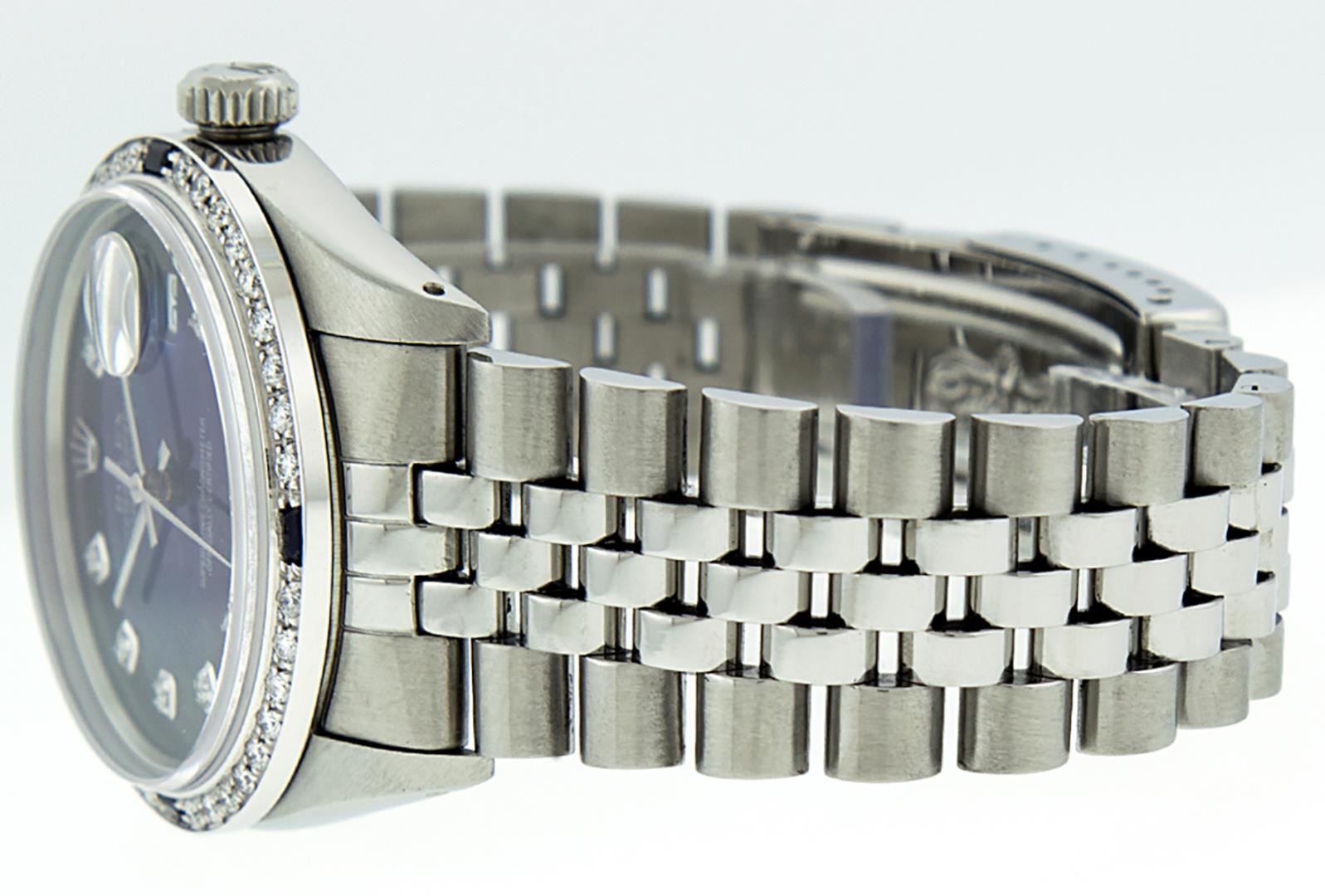 One Pre Owned Rolex Stainless Steel 36MM Datejust Polished Bright with Satin Finish, This Watch Has Been Serviced & Electronically Tested, Rolex Stainless Steel Case: 36mm, Rolex Stainless Steel Crown, Custom Bezel: New 18K White Gold Sapphire Beadset Diamond Bezel. Custom Crystal: New Sapphire With Date Window. Custom Hands: New Luminescent Hands. Rolex Movement: Automatic Winding Movement 3035. Custom Dial: Custom Blue Vignette With Added Diamond Hour Markers, Diamond Count: 10 Diamonds in Dial. Date Window: 3 O'Clock Position Date Display, Quickset, Model: Datejust, Condition: G-6 Extra Fine. Rolex Bracelet: Stainless Steel Jubilee Band. Bracelet: 7.0 Inch Length, Adjustable. Fold Clasp, With Rolex Logo. This Watch Has Been Serviced Time Tested And Is In Excellent Condition It Is Free Of All Scratches And Dents.