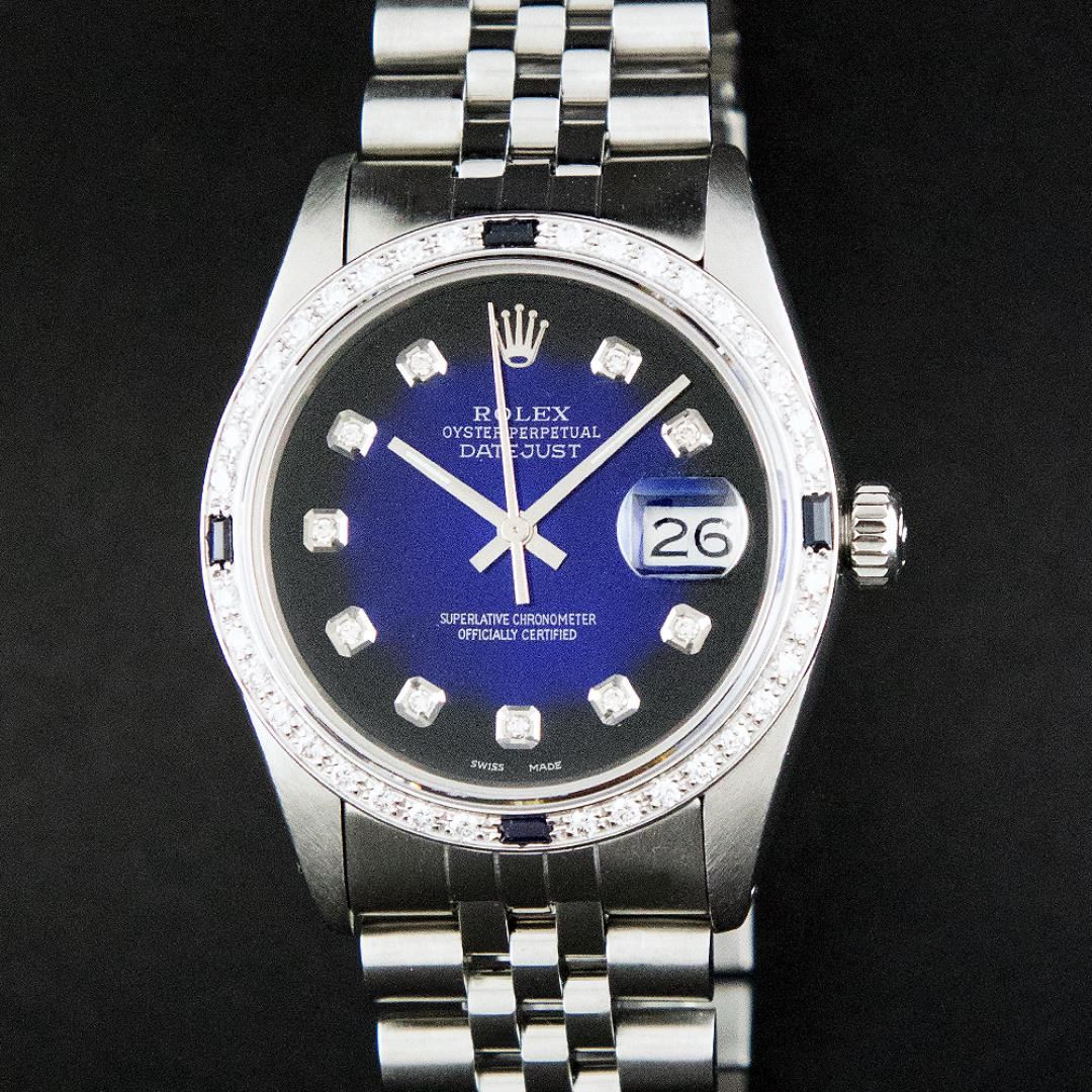 One Pre Owned Rolex Stainless Steel 36MM Datejust Polished Bright with Satin Finish, Rolex Stainless Steel Case: 36mm, Rolex Stainless Steel Crown, Custom Bezel: New 18K White Gold Sapphire Beadset Diamond Bezel. Custom Crystal: New Sapphire With Date Window. Custom Hands: New Luminescent Hands. Rolex Movement: Automatic Winding Movement 3035. Custom Dial: Custom Blue Vignette With Added Diamond Hour Markers, Diamond Count: 10 Diamonds in Dial. Date Window: 3 O'clock Position Date Display, Quickset, Model: Quickset Datejust, Condition: G-6 Extra Fine. Rolex Bracelet: Stainless Steel Jubilee Band. Bracelet: 7.0 Inch Length, Adjustable. Fold Clasp, With Rolex Logo. This Watch Has Been Serviced Time Tested And Is In Excellent Condition It Is Free Of All Scratches And Dents.