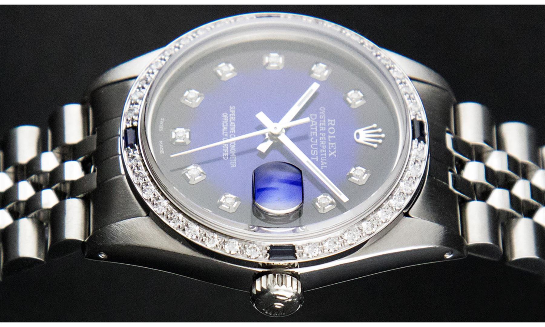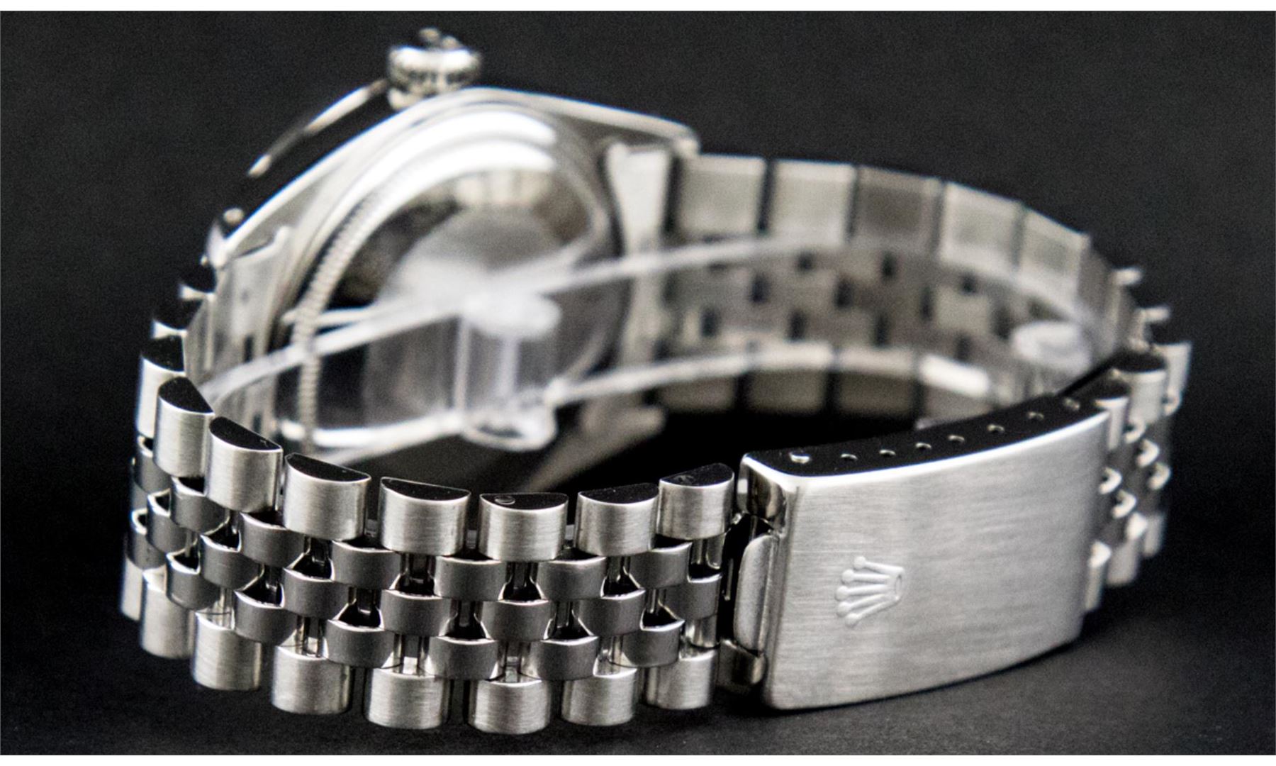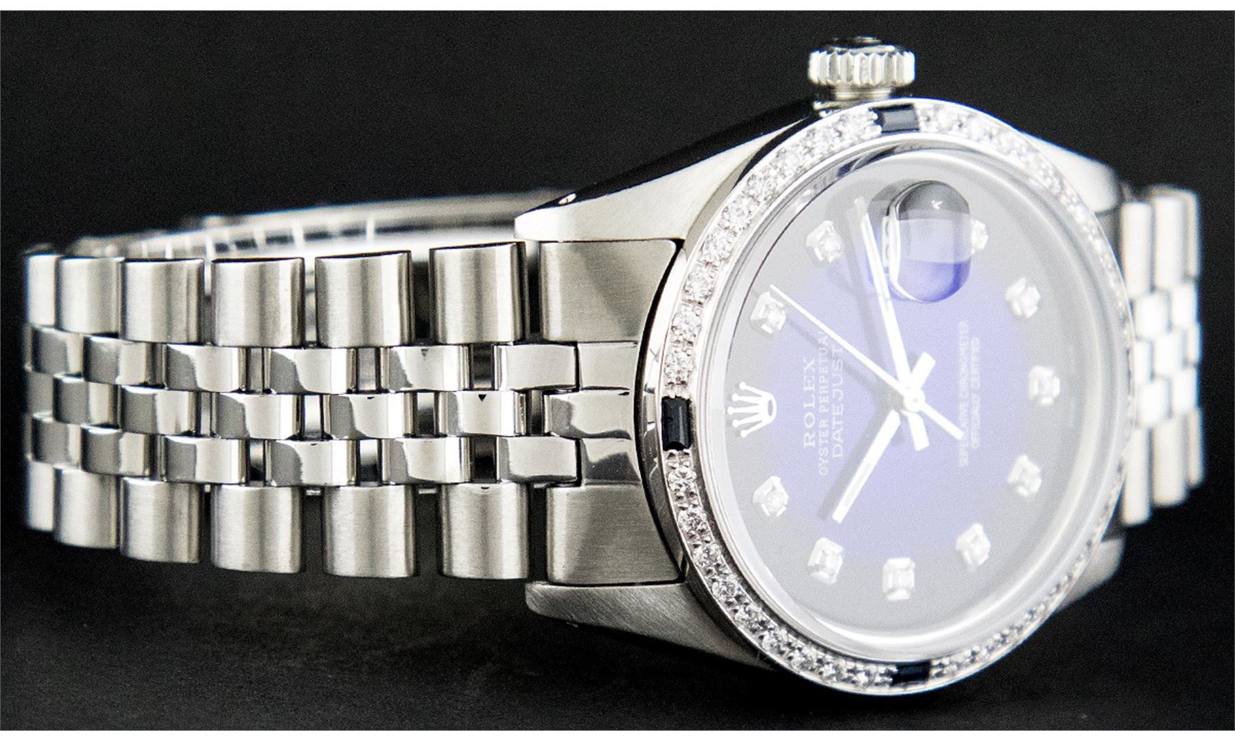 One Pre Owned Rolex Stainless Steel 36MM Datejust Polished Bright with Satin Finish, Rolex Stainless Steel Case: 36mm, Rolex Stainless Steel Crown, Custom Bezel: New 18K White Gold Sapphire Beadset Diamond Bezel. Custom Crystal: New Sapphire With Date Window. Custom Hands: New Luminescent Hands. Rolex Movement: Automatic Winding Movement 3035. Custom Dial: Custom Blue Vignette With Added Diamond Hour Markers, Diamond Count: 10 Diamonds in Dial. Date Window: 3 O'clock Position Date Display, Quickset, Model: Quickset Datejust, Condition: G-6 Extra Fine. Rolex Bracelet: Stainless Steel Jubilee Band. Bracelet: 7.0 Inch Length, Adjustable. Fold Clasp, With Rolex Logo. This Watch Has Been Serviced Time Tested And Is In Excellent Condition It Is Free Of All Scratches And Dents.