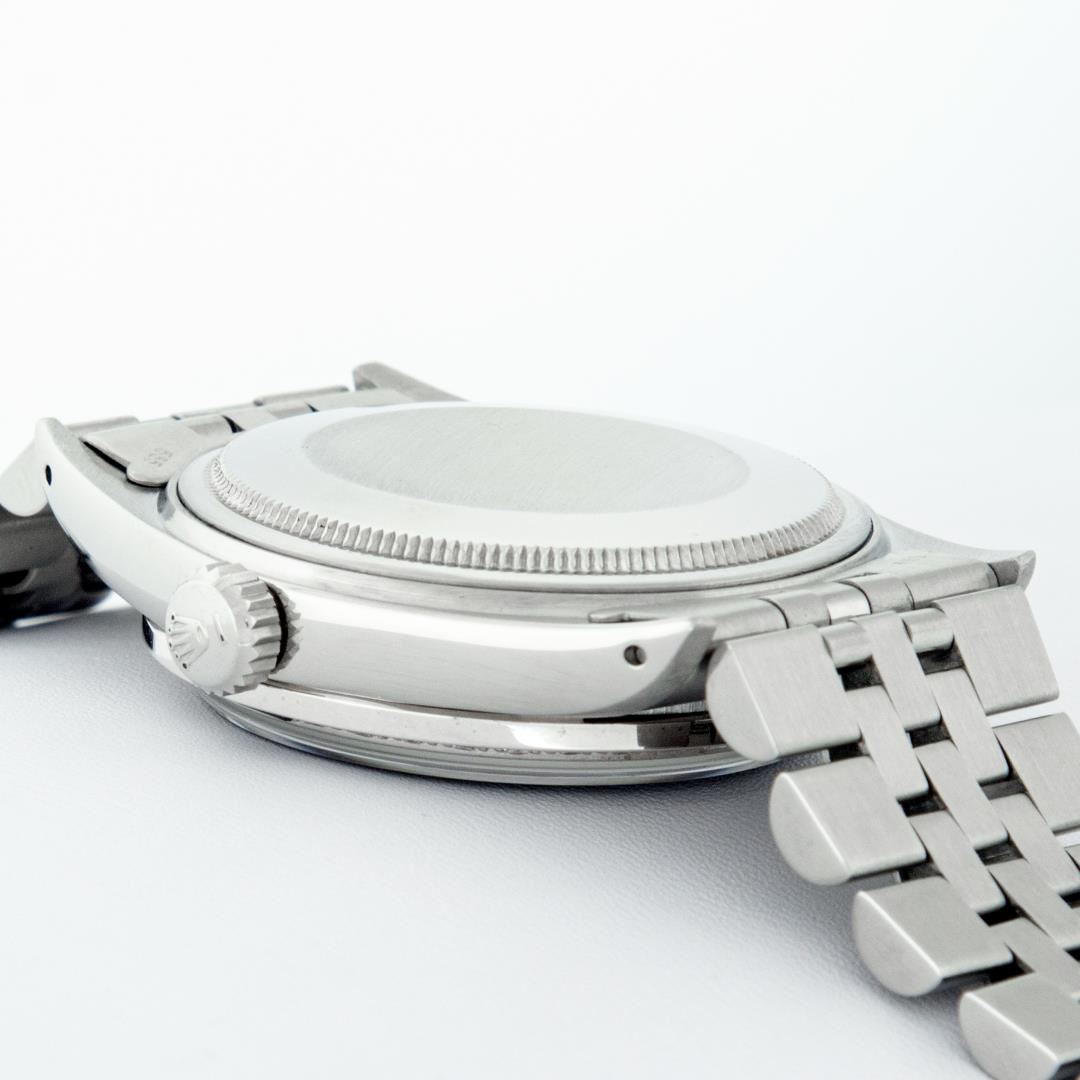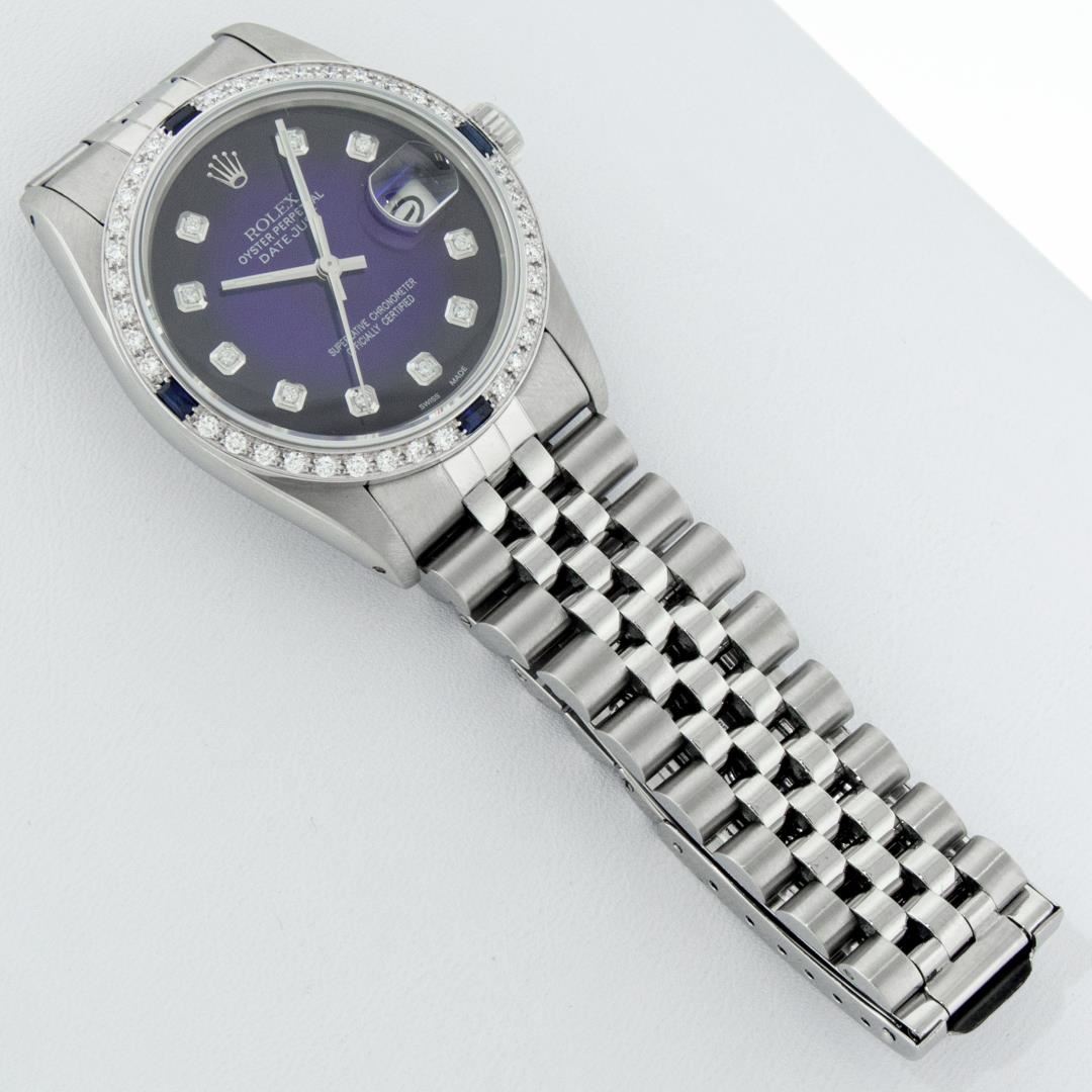 One Pre Owned Rolex Stainless Steel 36MM Datejust Polished Bright with Satin Finish, Rolex Stainless Steel Case: 36mm, Rolex Stainless Steel Crown, Custom Bezel: New 18K White Gold Sapphire Beadset Diamond Bezel. Custom Crystal: New Sapphire With Date Window. Custom Hands: New Luminescent Hands. Rolex Movement: Automatic Winding Movement 3035. Custom Dial: Custom Blue Vignette With Added Diamond Hour Markers, Diamond Count: 10 Diamonds in Dial. Date Window: 3 O'Clock Position Date Display, Quickset, Model: Quickset Datejust, Condition: G-6 Extra Fine. Rolex Bracelet: Stainless Steel Jubilee Band. Bracelet: 7.0 Inch Length, Adjustable. Fold Clasp, With Rolex Logo. This Watch Has Been Serviced Time Tested And Is In Excellent Condition It Is Free Of All Scratches And Dents.