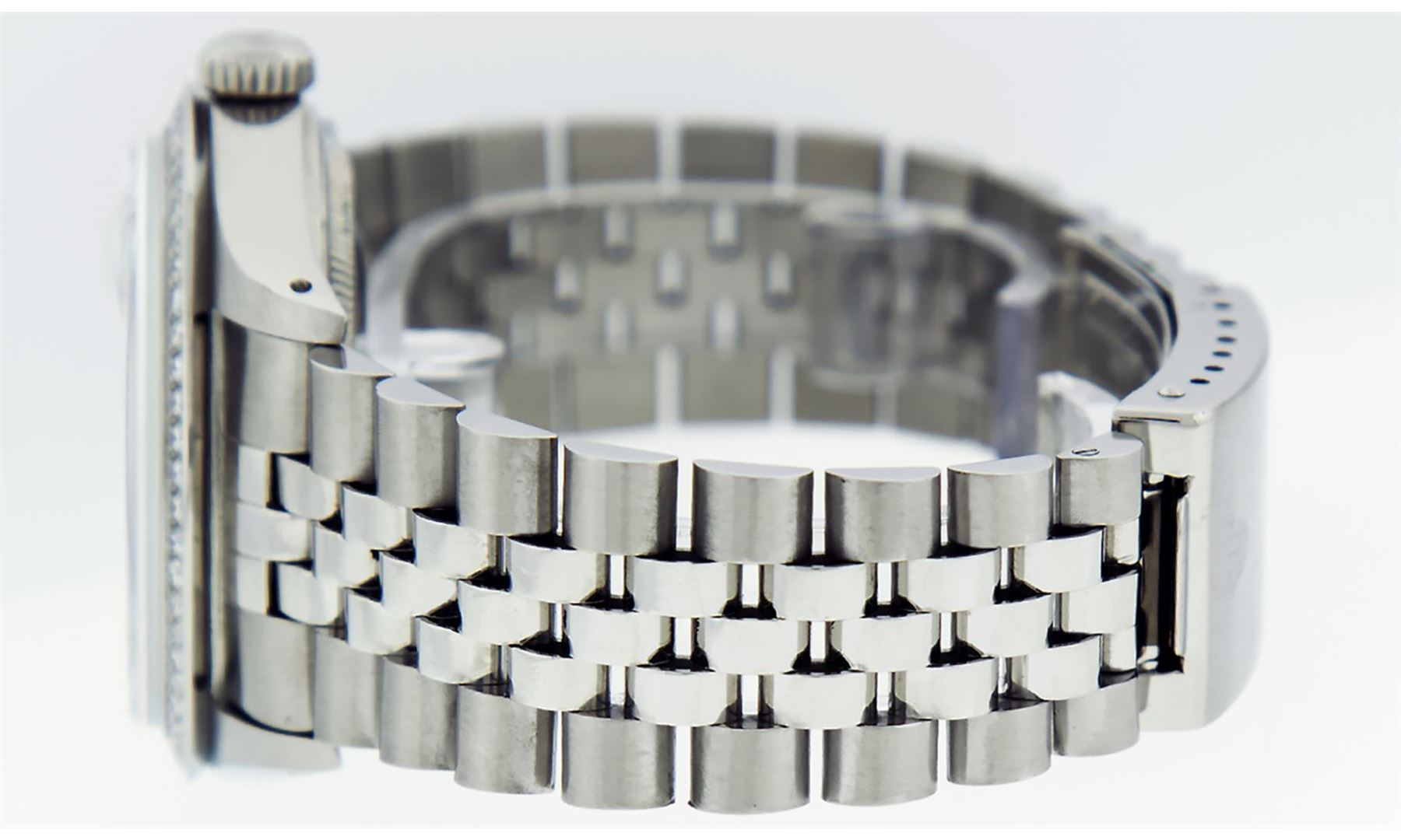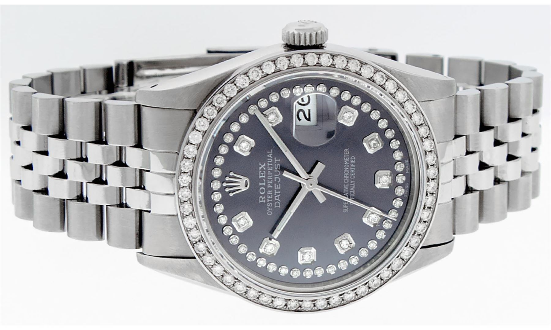 One Mens Rolex Stainless Steel Datejust Polished Bright with Satin Finish, Stainless Steel Case: 36mm, Stainless Steel Crown, Custom Bezel: New Stainless Steel Beadset Diamond Bezel, Diamond Count: 54 Diamonds. Custom Crystal: New Sapphire With Magnified Date Window. Custom Hands: New Luminescent Hands. Rolex Movement: Automatic Winding Movement. Custom Dial: Custom Dark Rhodium Diamond Dial, Diamond Count: 58 Diamonds On Dial. Date Window: 3 O'Clock Position Date Display, Quickset, Model: Datejust. Condition: G-6 Extra Fine. Rolex Bracelet: Stainless Steel Jubilee Band. Bright Polish And Satin Finish. 7.0 Inch Length, Adjustable. Standard Clasp, With Rolex Logo. This Watch Has Been Serviced Time Tested And Is In Excellent Condition It Is Free Of All Scratches And Dents.