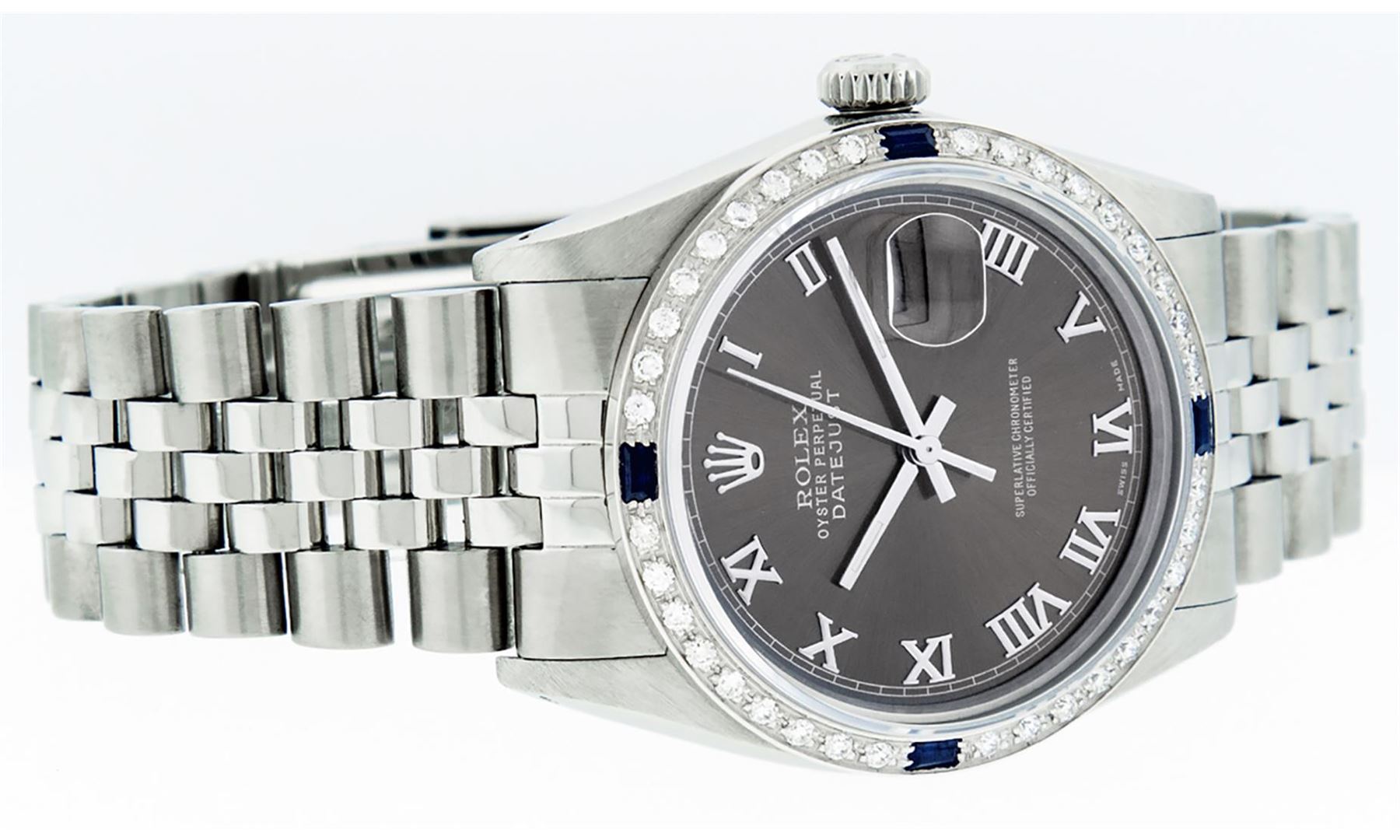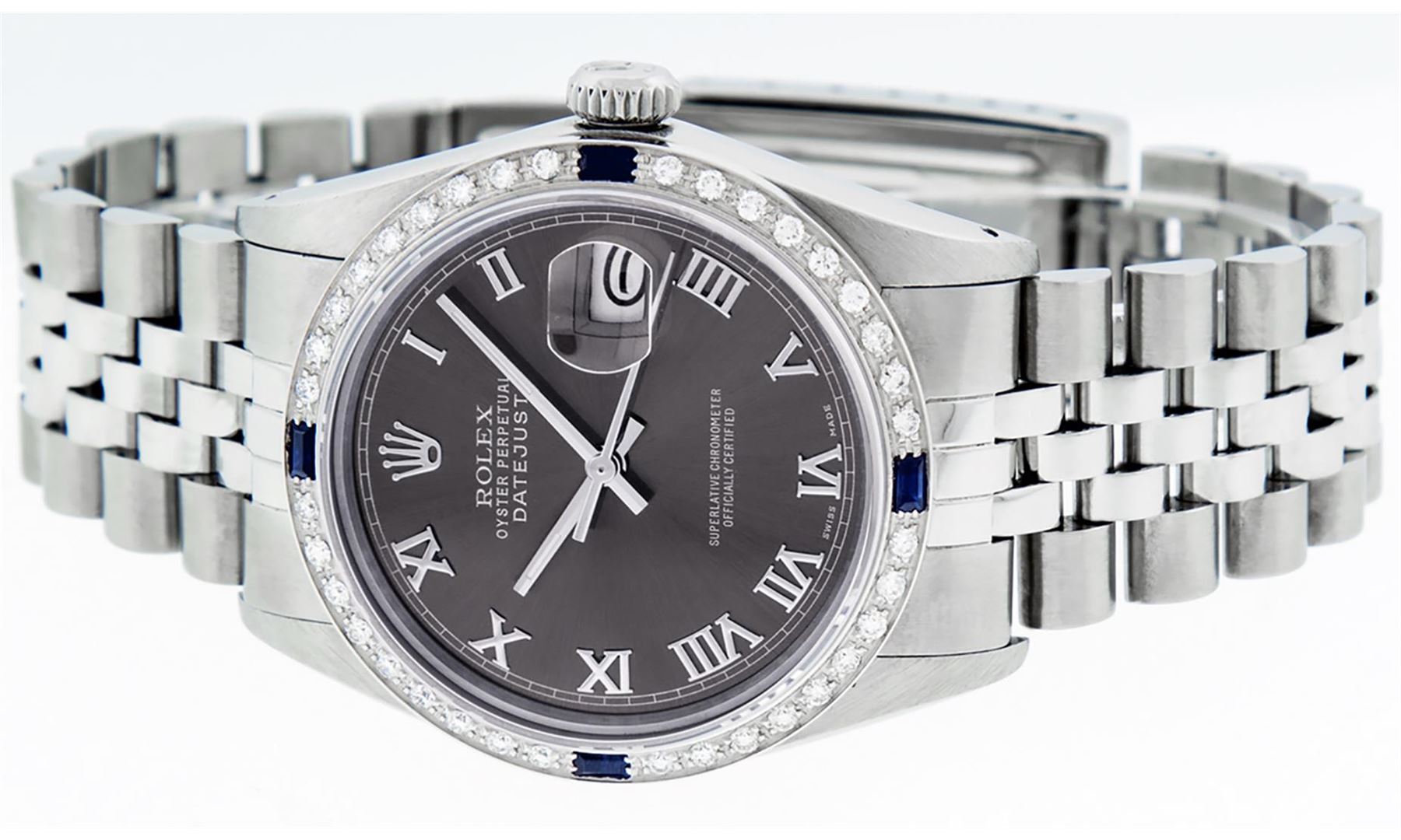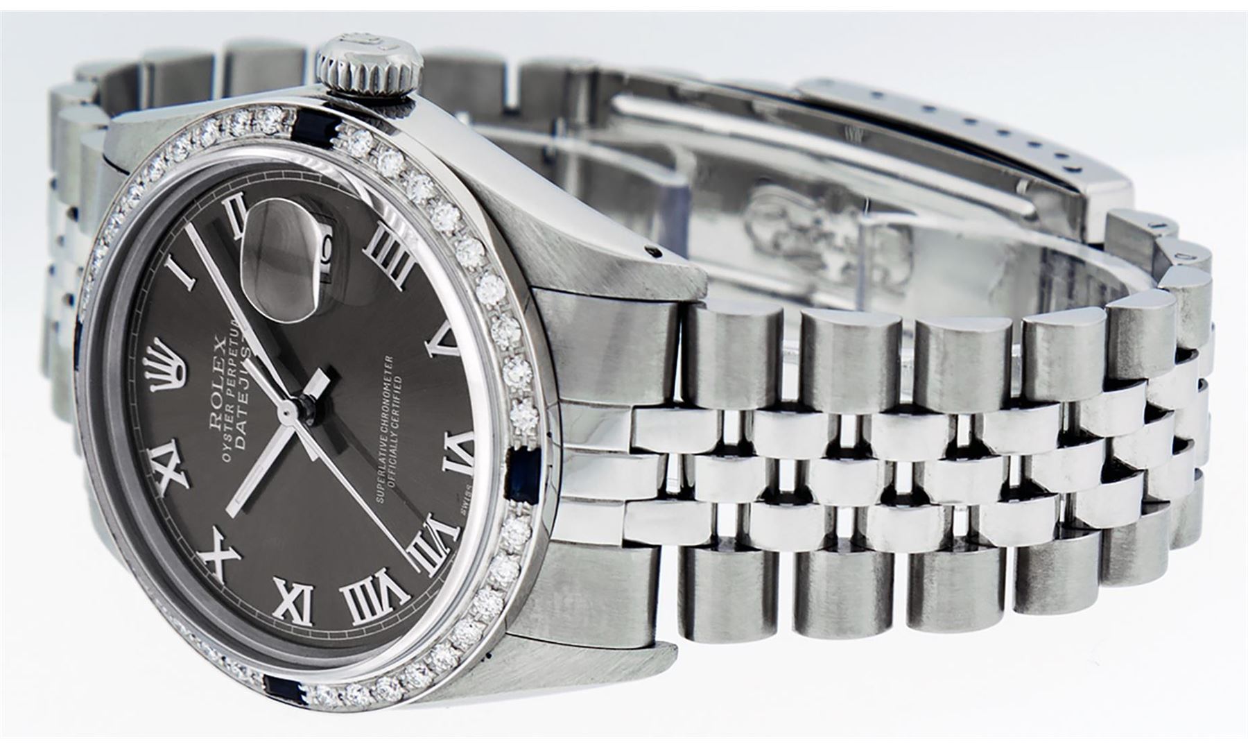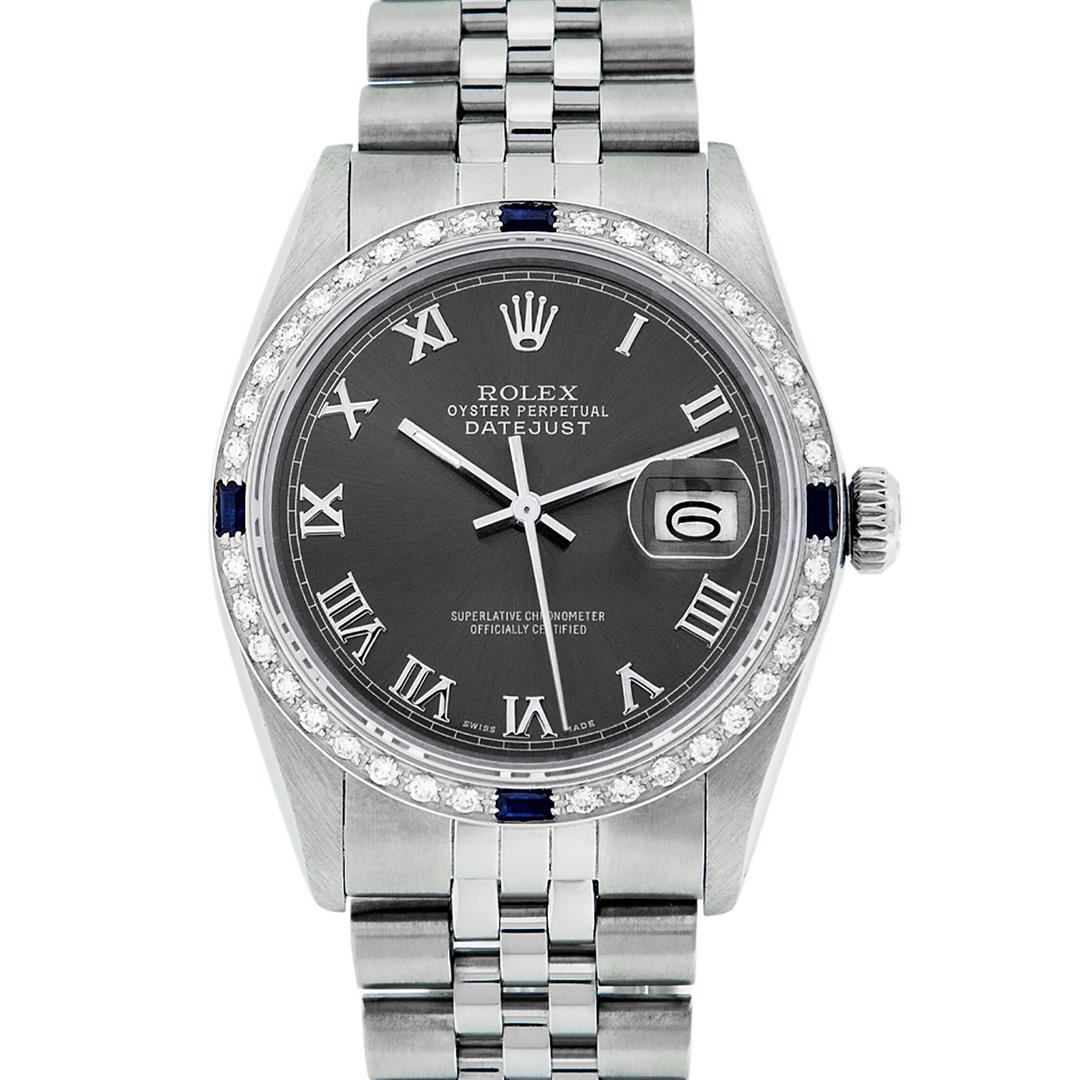 One Mens Stainless Steel Rolex Datejust Polished Bright with Satin Finish, This Watch Has Been Serviced & Electronically Tested, Stainless Steel Case: 36mm, Stainless Steel Crown, Custom Bezel: New 18K White Gold Sapphire Beadset Diamond Bezel, Diamond + Gem Count: 36 Diamonds + 4 Sapphires, Total Weight 1.00 Carat, Clarity: SI-VS, Color: G to H. Custom Crystal: New Scratch Resistant Synthetic Sapphire Cyclops Lens. Custom Hands: New Luminescent Hands. Movement: Automatic Winding Movement Caliber 3035. Custom Dial: Rhodium With Roman Track & Square Track. Date Window: 3 O'Clock Position Date Display, Quickset, Model: Datejust, Condition: G-6 Extra Fine. Bracelet: Stainless Steel Jubilee Band. Bracelet: 7.0 Inch Length, Adjustable. Standard Clasp, With Rolex Logo. This Watch Has Been Serviced Time Tested And Is In Excellent Condition It Is Free Of All Scratches And Dents.