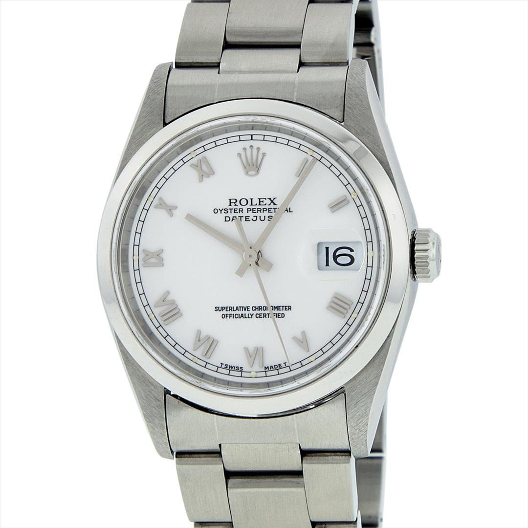 One Gents Rolex Stainless Steel Datejust Polished Bright with Satin Finish, Serviced & Electronically Tested, Stainless Steel Case: 36mm, Stainless Steel Crown, Bezel: Stainless Steel Smooth Bezel. Crystal: Synthetic Sapphire Cyclops Lens. Movement: Automatic Winding Movement Caliber 3135. Custom Dial: White Roman Dial With Square Roman Track & Lumi Dots. Date Window: 3 O'Clock Position Date Display, Quickset, Model: Quickset Datejust. Condition: G-6 Extra Fine. Bracelet: Stainless Steel Oyster Band. Bright Polish & Satin Finish. 7.0 Inch Length, Adjustable. Standard Clasp, With Rolex Logo.