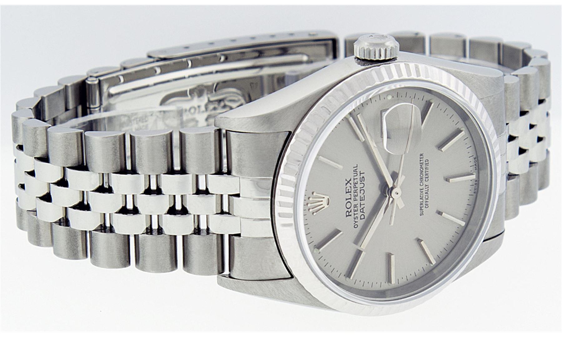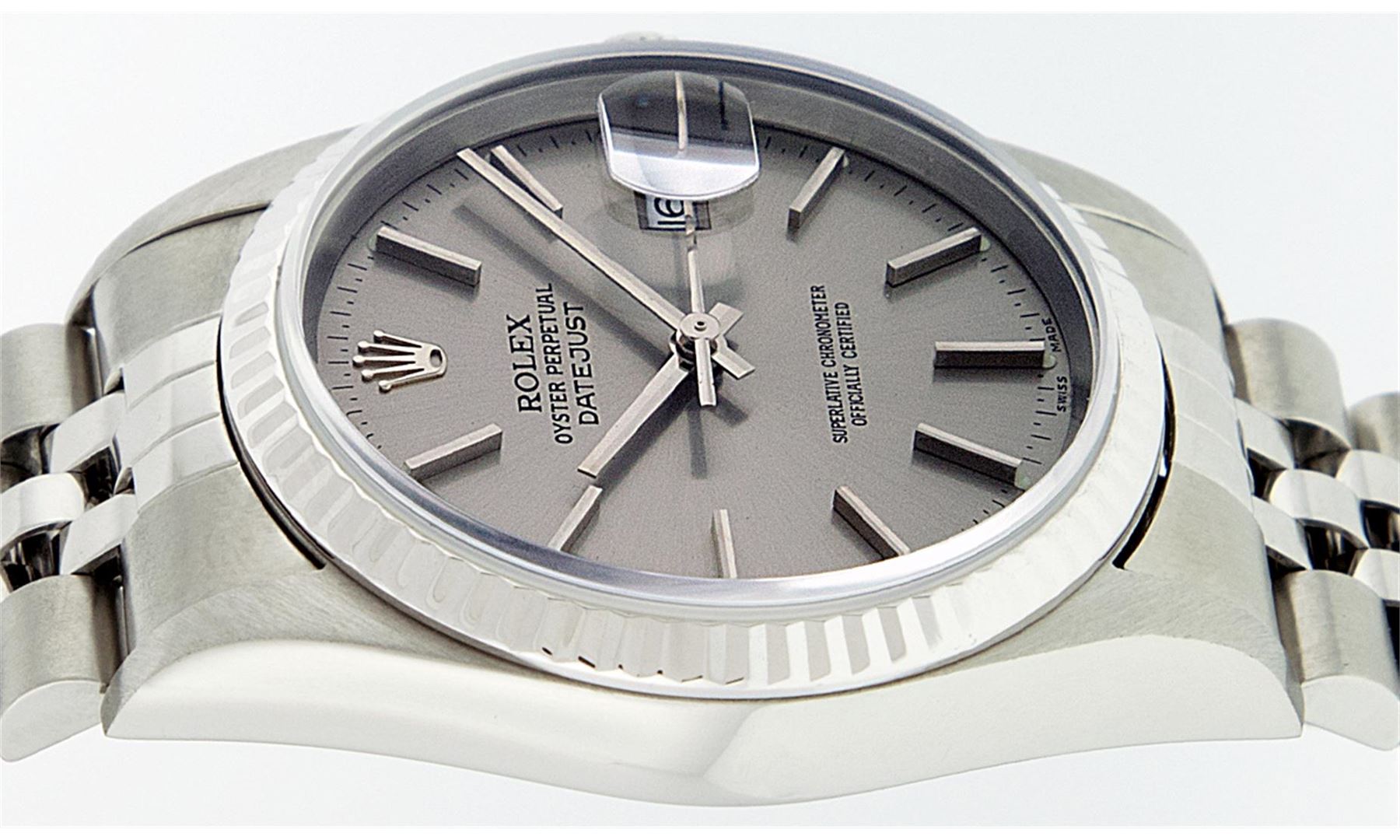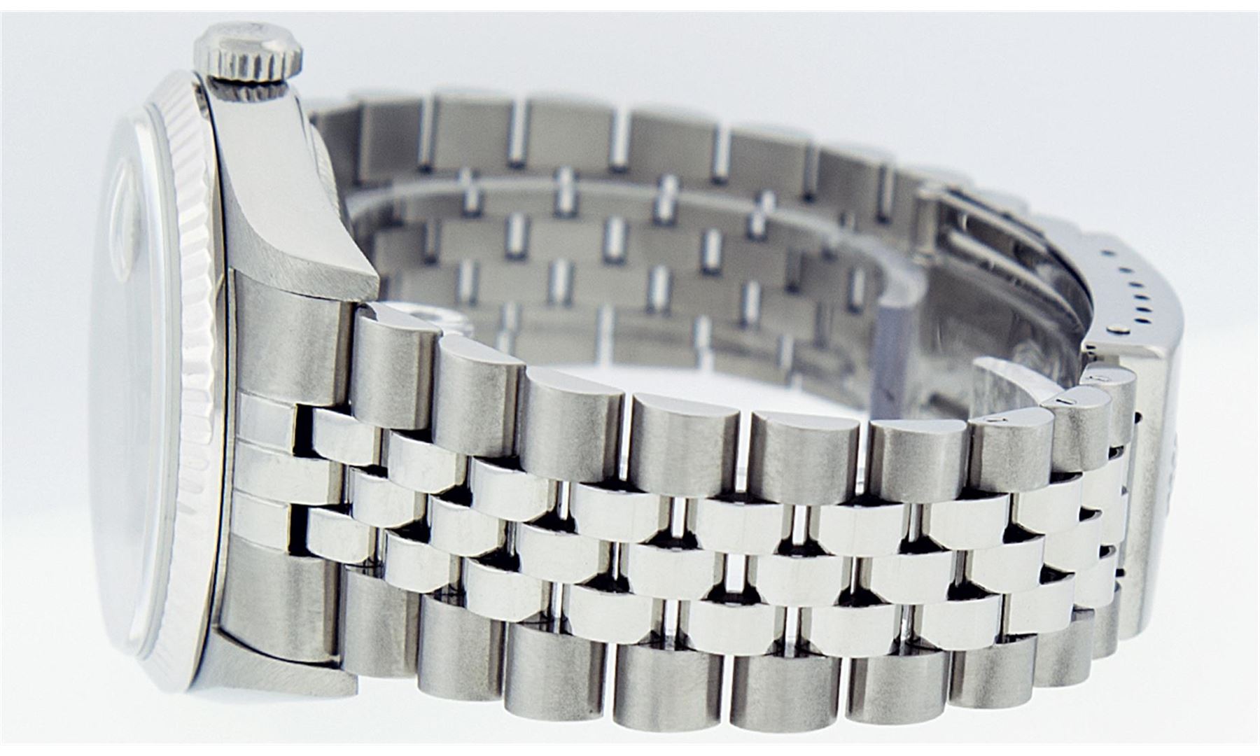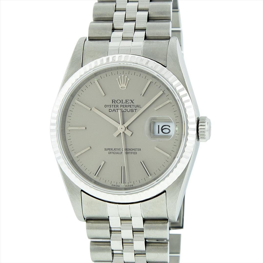 One Gents Rolex Stainless Steel Datejust Polished Bright with Satin Finish, Serviced & Electronically Tested, Stainless Steel Case: 36mm, Stainless Steel Crown, Bezel: Stainless Steel Smooth Bezel. Crystal: Synthetic Sapphire Cyclops Lens. Movement: Automatic Winding Movement Caliber 3\135. Custom Dial: Slate Grey Index With Line Track And Lumi Dot. Date Window: 3 O'Clock Position Date Display, Quickset, Model: Quickset Datejust. Condition: G-6 Extra Fine. Bracelet: Stainless Steel Oyster Band. Bright Polish & Satin Finish. 7.0 Inch Length, Adjustable. Standard Clasp, With Rolex Logo.