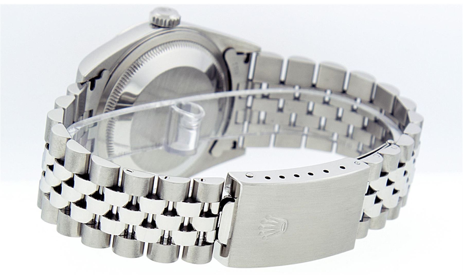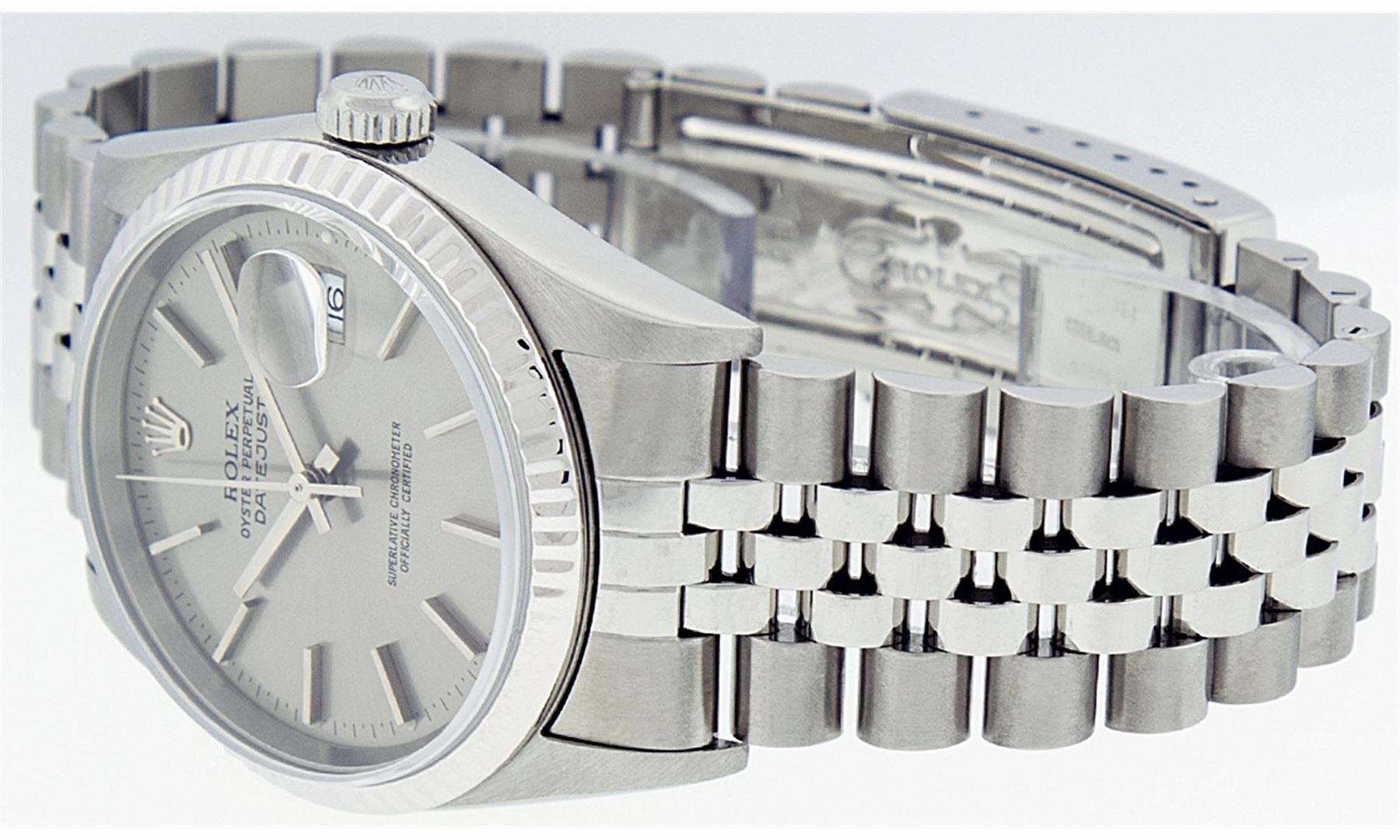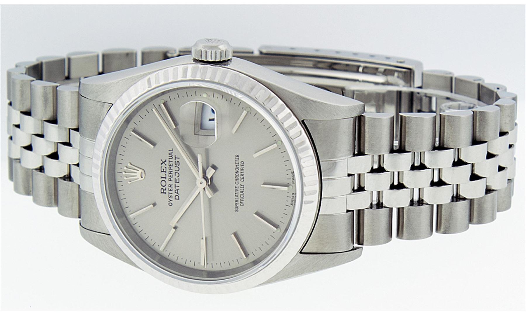 One Gents Rolex Stainless Steel Datejust Polished Bright with Satin Finish, Serviced & Electronically Tested, Stainless Steel Case: 36mm, Stainless Steel Crown, Bezel: Stainless Steel Smooth Bezel. Crystal: Synthetic Sapphire Cyclops Lens. Movement: Automatic Winding Movement Caliber 3\135. Custom Dial: Slate Grey Index With Line Track And Lumi Dot. Date Window: 3 O'Clock Position Date Display, Quickset, Model: Quickset Datejust. Condition: G-6 Extra Fine. Bracelet: Stainless Steel Oyster Band. Bright Polish & Satin Finish. 7.0 Inch Length, Adjustable. Standard Clasp, With Rolex Logo.