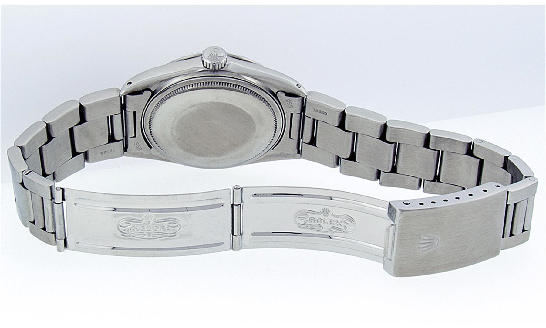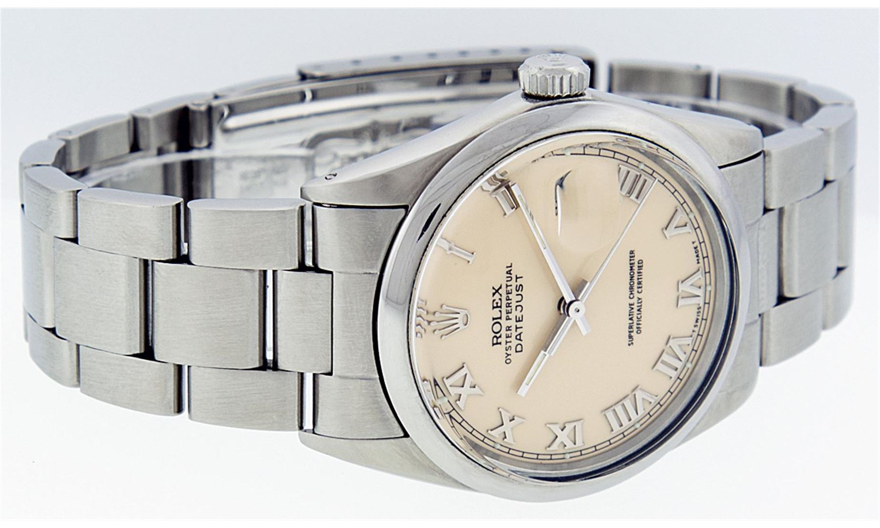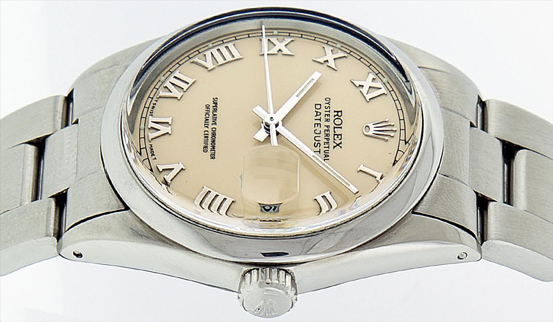 One Gents Rolex Stainless Steel Datejust Polished Bright with Satin Finish, Serviced & Electronically Tested, Stainless Steel Case: 36mm, Stainless Steel Crown, Bezel: Stainless Steel Smooth Bezel. Crystal: Synthetic Sapphire Cyclops Lens. Movement: Automatic Winding Movement Caliber 3135. Dial: Cream Roman Dial. Date Window: 3 O'Clock Position Date Display, Quickset, Model: Datejust. Condition: G-6 Extra Fine. Bracelet: Stainless Steel Oyster Band. Bright Polish & Satin Finish. 7.0 Inch Length, Adjustable. Standard Clasp, With Rolex Logo.