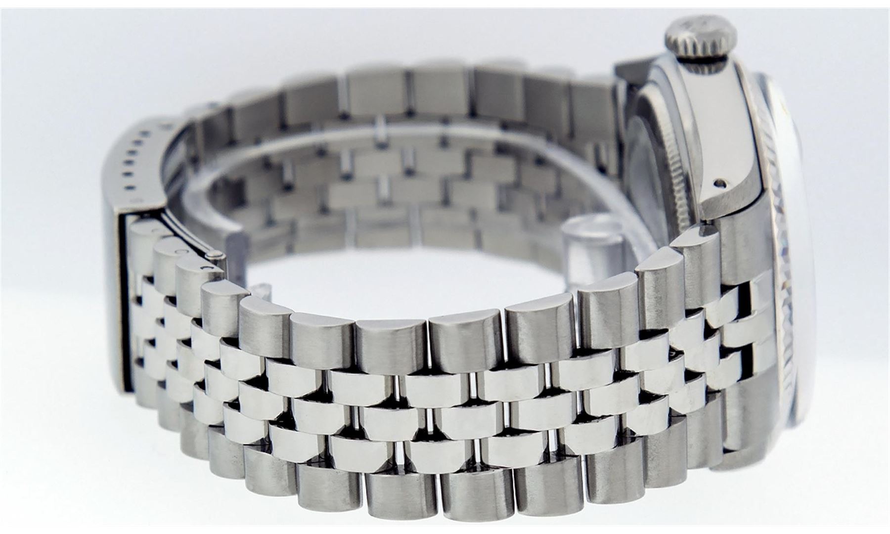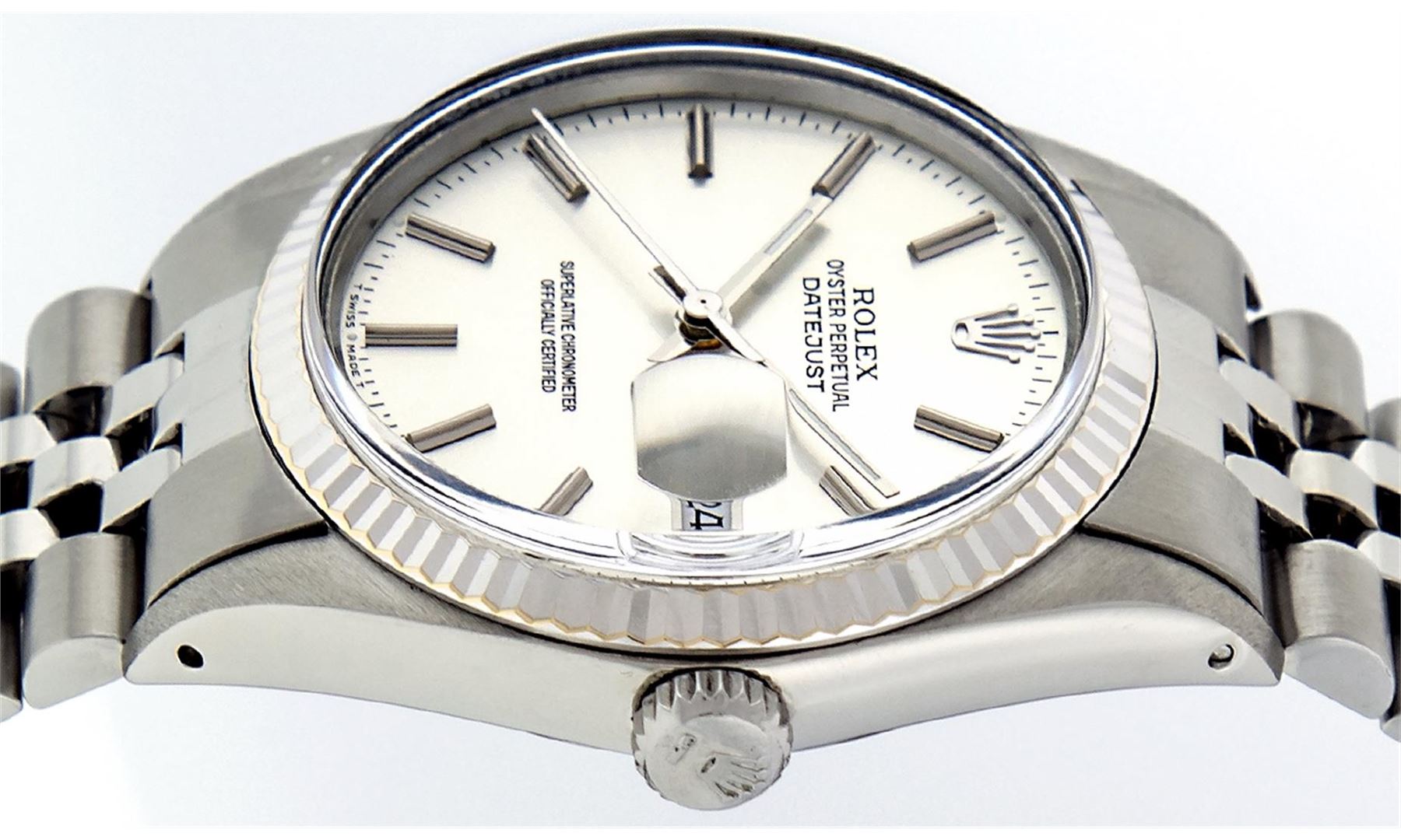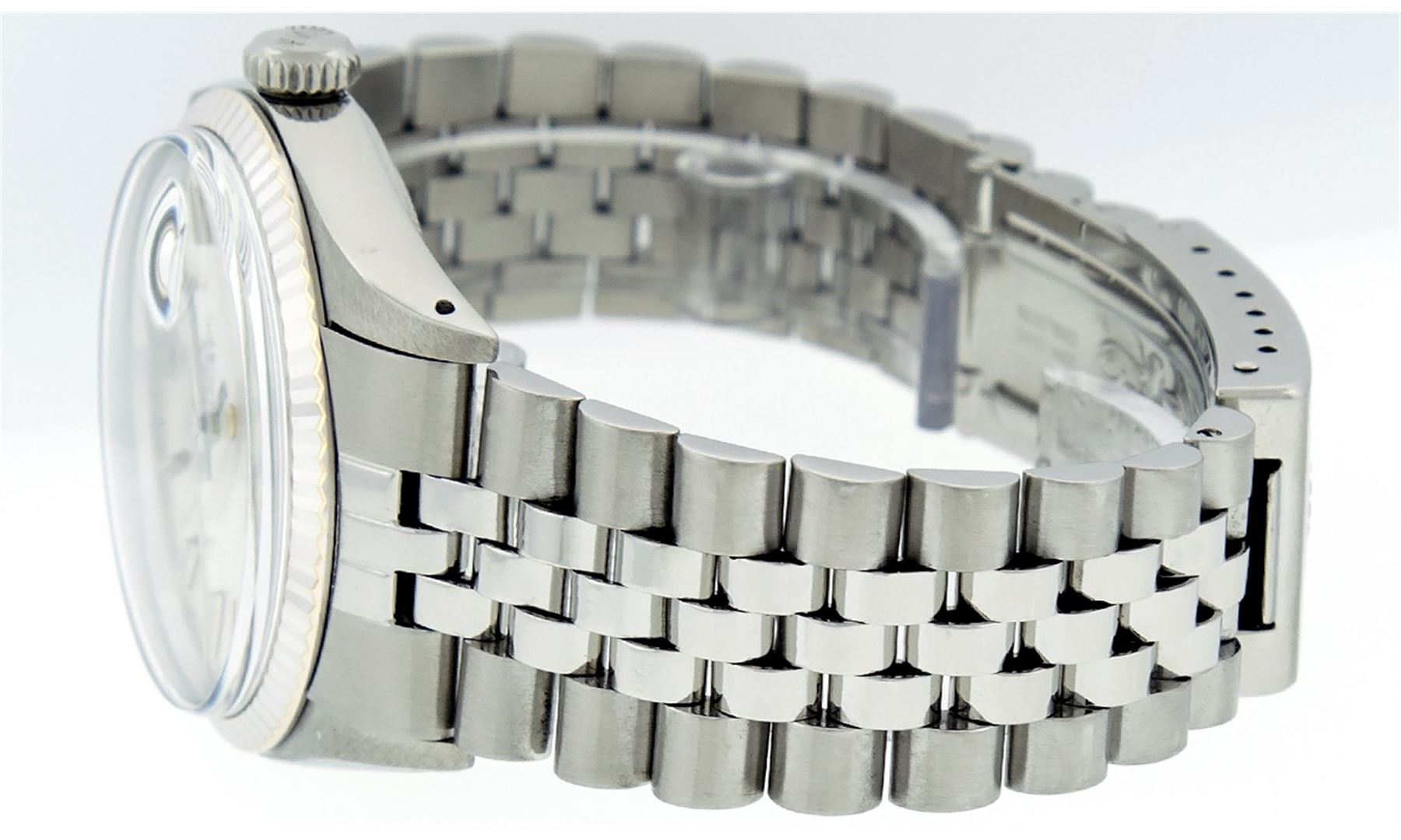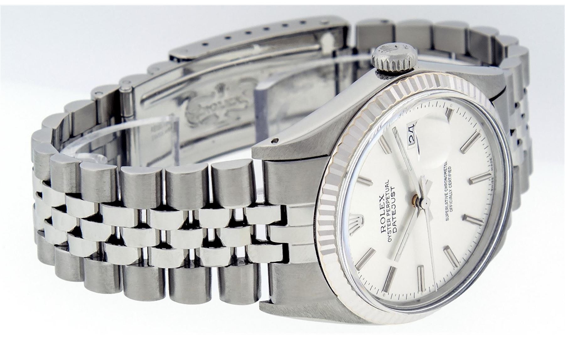 One Mens Rolex Datejust Polished, Serviced & Electronically Tested, Stainless Steel Case:36mm, Stainless Steel Crown, Bezel: 14K White Gold Fluted Bezel. Custom Crystal: Acrylic Cyclops Lens. Movement: Automatic Winding Movement Caliber 3035. Custom Dial: Slate Grey Index With Lumi Dots and Line Track. Date Window: 3 O'Clock Position Date Display, Quickset, Model: Datejust Condition: G-6 Extra Fine The Watch Is In Very Good Condition Free Of All Scratches And Dents. Bracelet: Stainless Steel Jubilee. Bright Polish & Satin Finish. 7 Inch Length, Adjustable. Standard Clasp, With Rolex Logo.