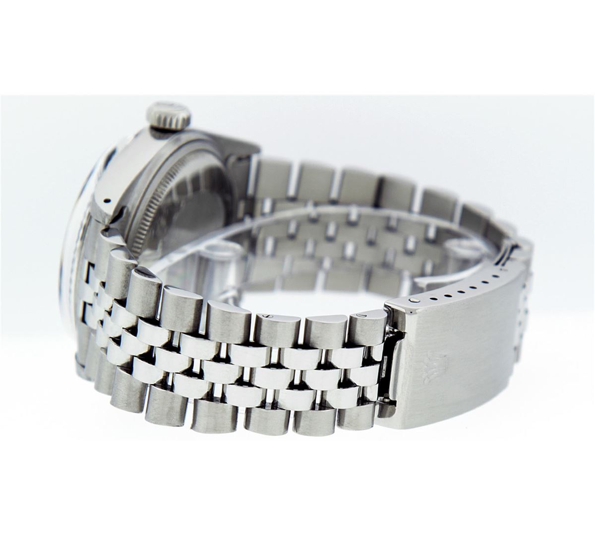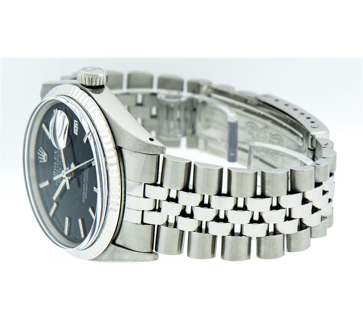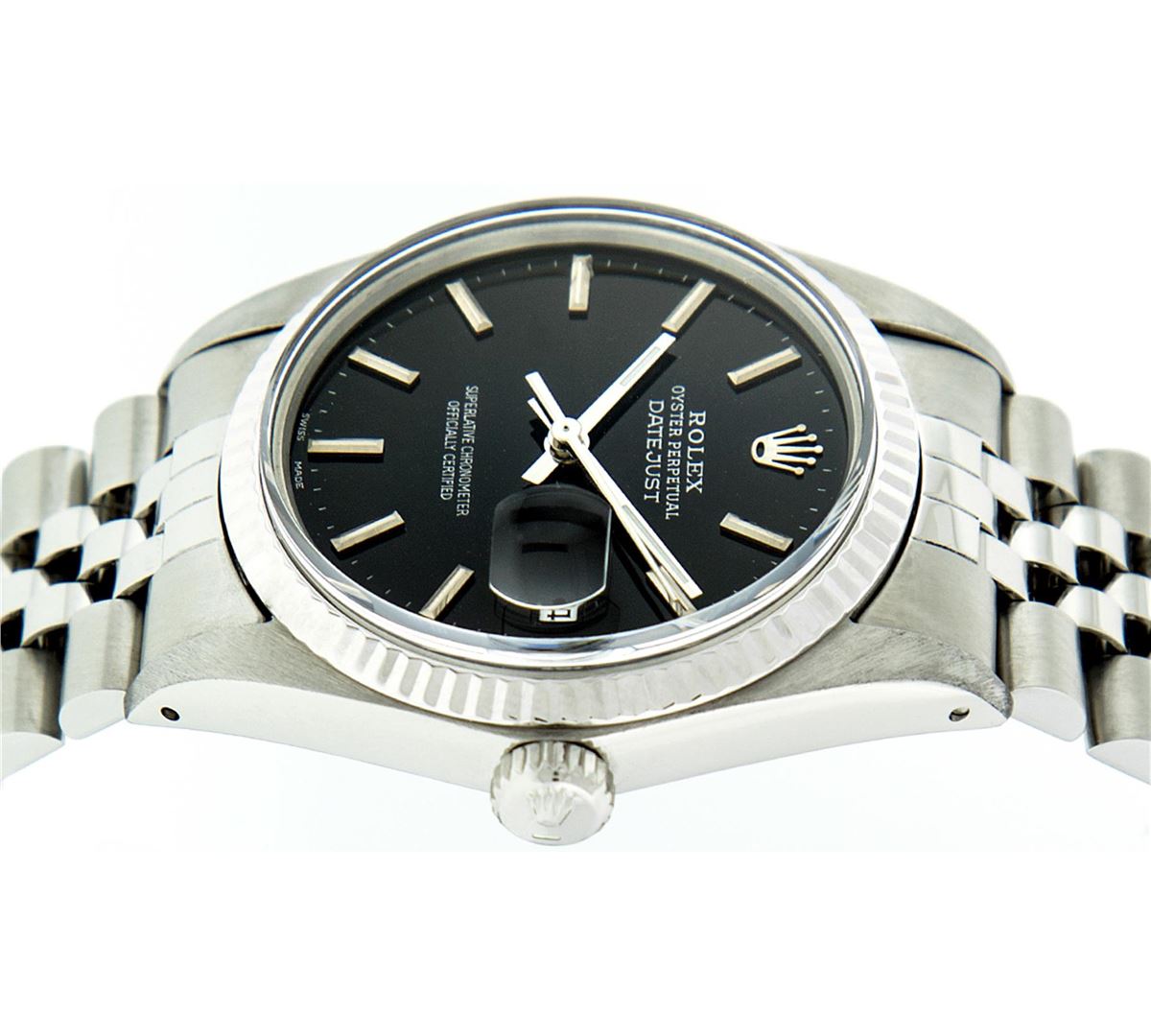 One Gents Rolex Datejust Polished, Serviced & Electronically Tested, Stainless Steel Case:36mm, Stainless Steel Crown, Bezel: 14K White Gold Fluted Bezel. Custom Crystal: Acrylic Cyclops Lens. Movement: Automatic Winding Movement Caliber 3035. Custom Dial: Black Dial With Index Hour Markers With Line Track. Date Window: 3 O'Clock Position Date Display, Quickset, Model: Datejust, Condition: G-6 Extra Fine. Bracelet: Stainless Steel Jubilee. Bright Polish & Satin Finish. 7.0 Inch Length, Adjustable. Standard Clasp, With Rolex Logo.