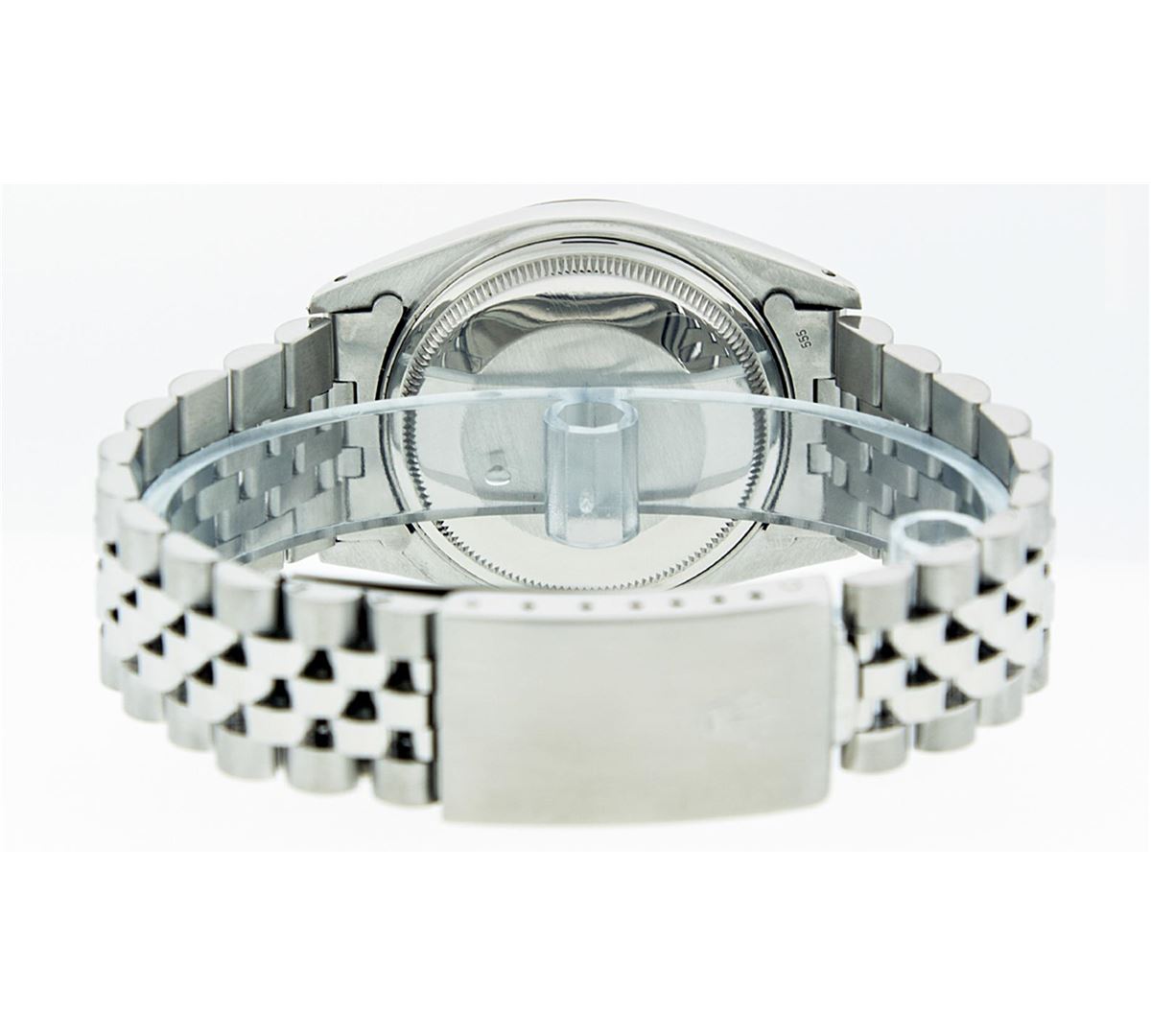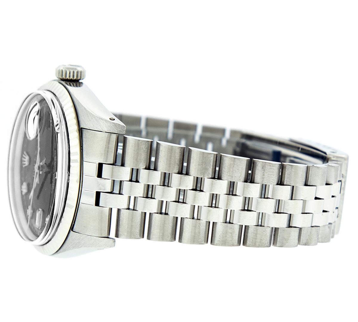 One Mens Rolex Datejust Polished, Serviced & Electronically Tested, Stainless Steel Case:36mm, Stainless Steel Crown, Bezel: 18K White Gold Fluted Bezel. Custom Crystal: Acrylic Cyclops Lens. Movement: Automatic Winding Movement Caliber 3035. Custom Dial: Black With Diamond Hour Markers and Square Roman Track Square Setting, Diamond Count: 8 Diamonds + 2 Baguettes, Clarity: SI-VS, Color: G to H. Date Window: 3 O'Clock Position Date Display, Quickset, Model: Datejust Condition: G-6 Extra Fine. Bracelet: Stainless Steel Jubilee. Bright Polish & Satin Finish. 7.0 Inch Length, Adjustable. Standard Clasp, With Rolex Logo.