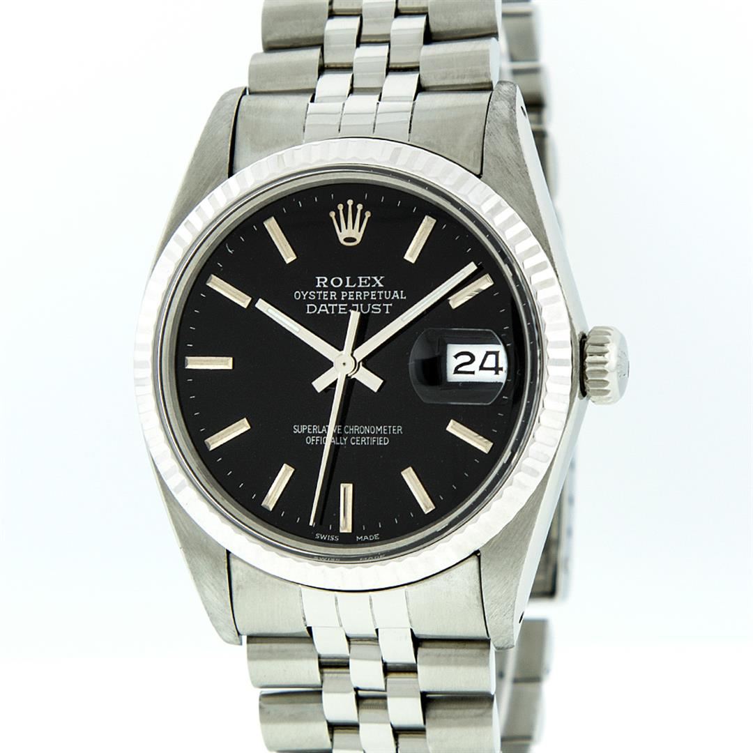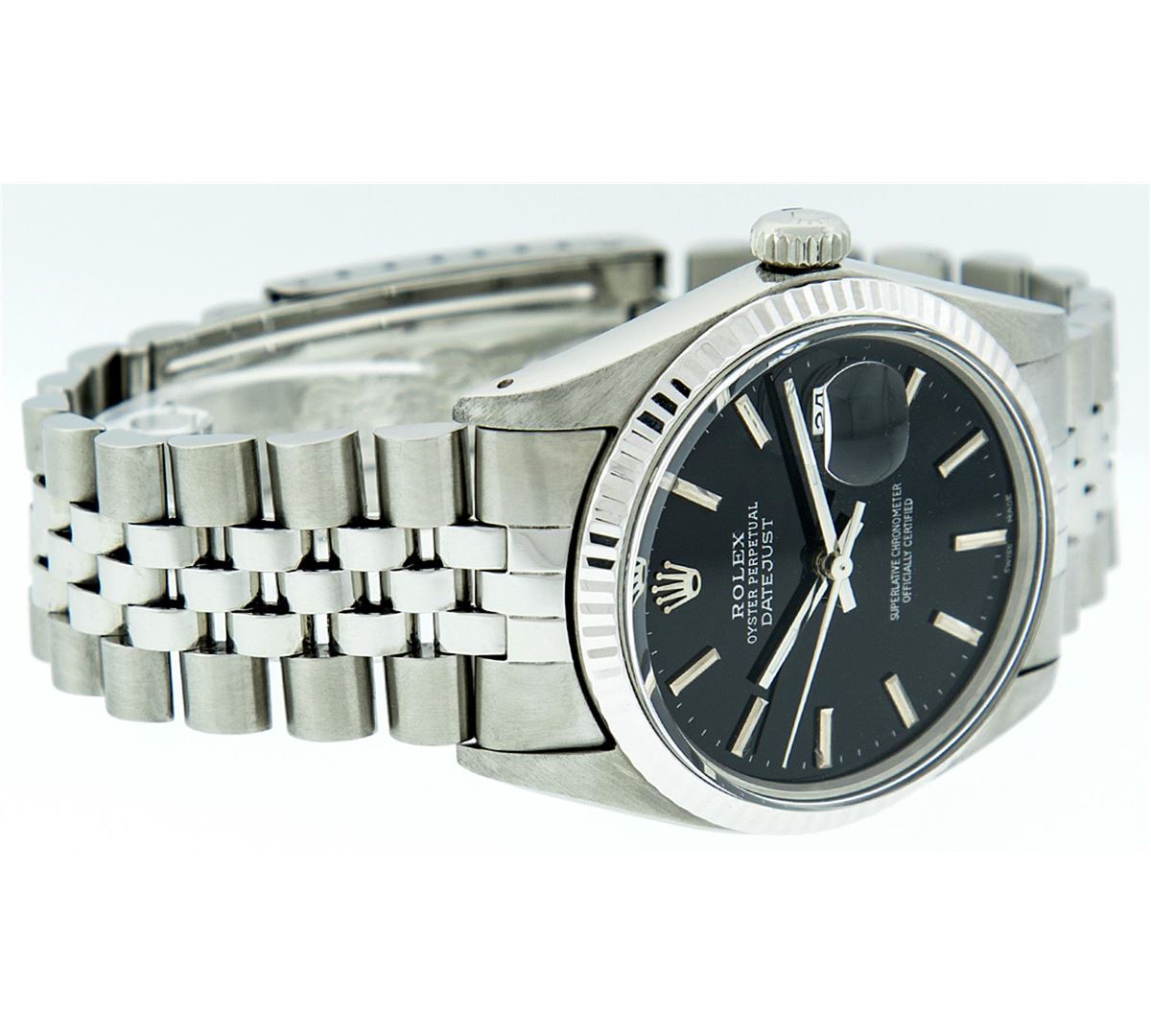 One Gents Rolex Datejust Polished, Serviced & Electronically Tested, Stainless Steel Case:36mm, Stainless Steel Crown, Bezel: 14K White Gold Fluted Bezel. Custom Crystal: Acrylic Cyclops Lens. Movement: Automatic Winding Movement Caliber 3035. Custom Dial: Black Dial With Index Hour Markers With Line Track. Date Window: 3 O'Clock Position Date Display, Quickset, Model: Datejust, Condition: G-6 Extra Fine. Bracelet: Stainless Steel Jubilee. Bright Polish & Satin Finish. 7.0 Inch Length, Adjustable. Standard Clasp, With Rolex Logo.
