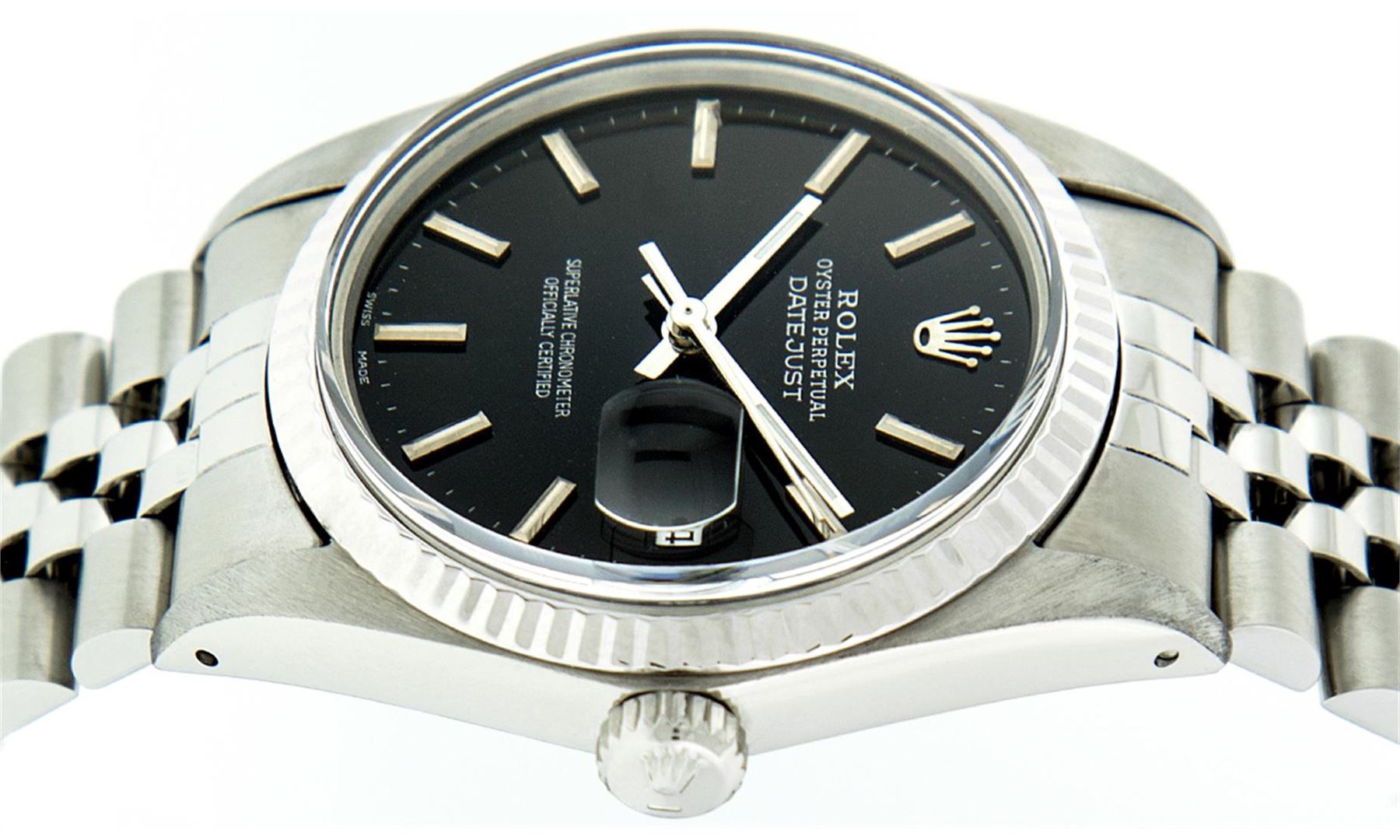 One Gents Rolex Datejust Polished, Serviced & Electronically Tested, Stainless Steel Case:36mm, Stainless Steel Crown, Bezel: 14K White Gold Fluted Bezel. Custom Crystal: Acrylic Cyclops Lens. Movement: Automatic Winding Movement Caliber 3035. Custom Dial: Black Dial With Index Hour Markers With Line Track. Date Window: 3 O'Clock Position Date Display, Quickset, Model: Datejust, Condition: G-6 Extra Fine. Bracelet: Stainless Steel Jubilee. Bright Polish & Satin Finish. 7.0 Inch Length, Adjustable. Standard Clasp, With Rolex Logo.