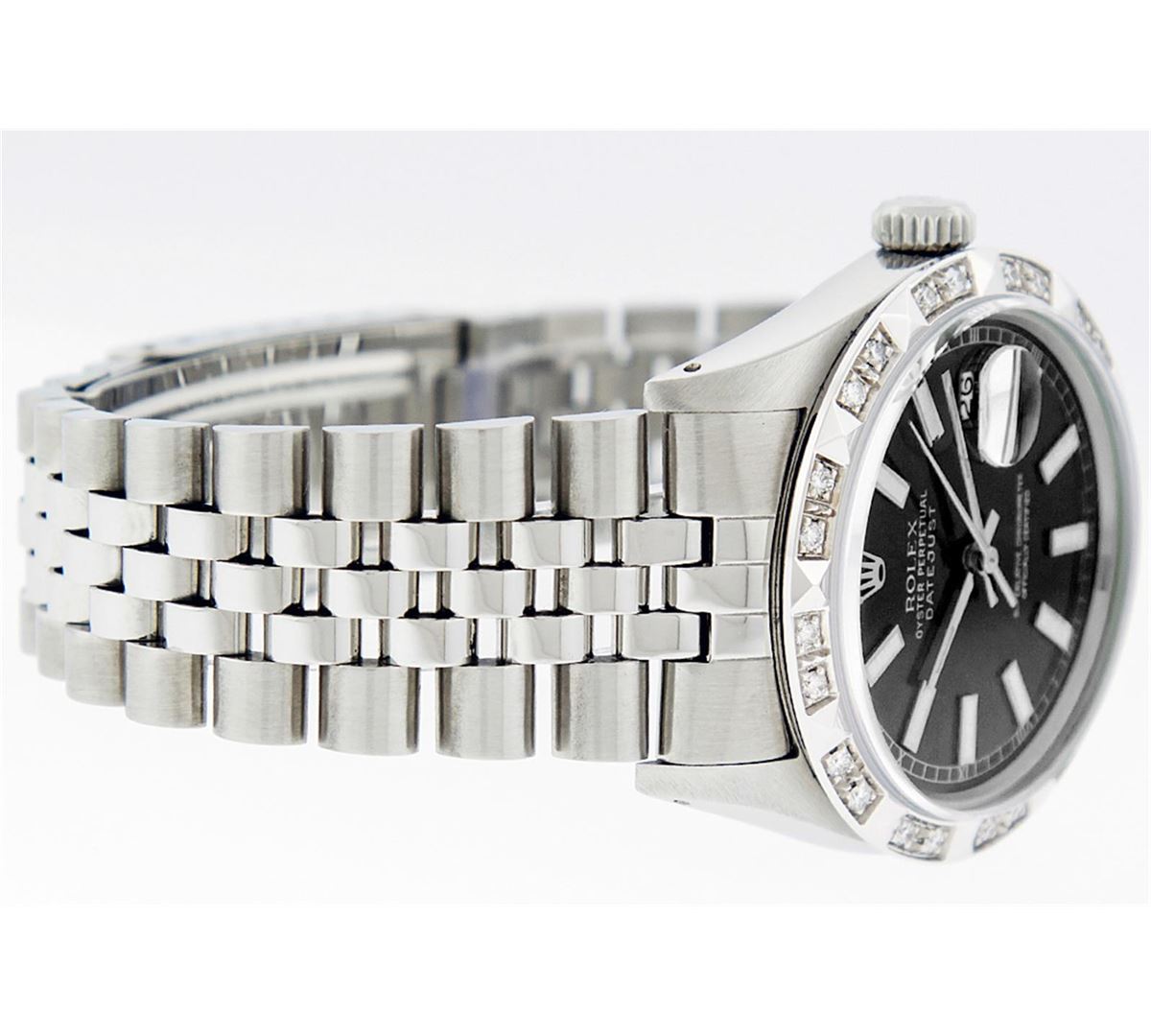 One Mens Rolex Datejust Polished Bright with Satin Finish, Serviced & Electronically Tested, Stainless Steel Case:36mm, Stainless Steel Crown, Custom Bezel:18K White Gold Pyramid Diamond Bezel, Diamond Count: 24 Diamonds Total Weight .70 Carat, Clarity: SI-VS, Color: G to H. Custom Crystal: Synthetic Sapphire Cyclops Lens. Movement: Automatic Winding Movement Caliber 3035. Custom Dial: Black Index Dial With Square Roman Track. Date Window: 3 O'Clock Position Date Display, Quickset, Model: Datejust. Condition: G-6 Extra Fine. Bracelet:Stainless Steel Jubilee. Bright Polish & Satin Finish. 7.0 Inch Length, Adjustable. Standard Clasp, With Rolex Logo.
