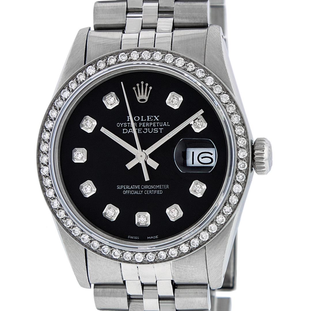 One 36MM Pre Owned Rolex Stainless Steel Datejust Polished Bright with Satin Finish, This Watch Has Been Serviced & Electronically Tested, Rolex Stainless Steel Case: 36mm, Rolex Stainless Steel Crown, Custom Bezel: New Stainless Steel Beadset Diamond Bezel, Diamond Count: 54 Diamonds On Bezel. Custom Crystal: New Sapphire With Date Window. Custom Hands: New Luminescent Hands. Rolex Movement: Automatic Winding Movement 3035. Custom Dial: Custom Black Dial With Added Diamonds, Diamond Count: 10 Diamonds On Dial. Date Window: 3 O'Clock Position Date Display, Quickset, Model: Datejust. Condition: G-6 Extra Fine. Rolex Bracelet: Stainless Steel Jubilee Band. Bright Polish & Satin Finish. 7.0 Inch Length, Adjustable. Fold Clasp, With Rolex Logo. This Watch Has Been Serviced Time Tested And Is In Excellent Condition It Is Free Of All Scratches And Dents.