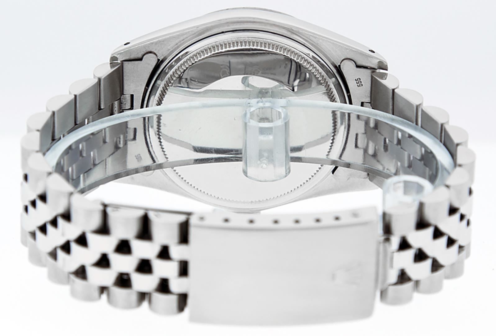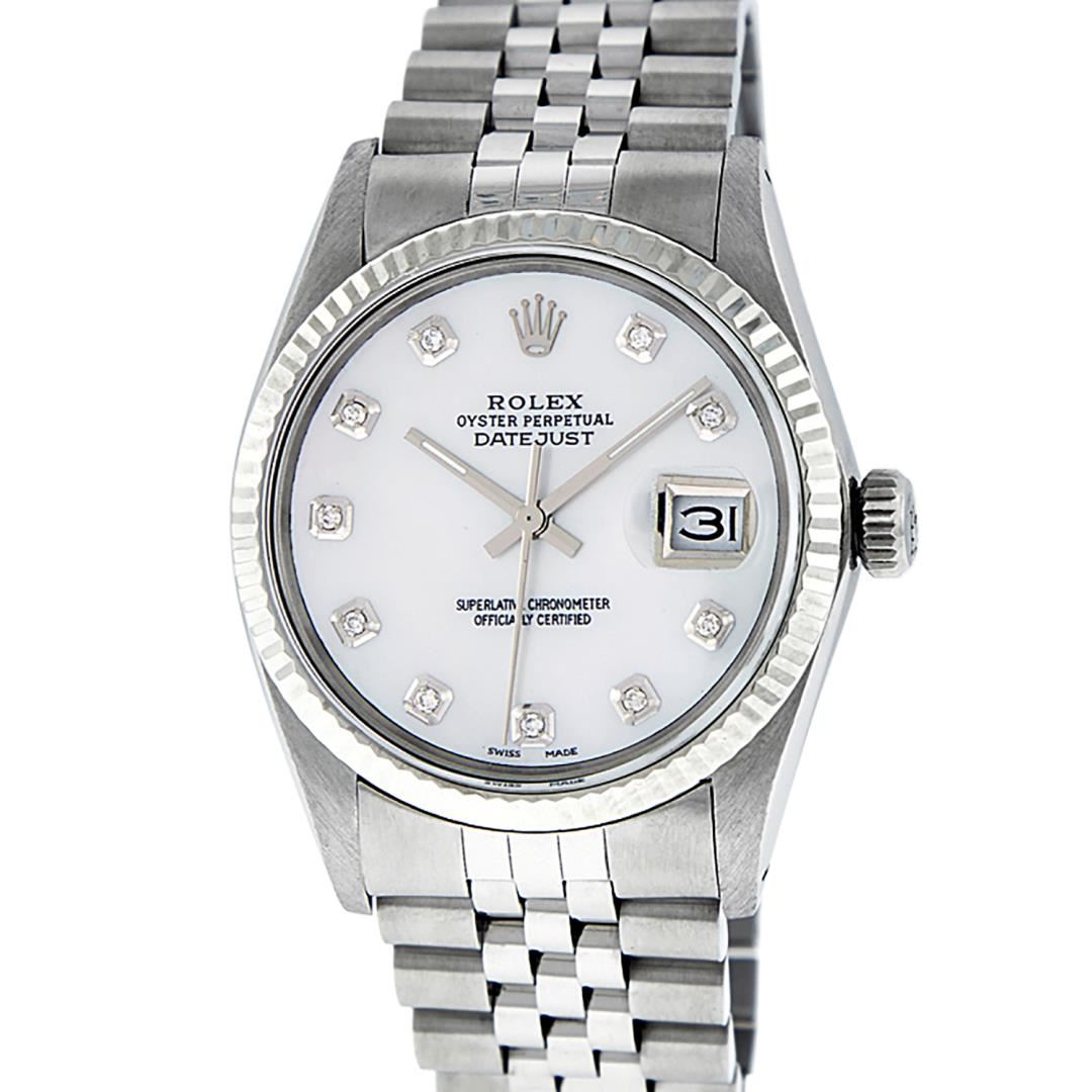 One Mens 36MM Stainless Steel Rolex Datejust Polished Bright with Satin Finish, This Watch Has Been Serviced & Electronically Tested, Rolex Stainless Steel Case: 36mm, Rolex Stainless Steel Crown, Rolex Bezel: 14K White Gold Fluted Bezel. Custom Crystal: New Acrylic With Magnified Date Window. Custom Hands: New Luminescent Hands. Rolex Movement: Automatic Winding Movement 3035. Custom Dial: Custom White Diamond Dial With Added Diamond Hour Markers, Diamond Count: 10 Diamonds On Dial. Date Window: 3 O'Clock Position Date Display, Quickset, Model: Datejust, Condition: G-6 Extra Fine. Rolex Bracelet: Stainless Steel Jubilee Band. Bright Polish & Satin Finish. 7.0 Inch Length, Adjustable. Fold Clasp, With Rolex Logo. This Watch Has Been Serviced Time Tested And Is In Excellent Condition It Is Free Of All Scratches And Dents.